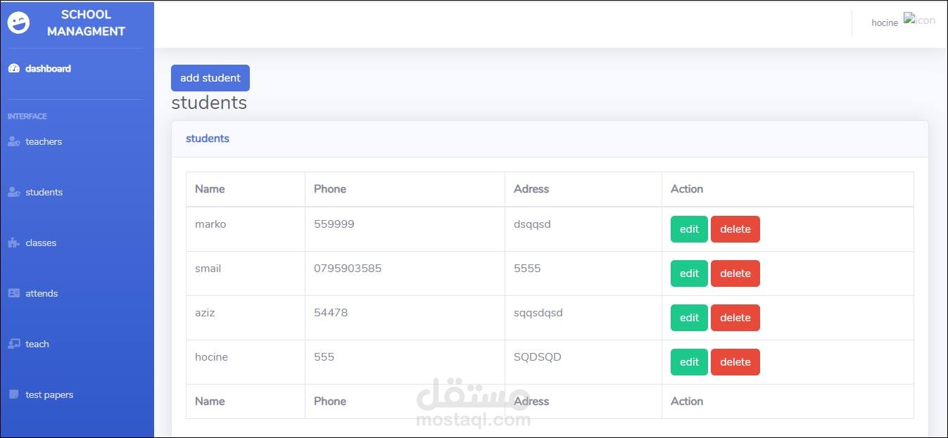 إضافة تحديث وحذف الطالب
