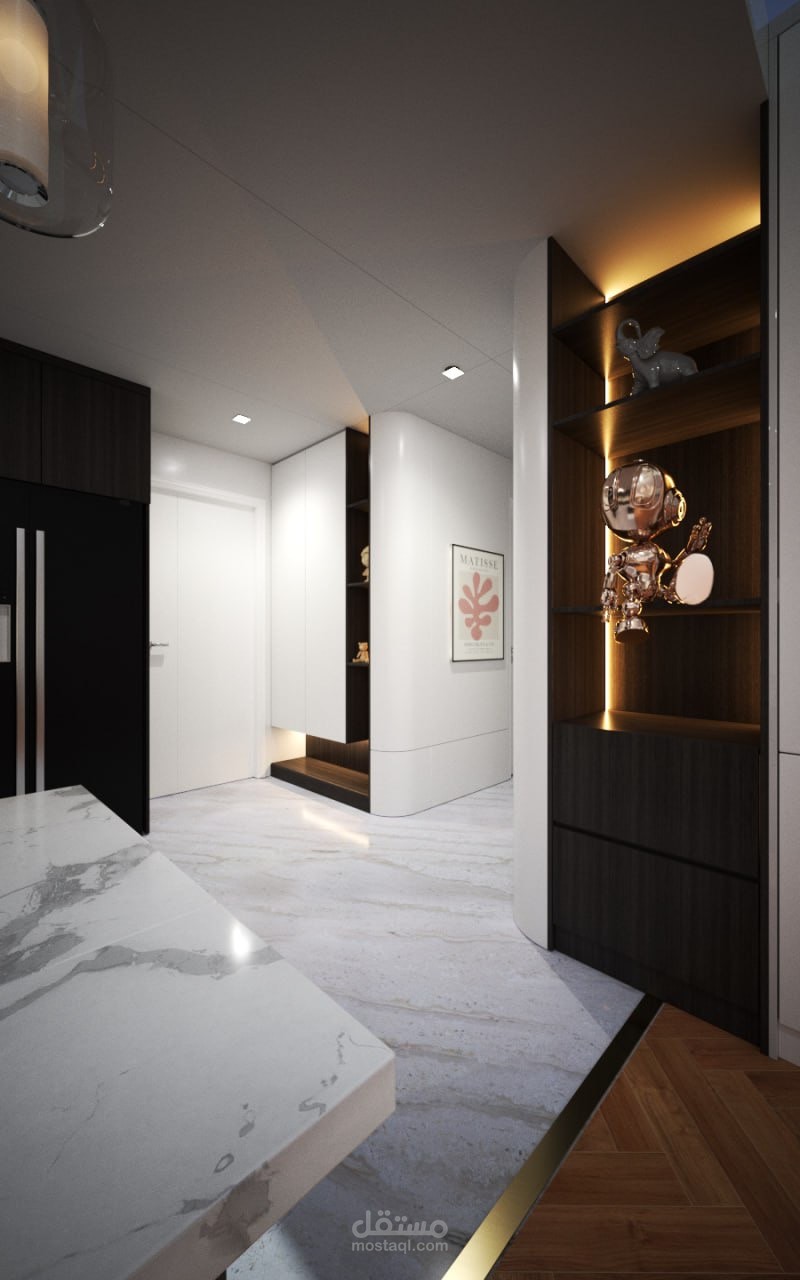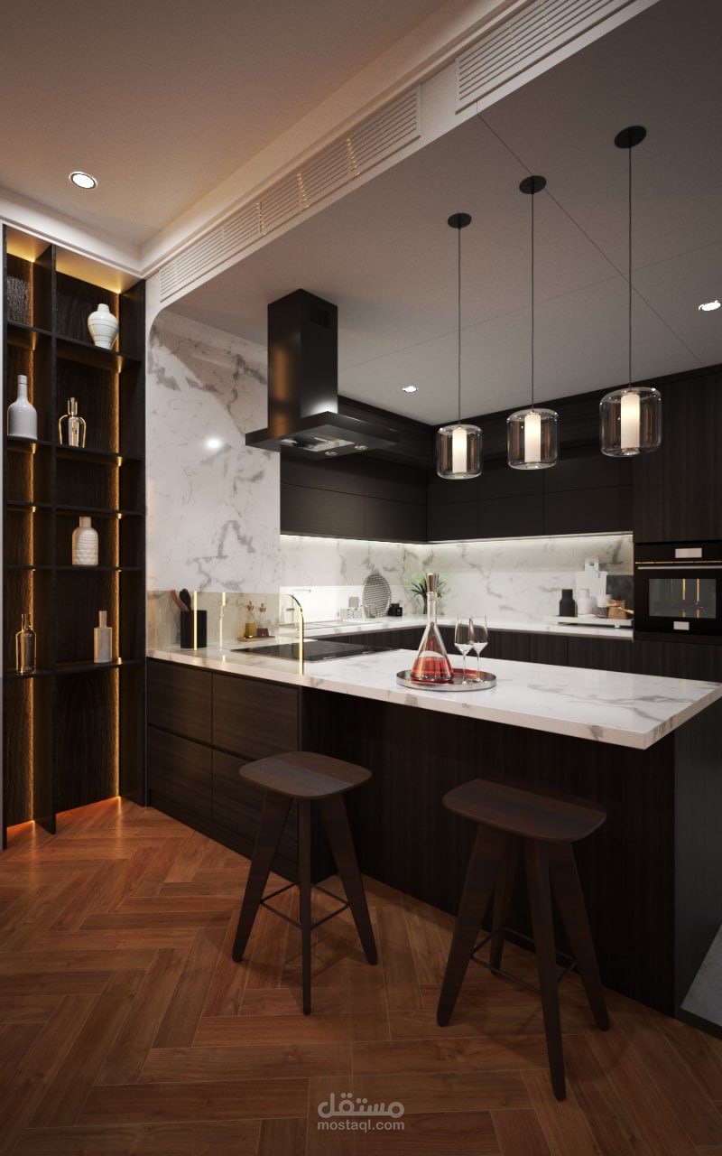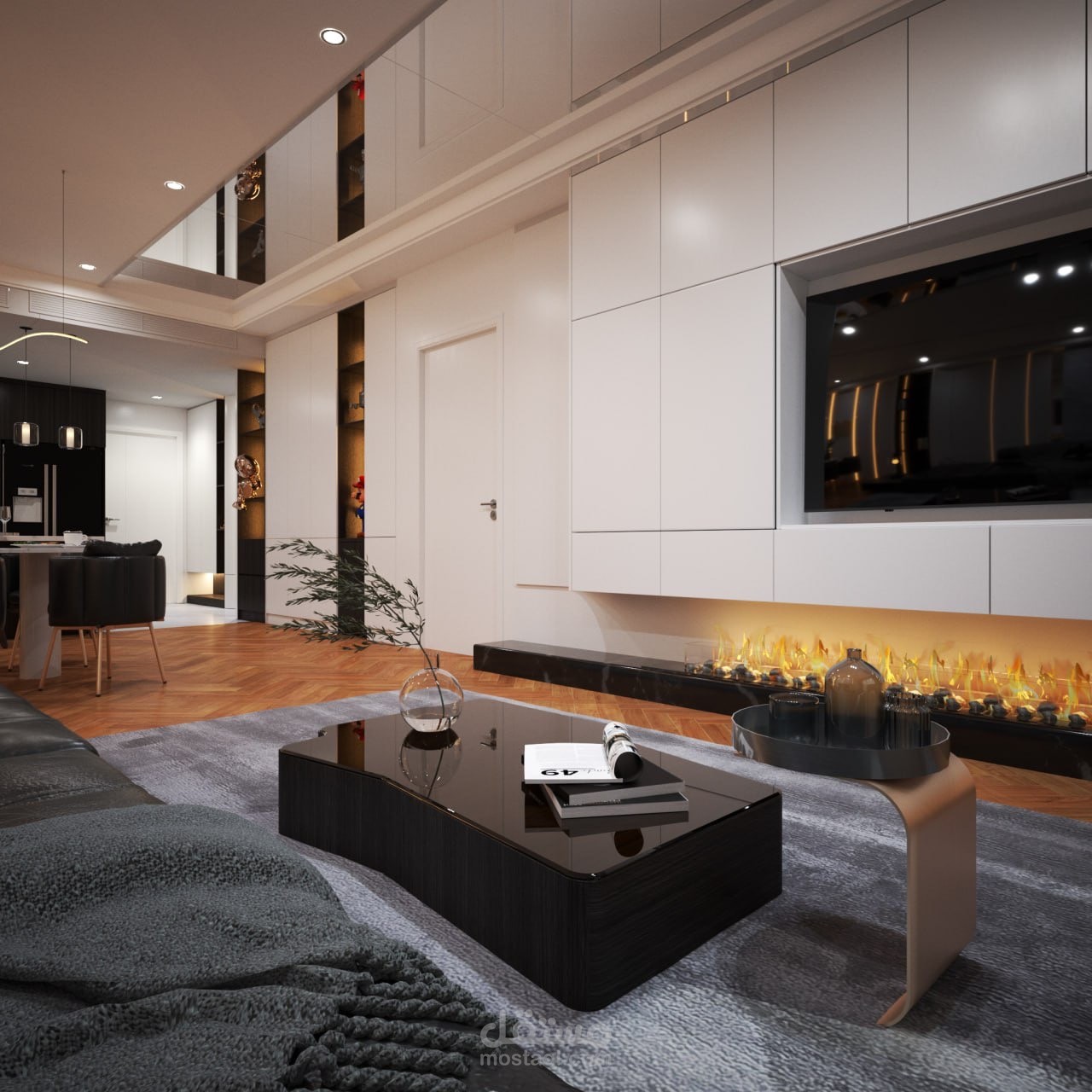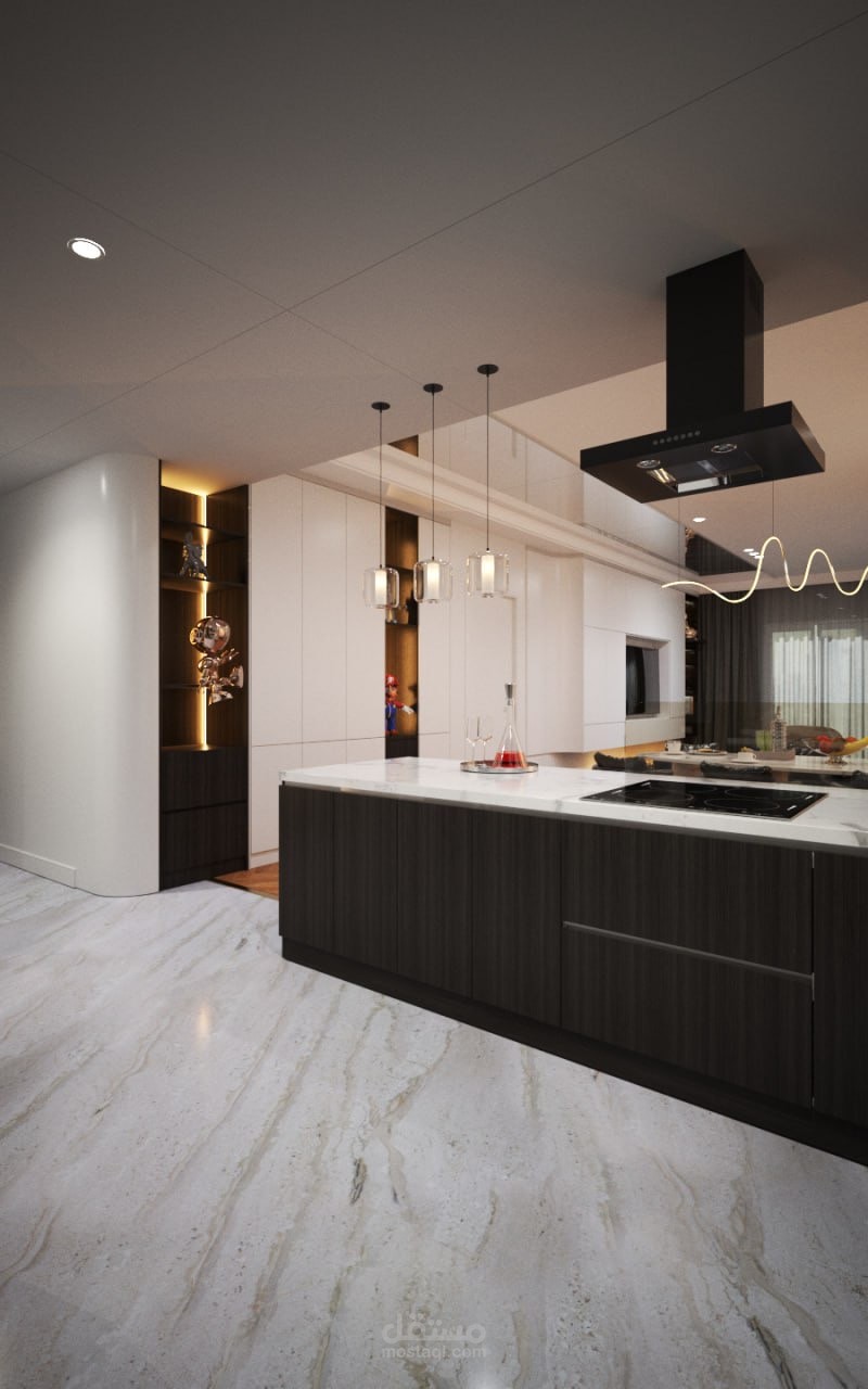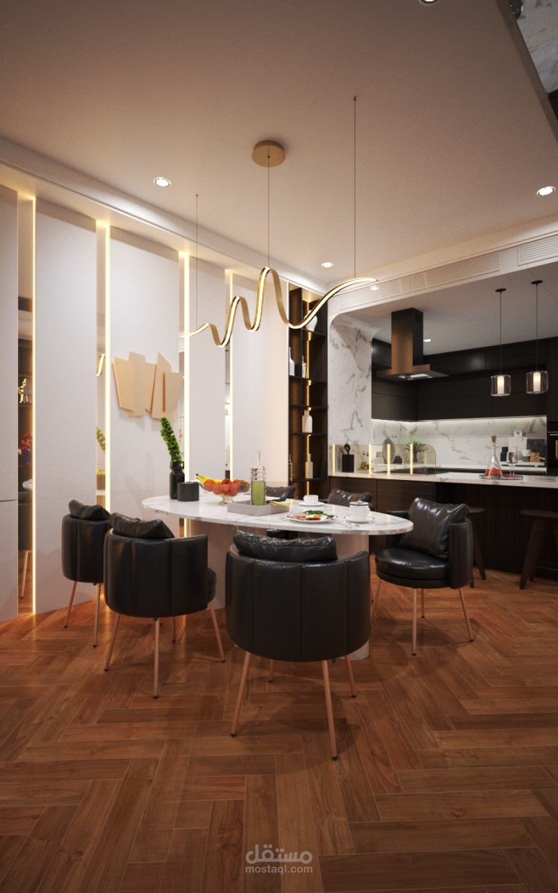 تصميم داخلي لصاله معيشه مع مطبخ مفتوح وطاوله طعام