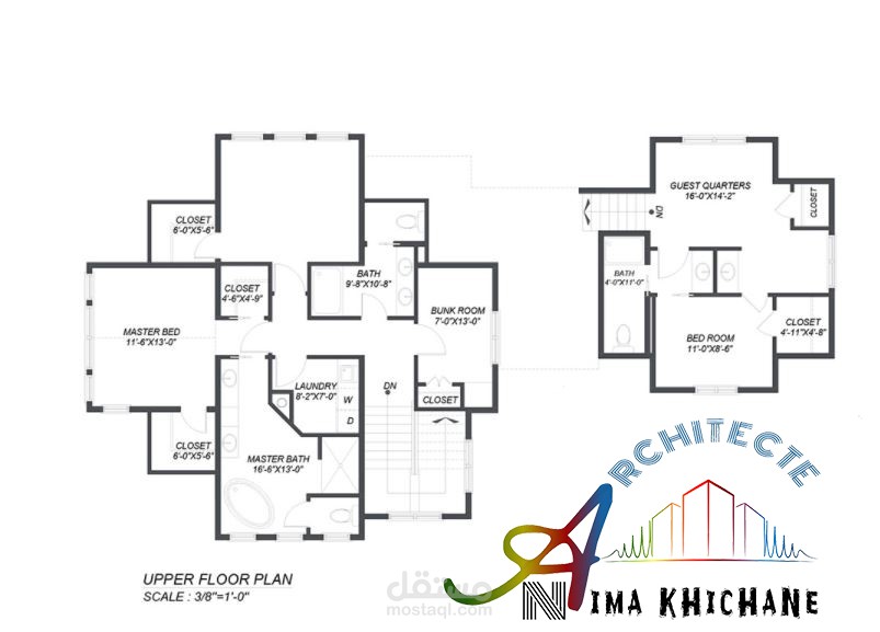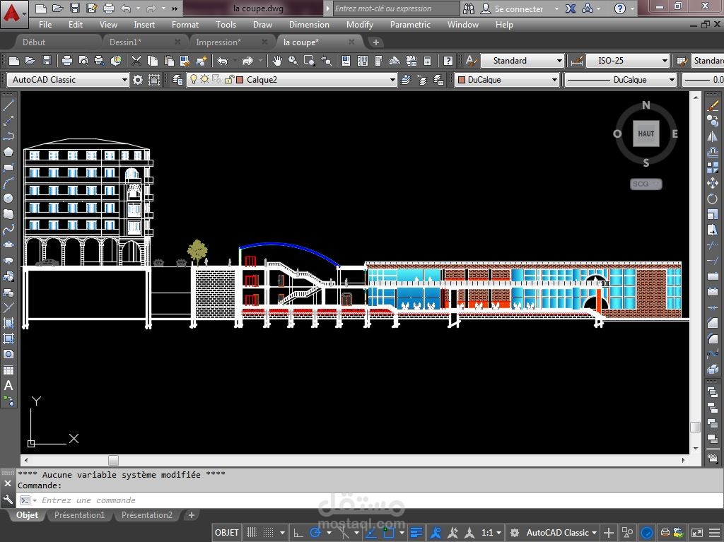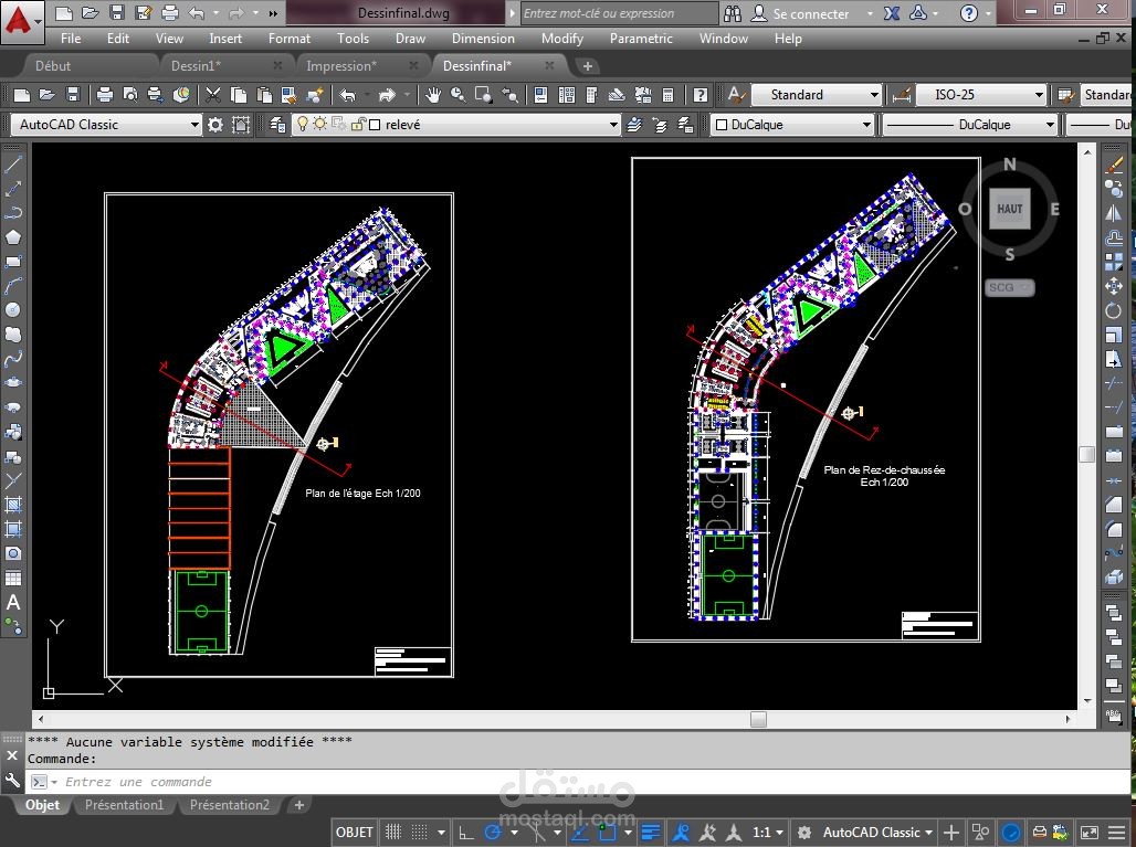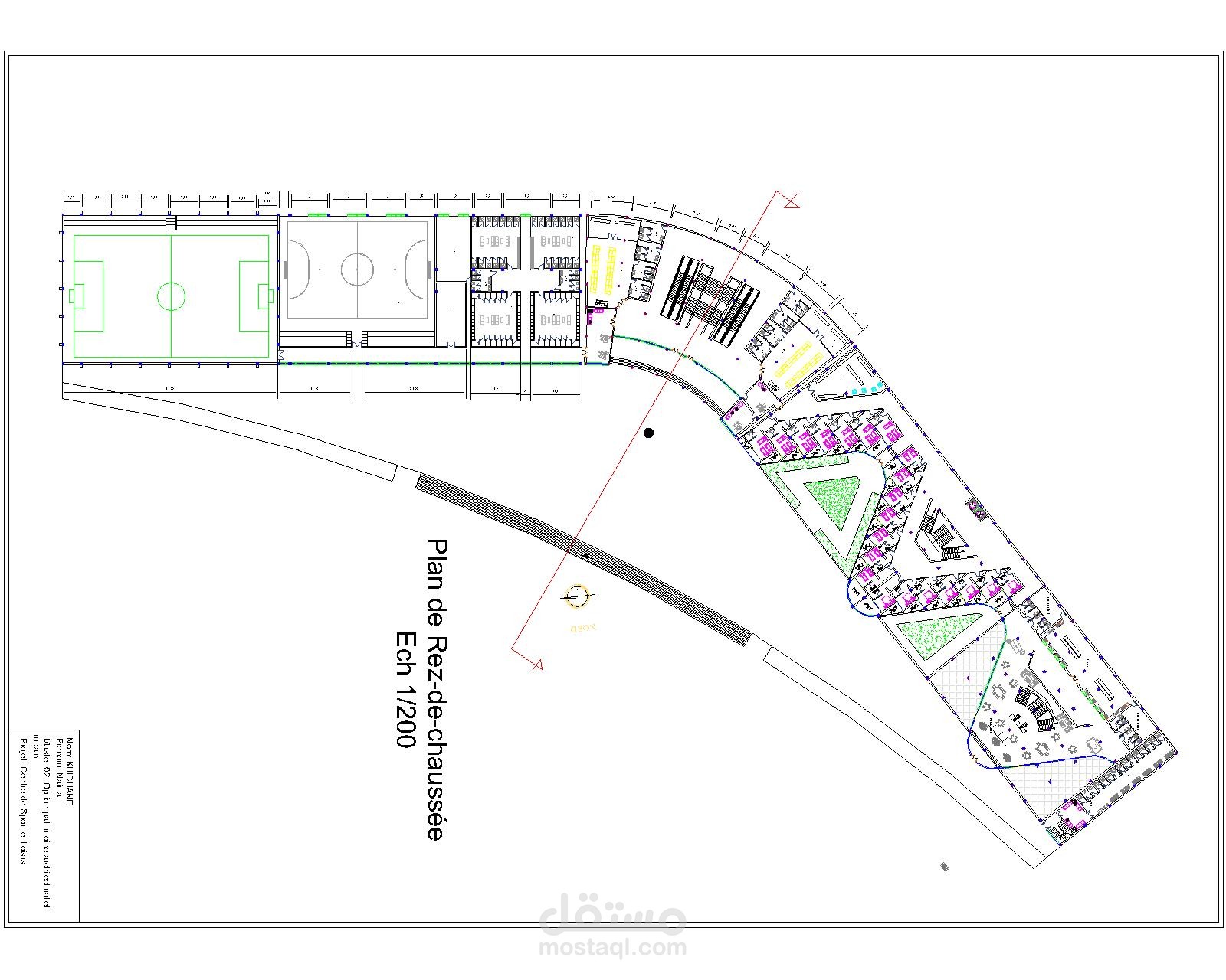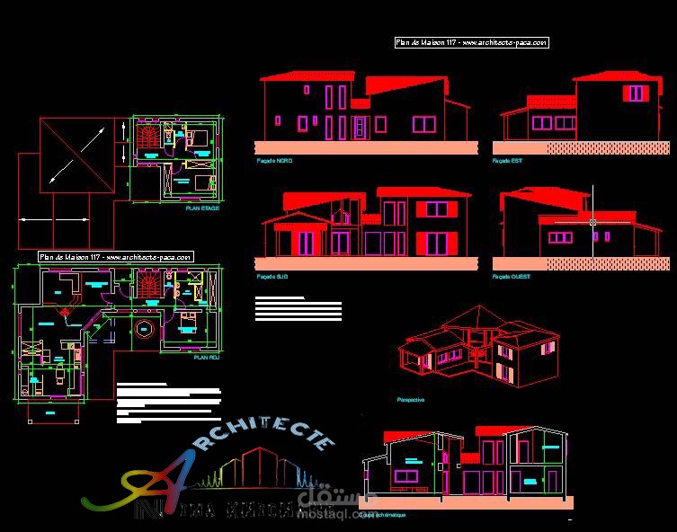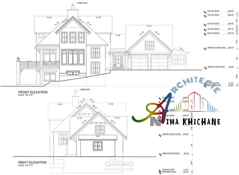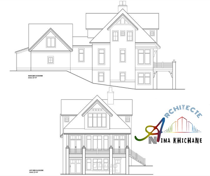 مخطط منزال مع الواجهات والمقاطع الطولية