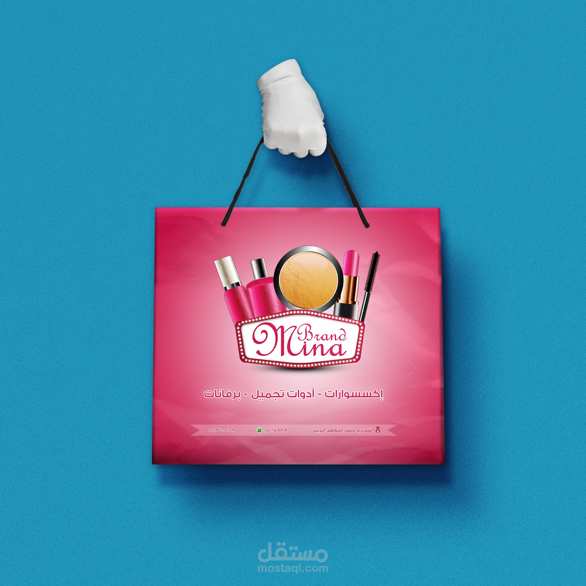 عمل لوجو ( شعار ) وبوستر ( إعلان ) وشنطة لمتجر لبيع الاكسسورات وادوات التجميل