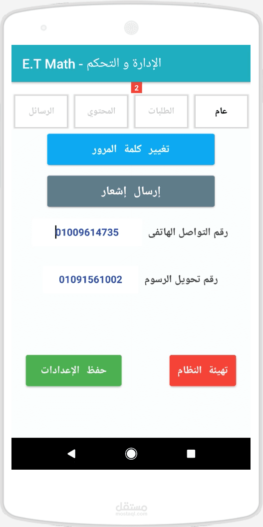 2 - التحكم في الإعدادات العامة و إرسال إشعارات فورية للطلاب وتحديد أرقام التواصل الهاتفية و أرقام التحويلات المالية لتنعكس مباشرة لدي الطلاب .