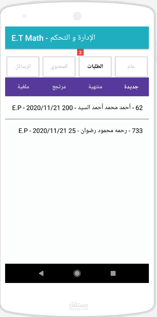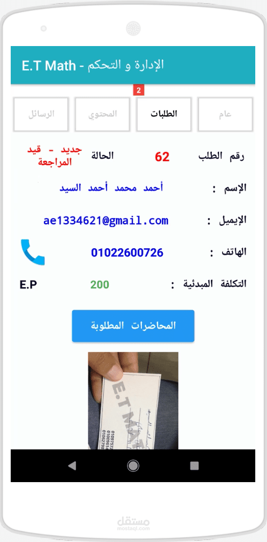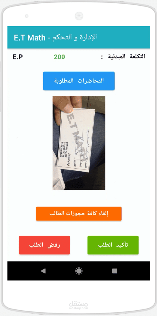 9 - من خلال كل طلب تظهر البيانات التفصيلية للطالب من اسم وبريد الكتروني ورقم هاتف و قيمة الطلب الإجمالية مع صورة تأكيد الدفع وقائمة بالمحتوي المطلوب و يستطيع المعلم تأكيد الطلب أو رفضه بعد التحقق من كافة البيانات .