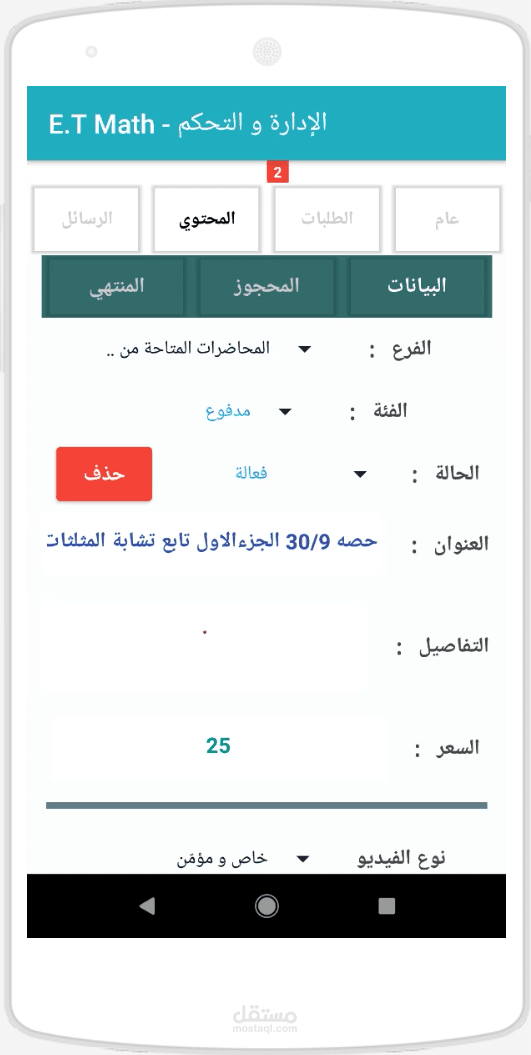 5 - يشمل كل درس أو محاضرة تحديد الاسم و الوصف والحالة و النوع ( مجانية - مدفوعة ) مع تحديد سعر خاص بكل محاضرة أو درس في حالة رغبة الطالب في الحصول عليها بشكل مستقل .