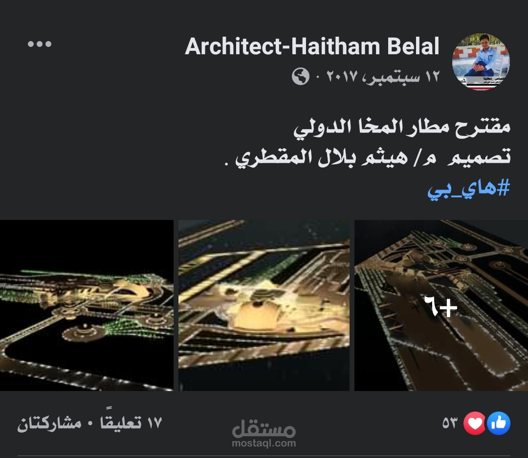 تصاميم المشروع عبارة عن مقترح مطار المخا الدولي التابعة لمحافظة تعز في الجمهورية اليمنية حيث بلغت المساحة لتصميم مشروع المطار بحدود 30,000,000 متر مربع يشمل المشروع مجموعة من المباني والصالات ومول تجاري ومعارض سياحية وعدد ثلاثه مدارج ووالعديد من حاضنات الطائرات ومحطات تغذية بالوقود ومخازن وورش صيانة ومناطق الخضراء.