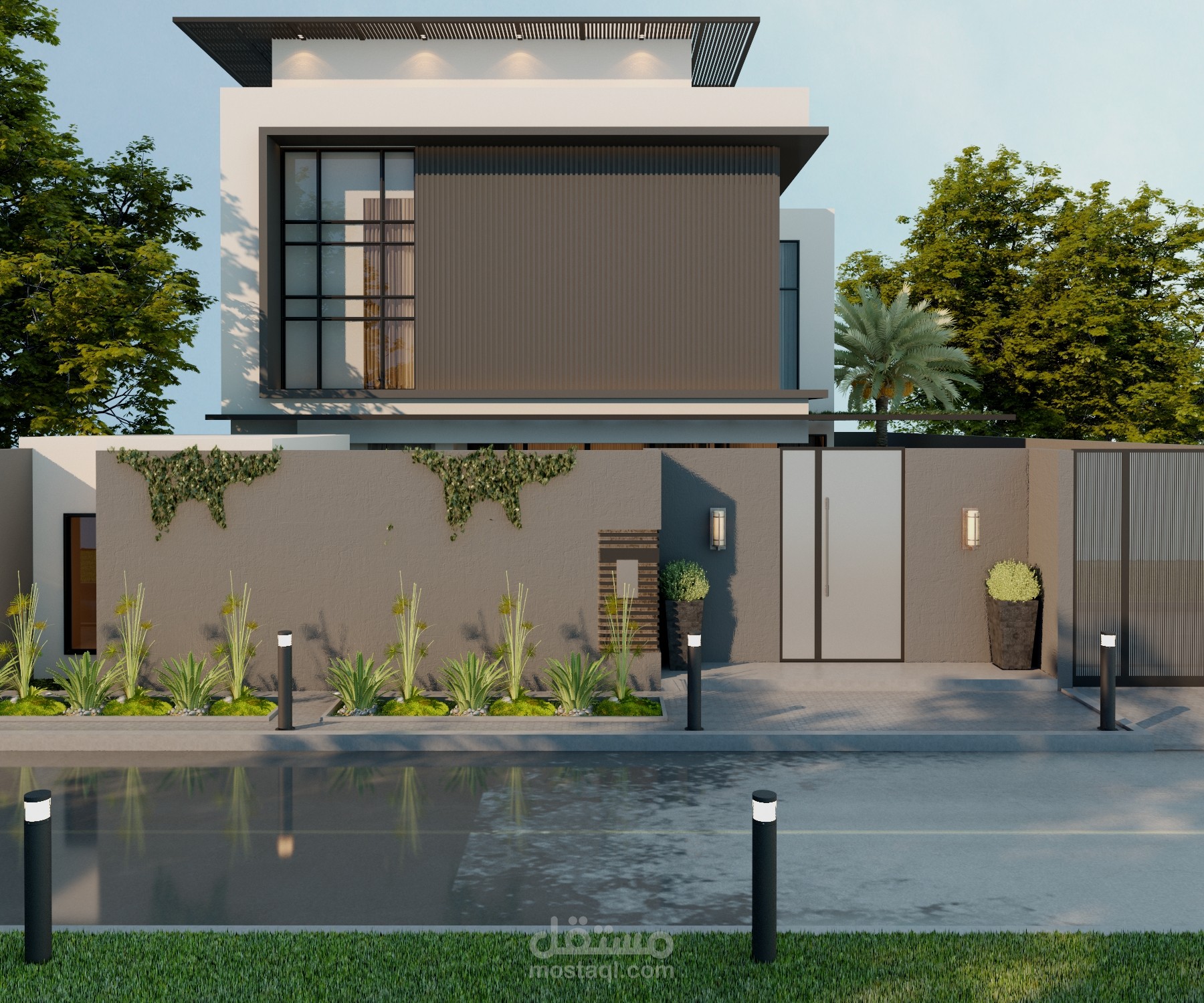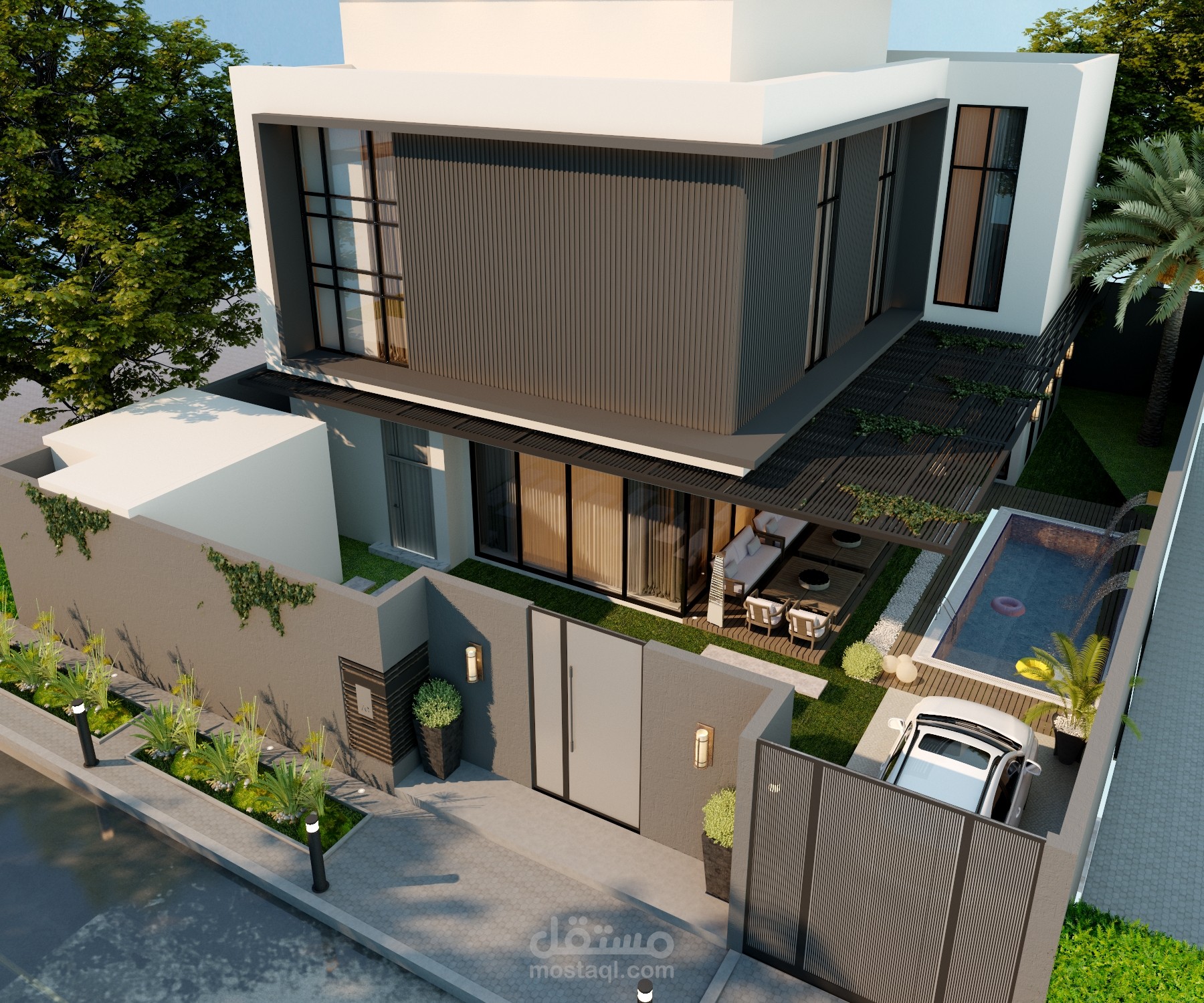 طلب العميل تصميم فيلا مودرن باكتر من مقترح بالواح خشبيه واخر تغير اللون لرمادى
