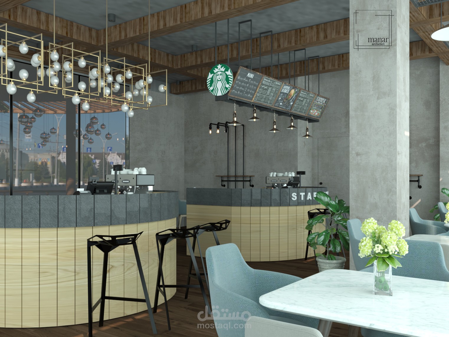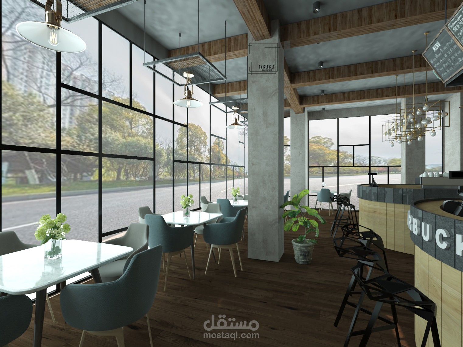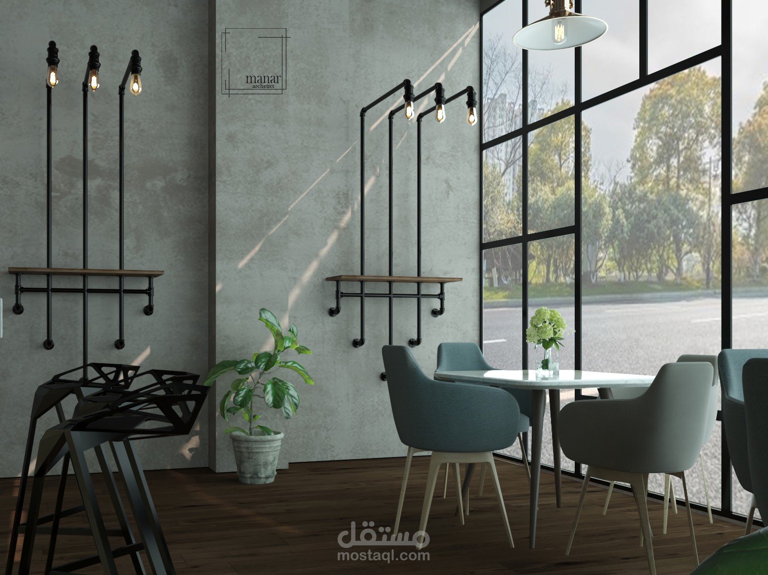 تصميم داخلي لكافيه بالسعودية علي الطراز الindustrial