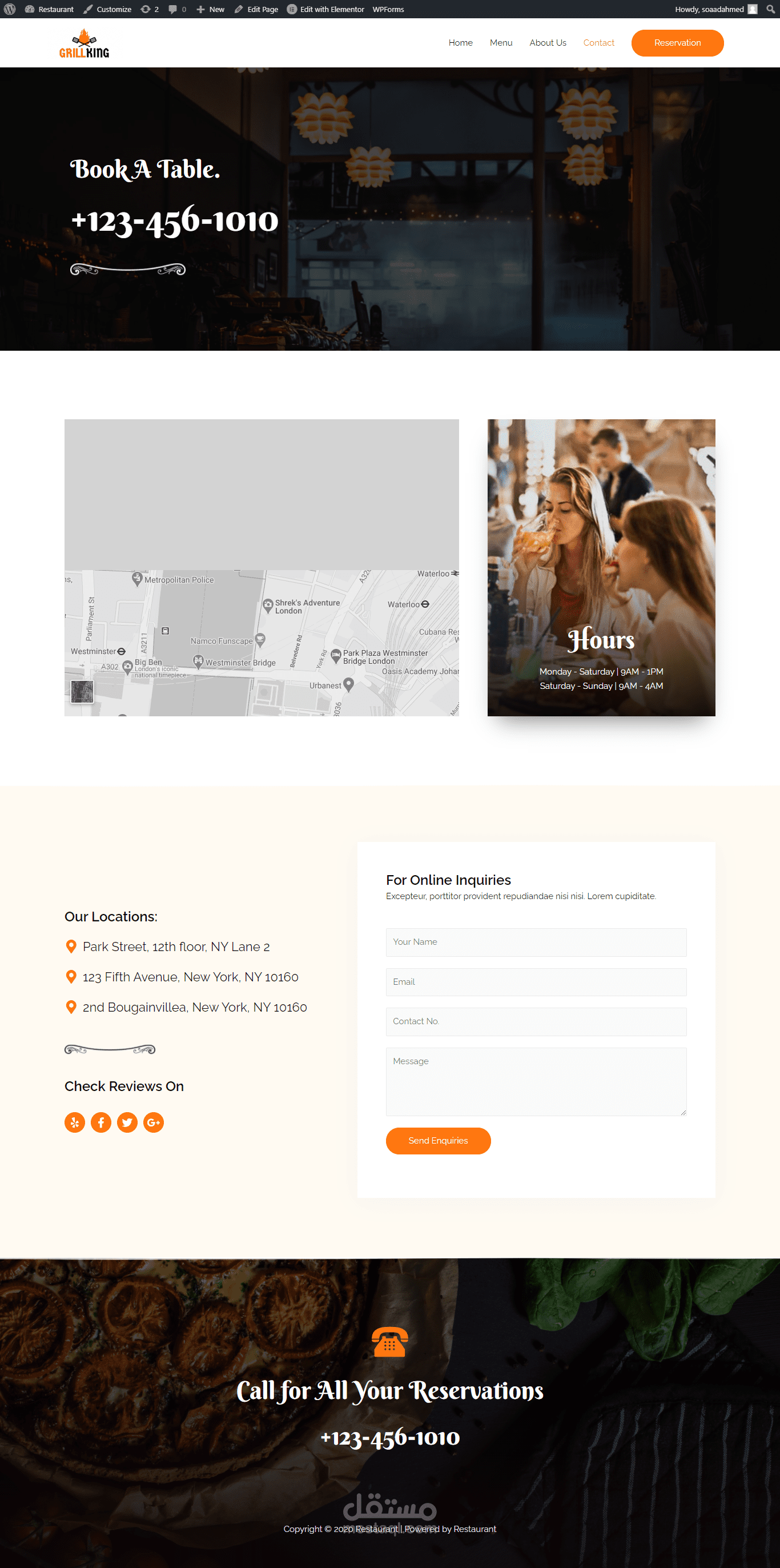 موقع مطعم ووردبريس يحتوي على عرض اشهي الاطعمة والخدمات التى يقدمها الموقع وممكن طلب اى طعام اون لاين ويصل الطلب فى لوحه التحكم مع صحفات اخرى كعرض قائمة الطعام الخاصة بالمطعم , وصفحة للتواصل والحجز