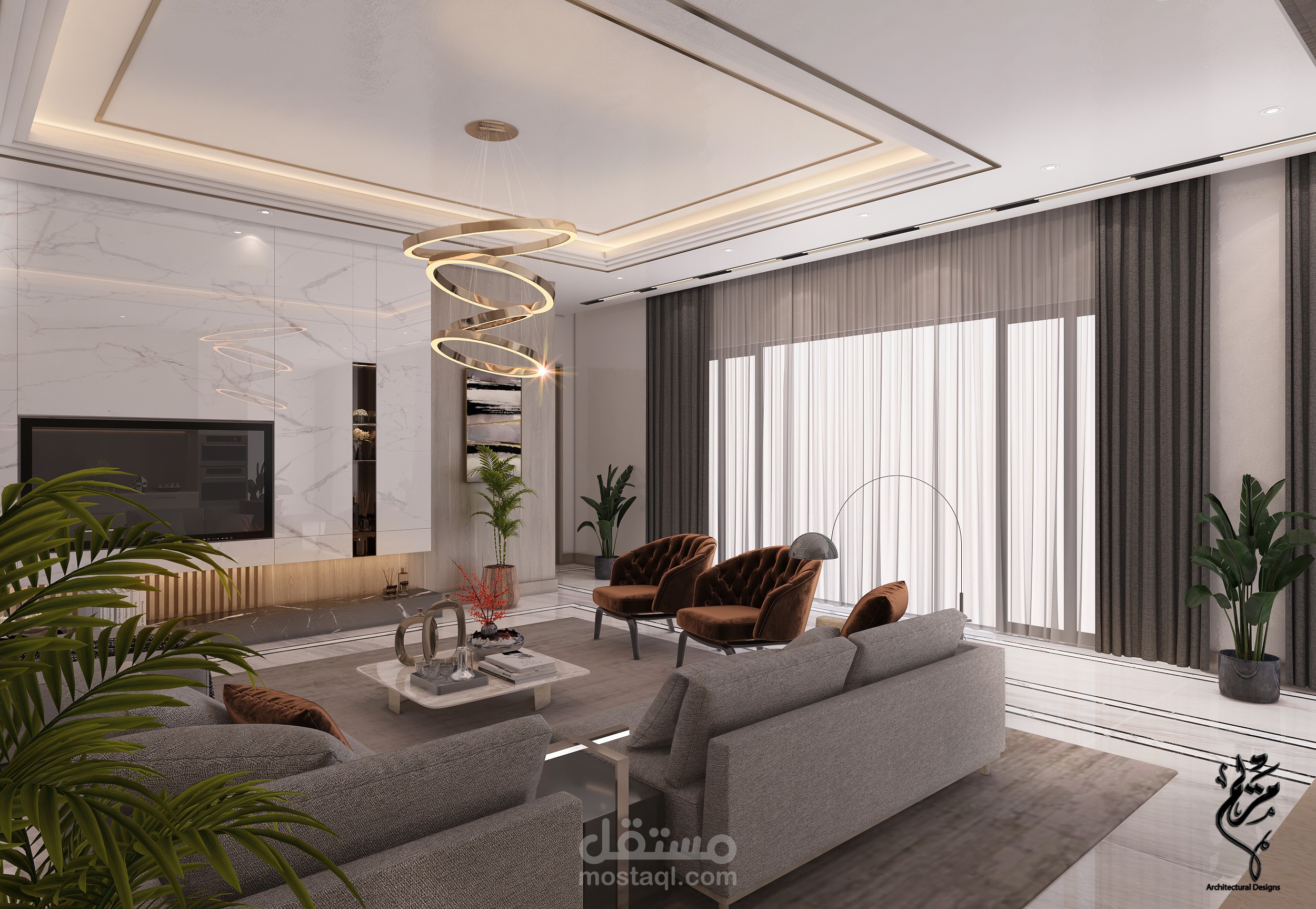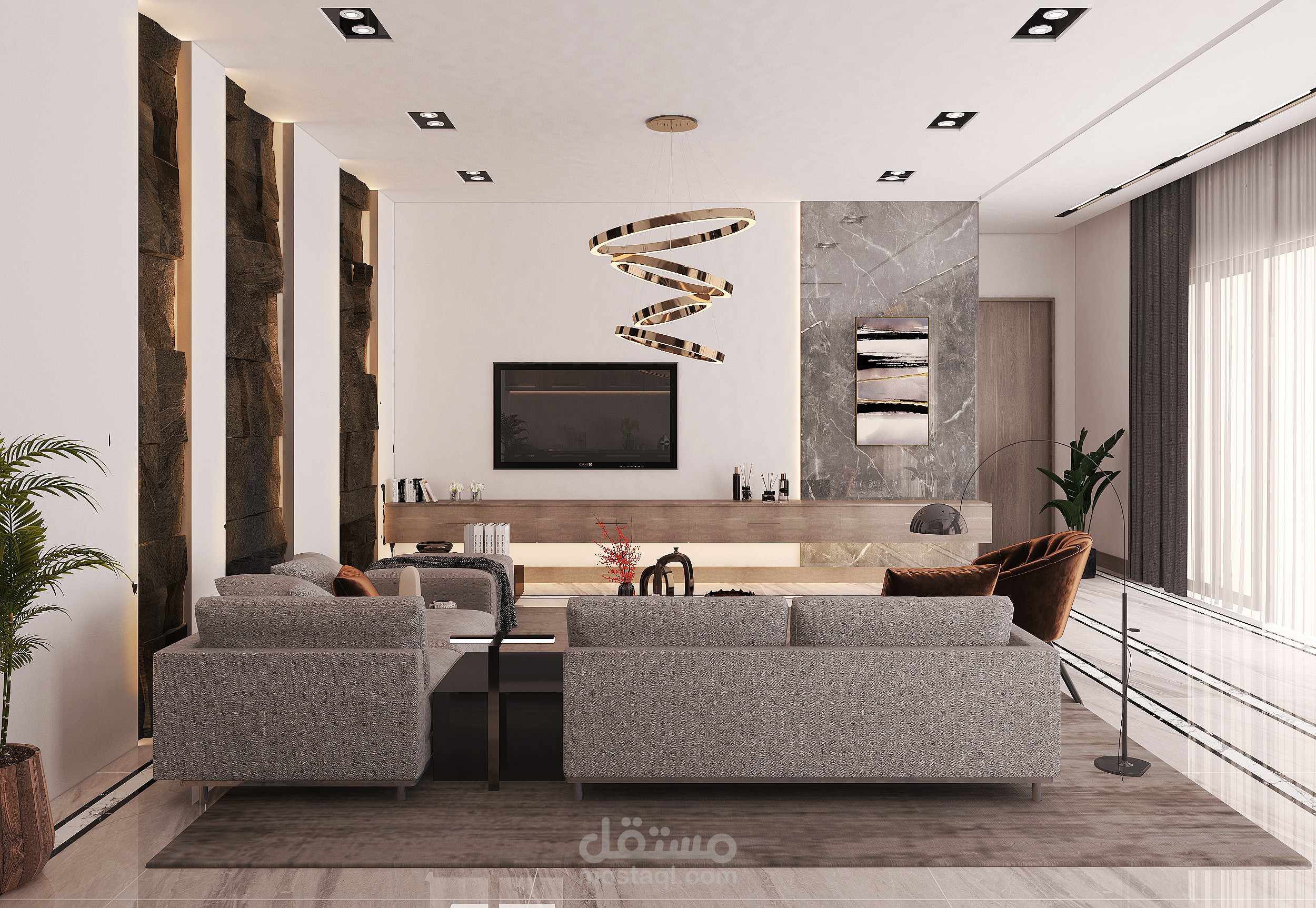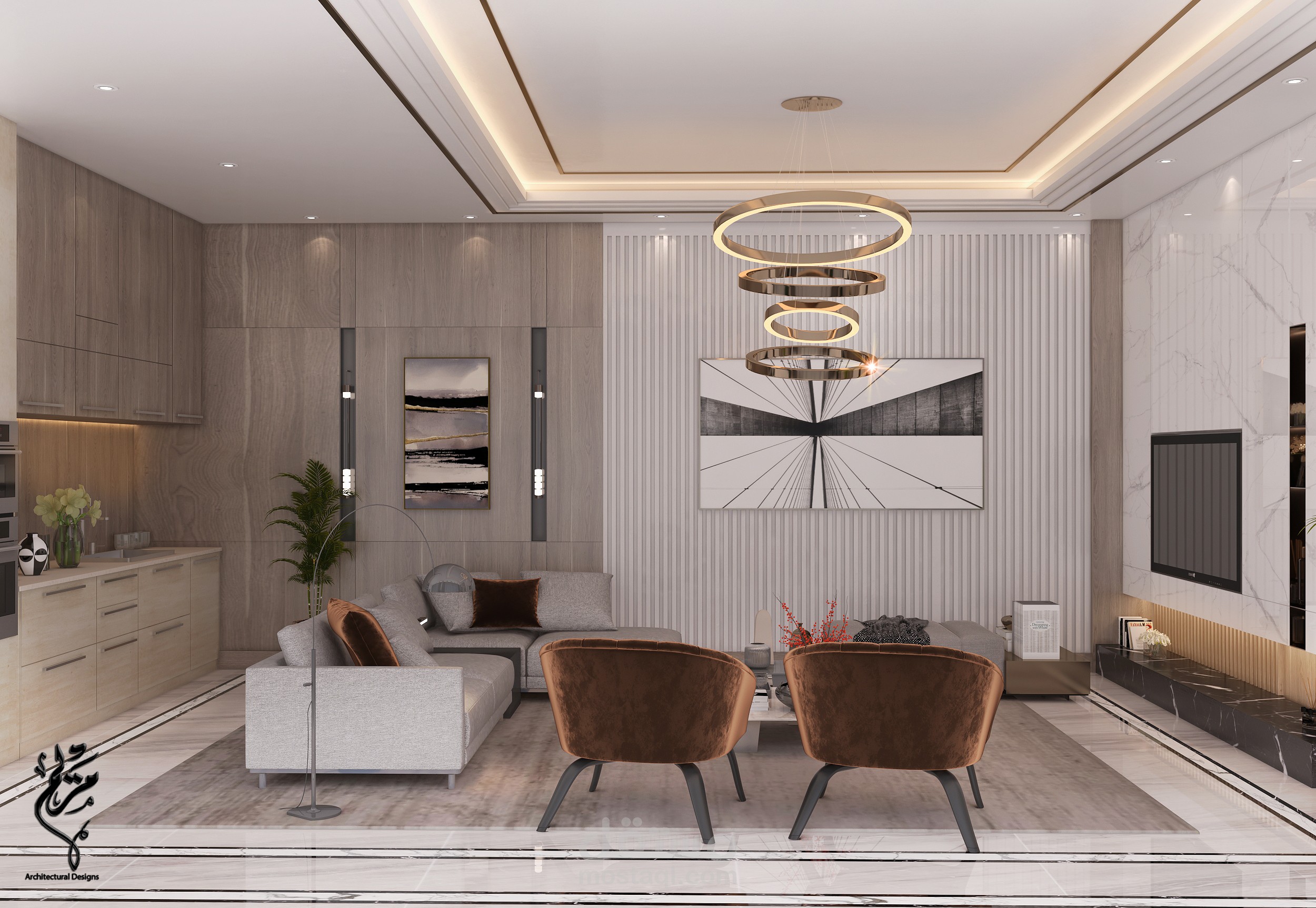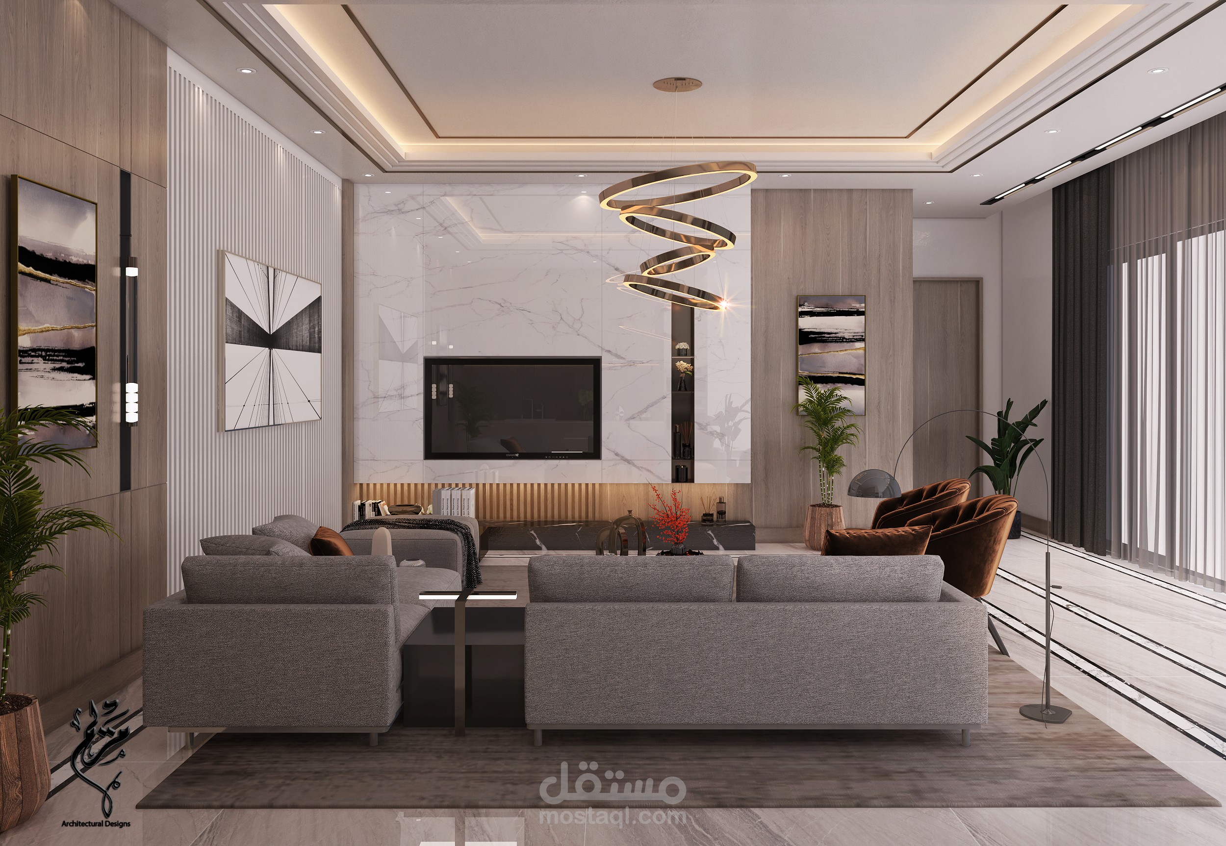 A modern living room in a basement in the Kingdom of Saudi Arabia with 3DMAX program for Benaeya Company