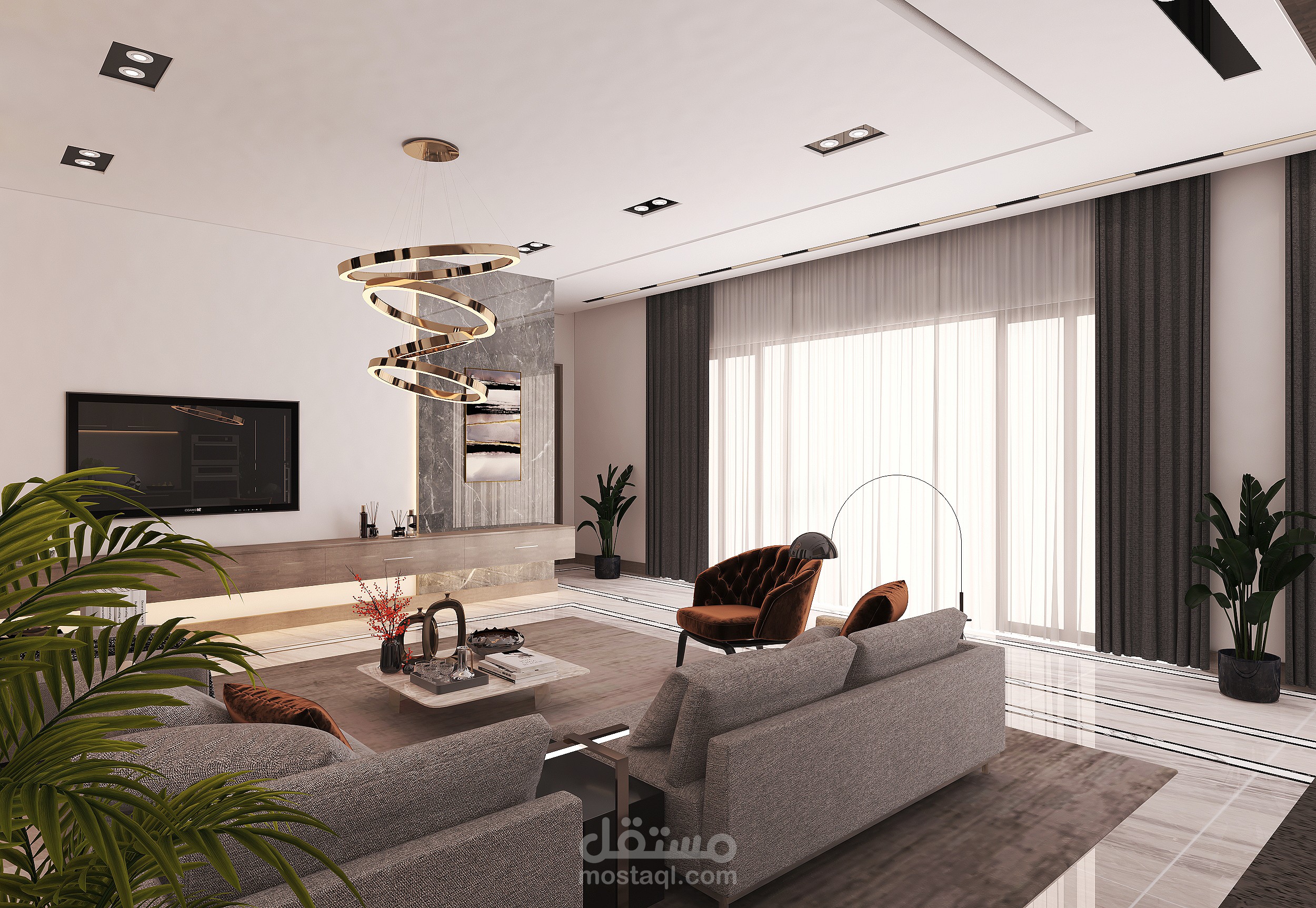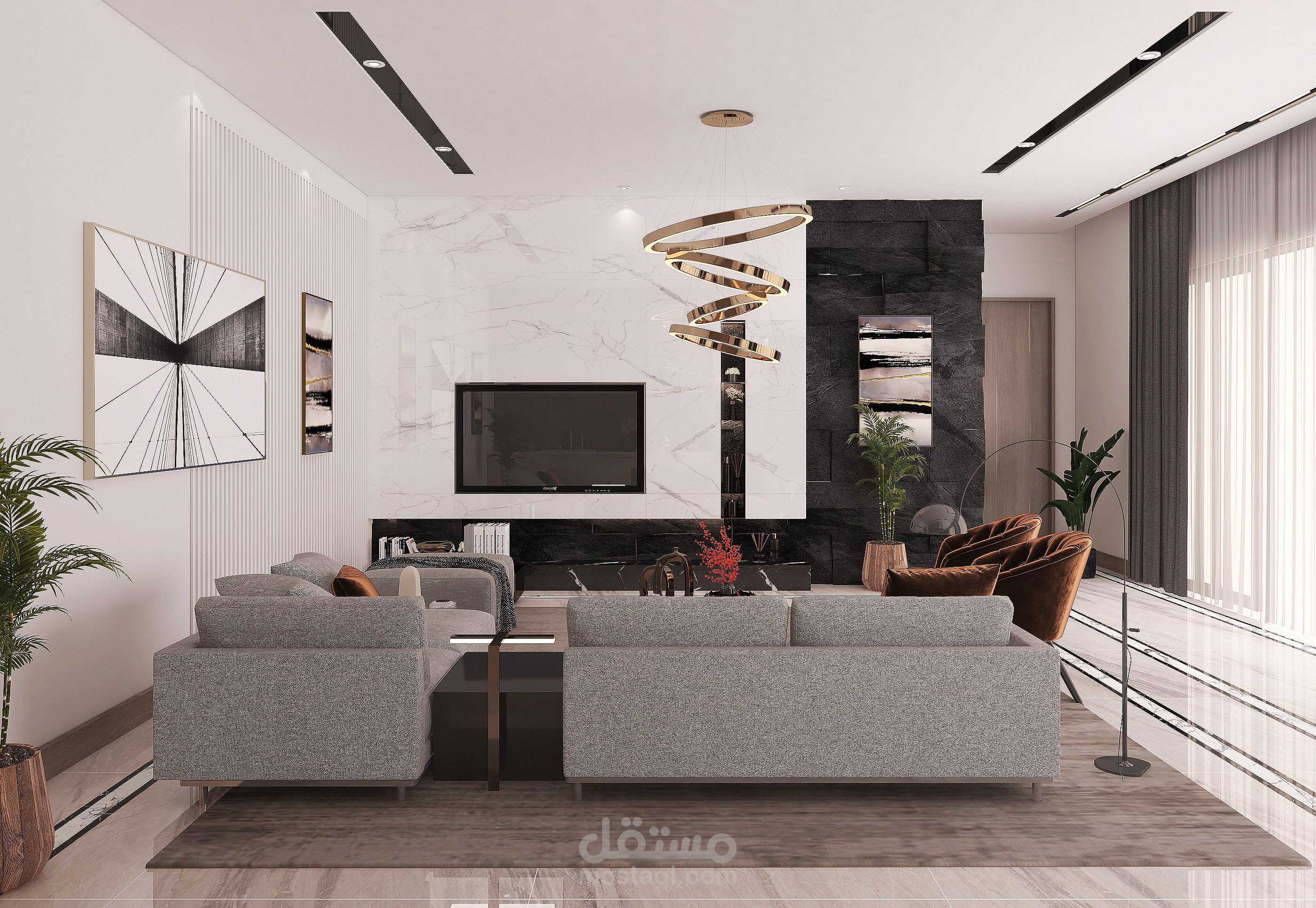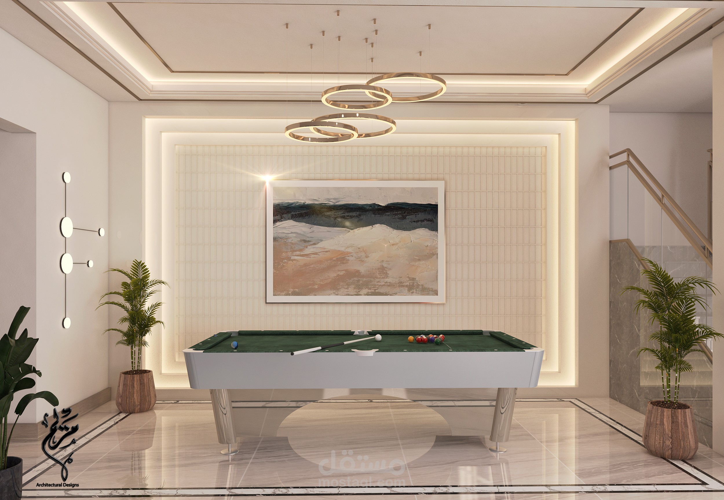A modern living room in a basement in the Kingdom of Saudi Arabia with 3DMAX program for Benaeya Company