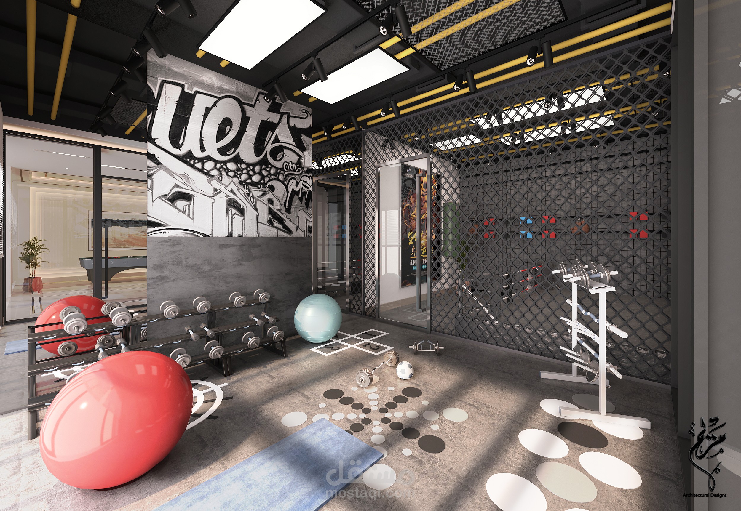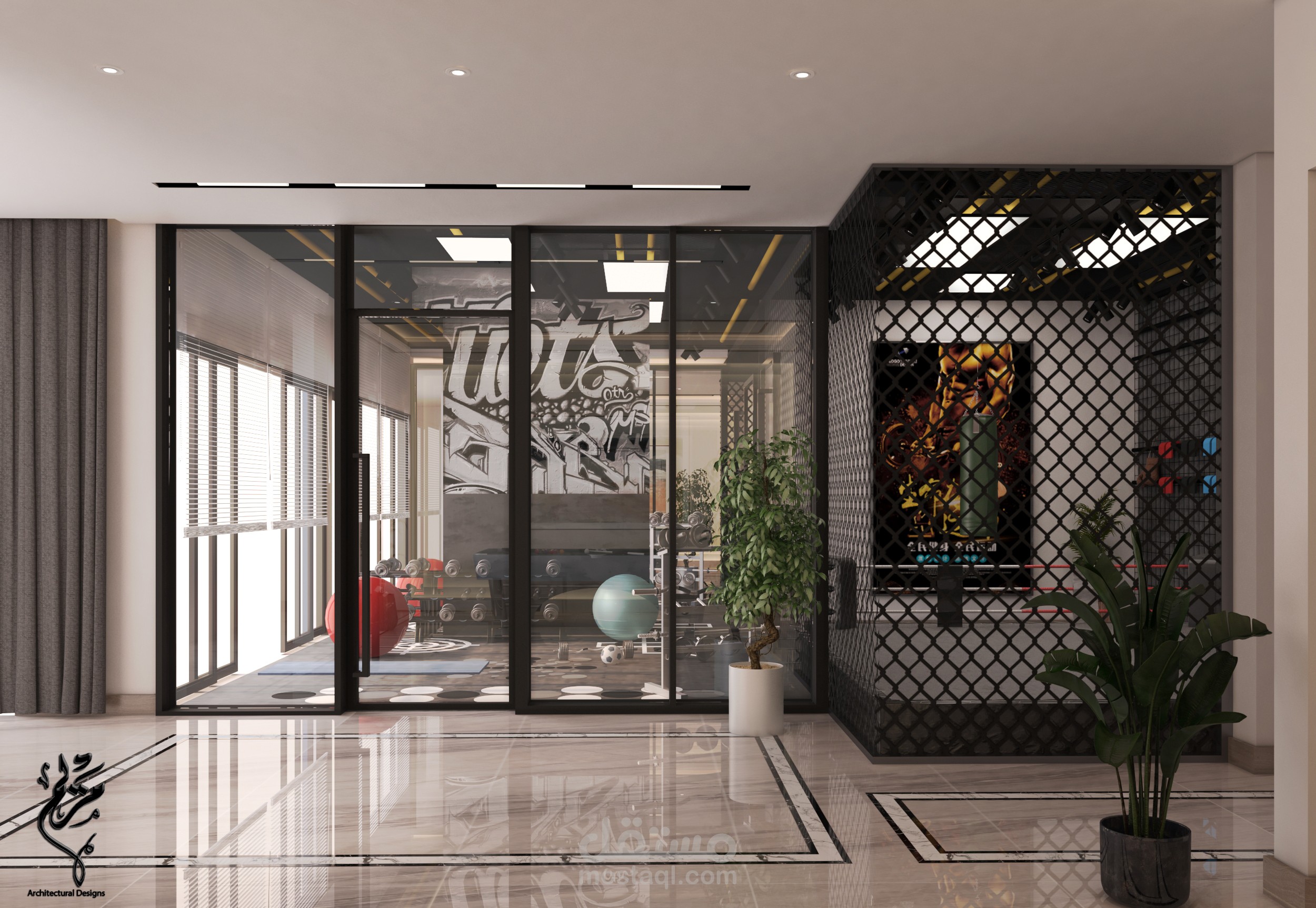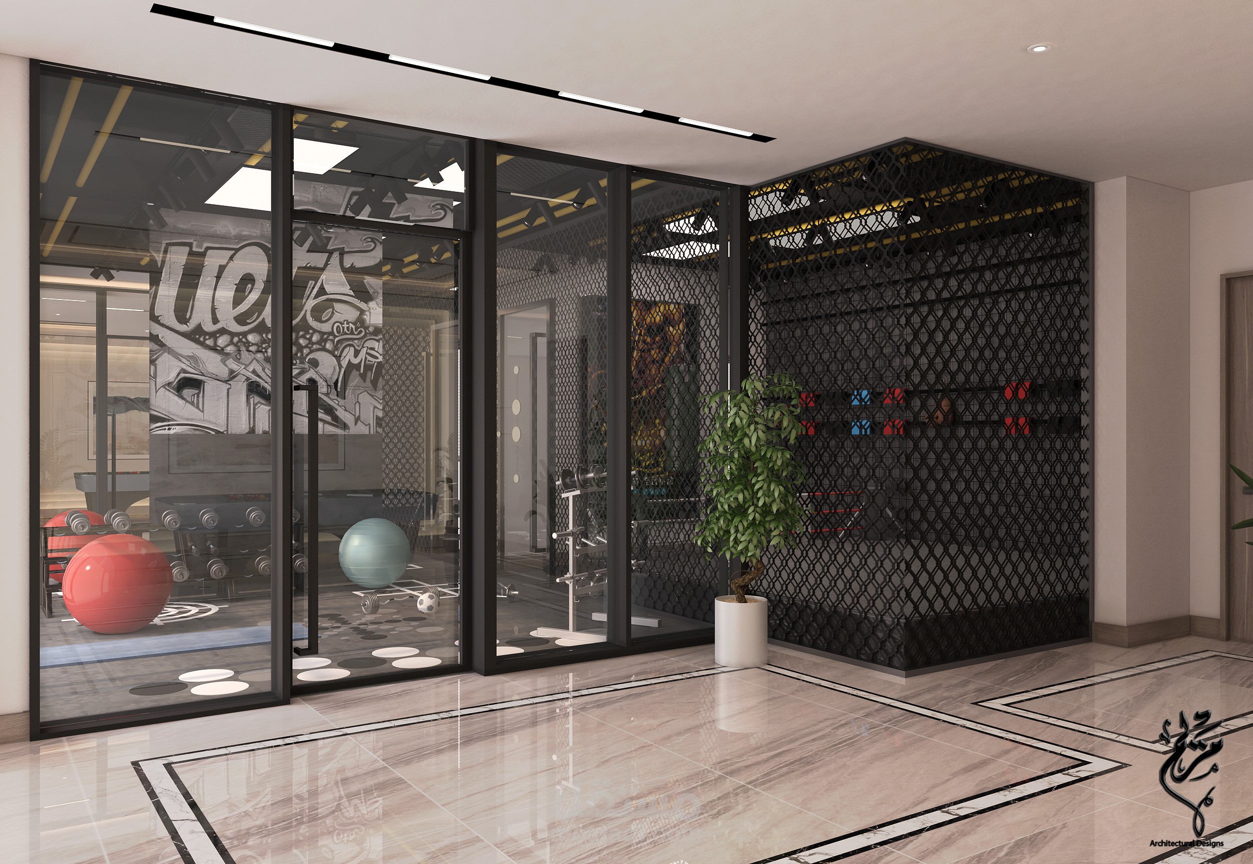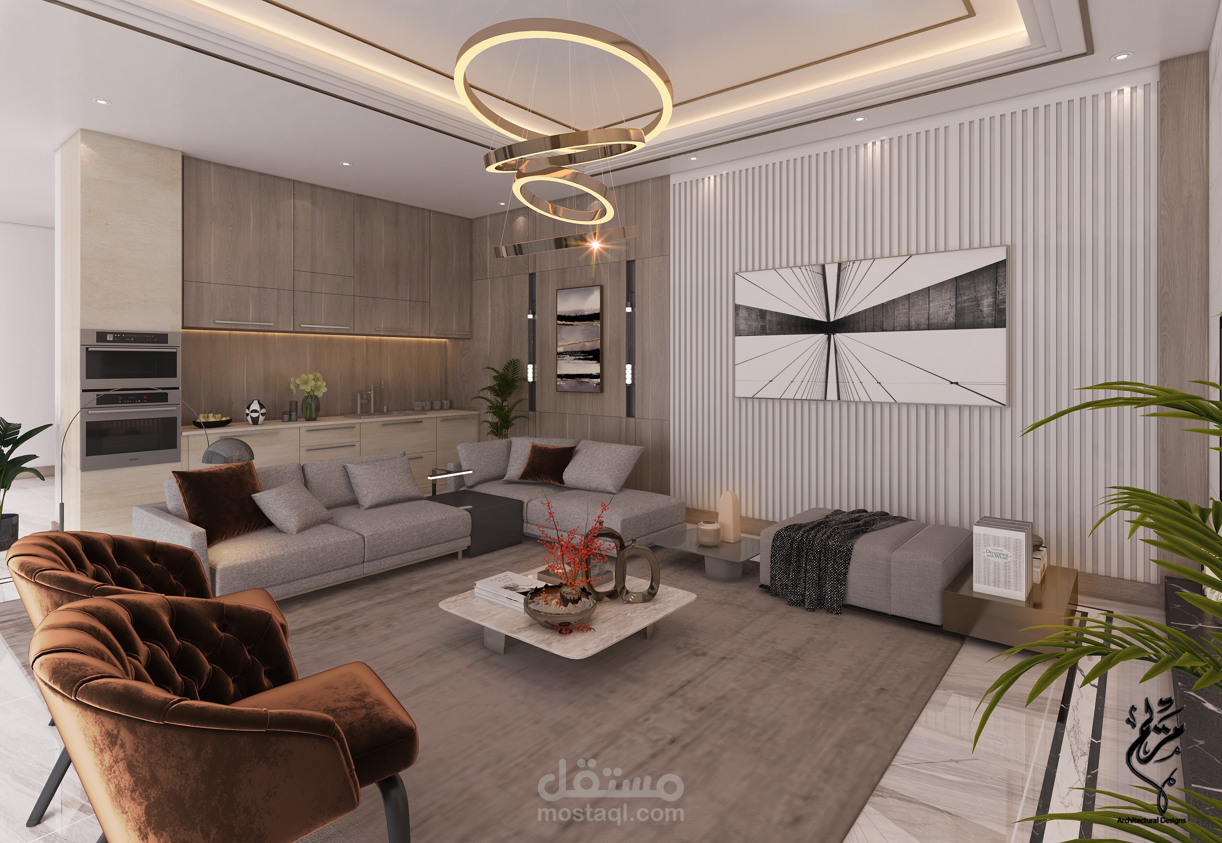 A modern living room in a basement in the Kingdom of Saudi Arabia with 3DMAX program for Benaeya Company