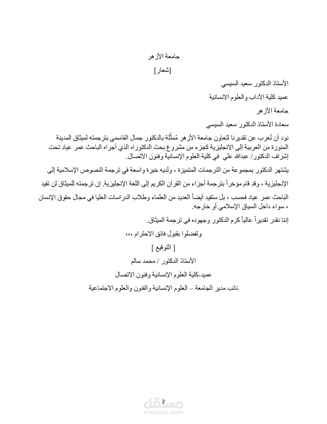 ترجمة رسالة توصية من اللغة الانجليزية إلى اللغة العربية