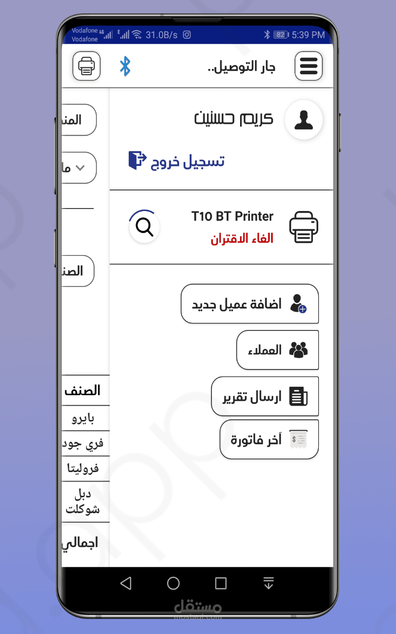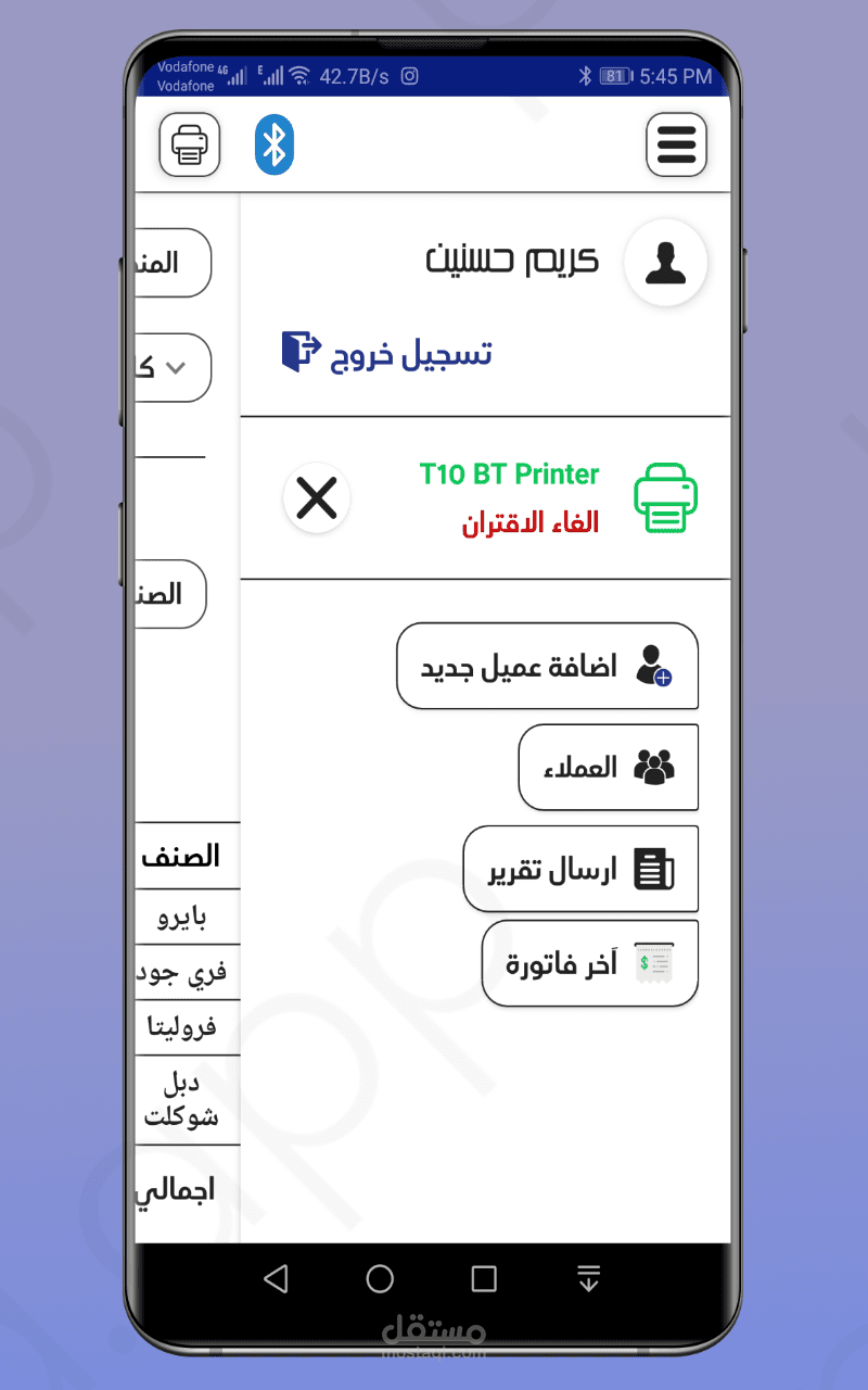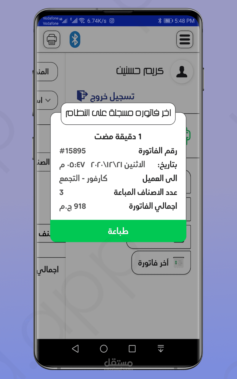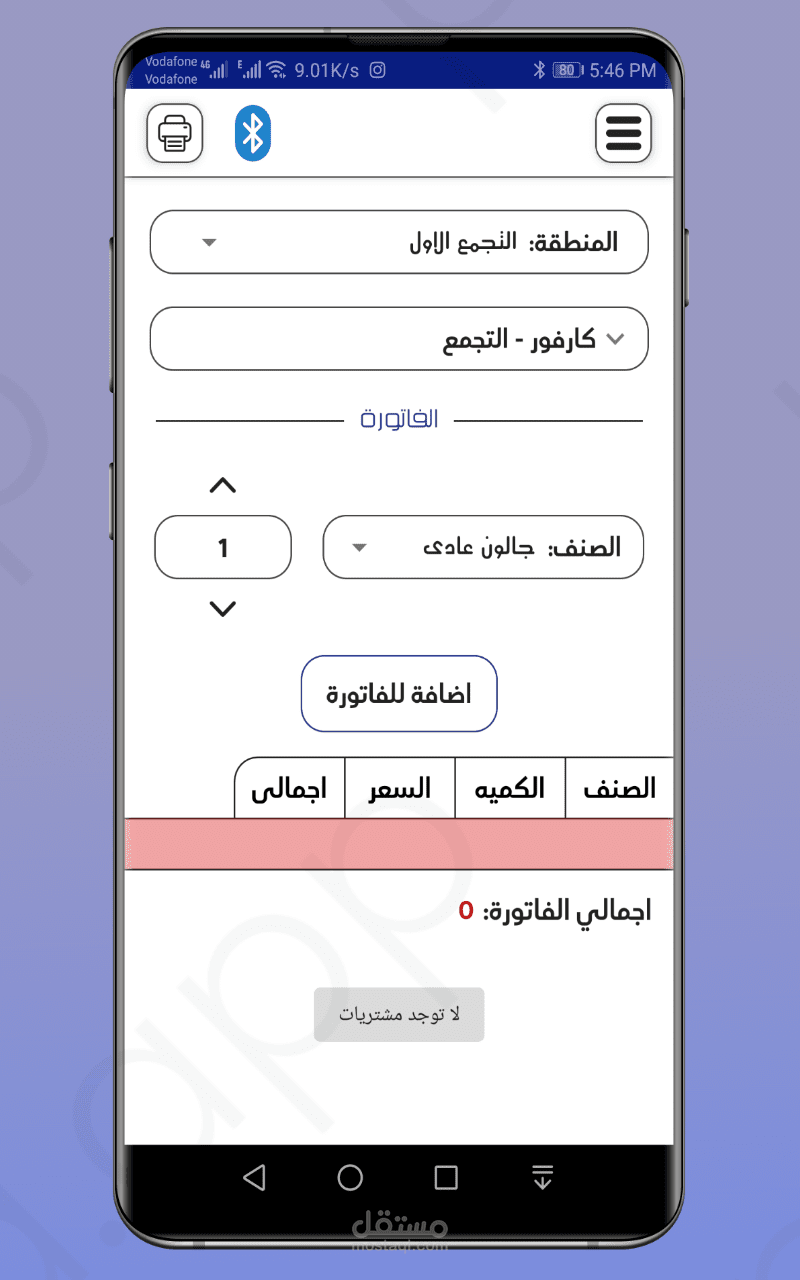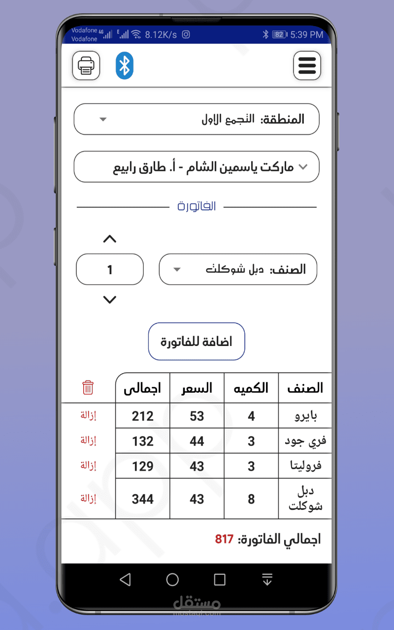 ــ يقوم التطبيق بطباعة الفواتير من الموبايل عن طريق طابعة بلوتوث .. فى نفس لحظه البيع بمكان العميل