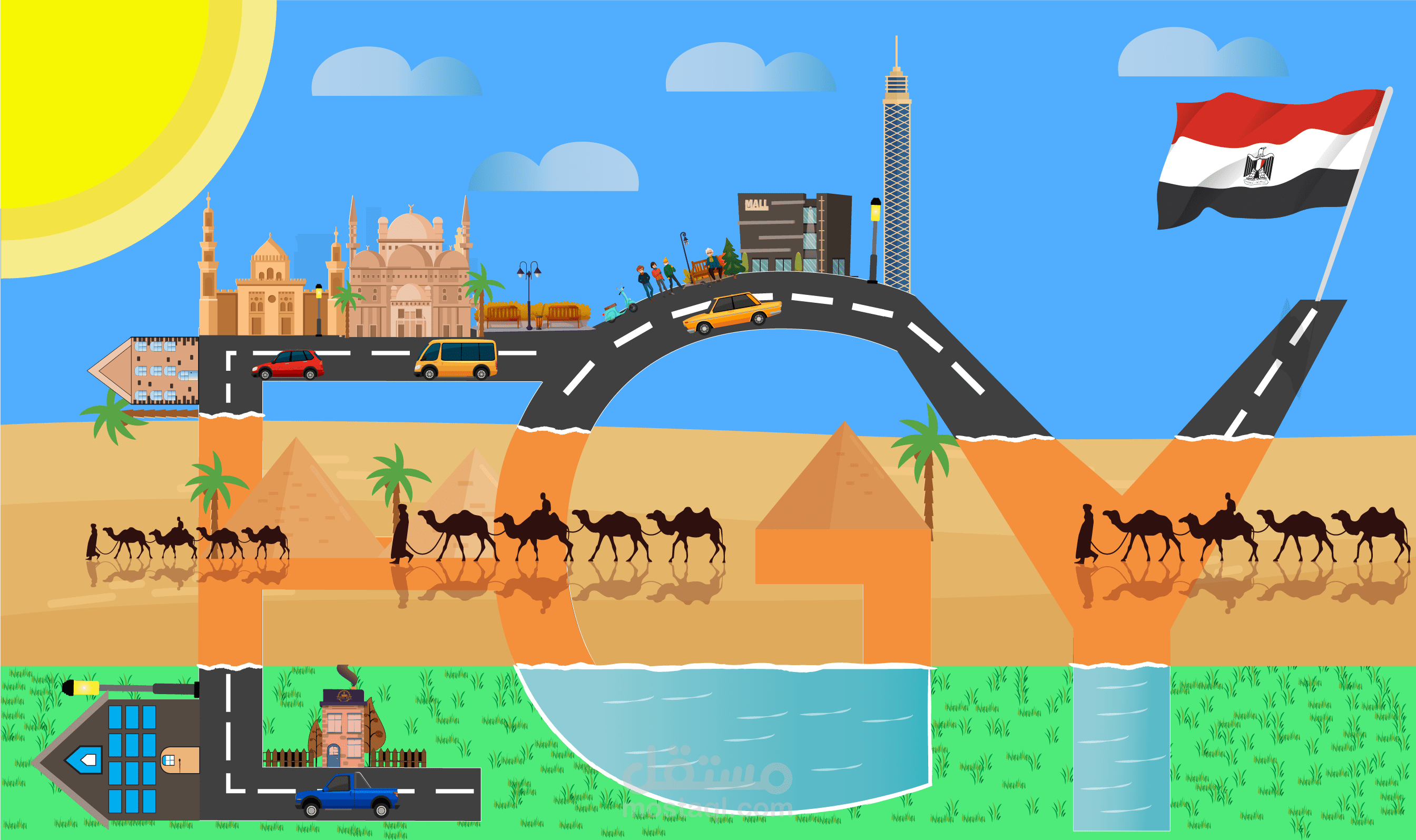 رسم لكل معالم مصر المشهورة علي طريق كتابه اول ثلاث حروف من او مصر