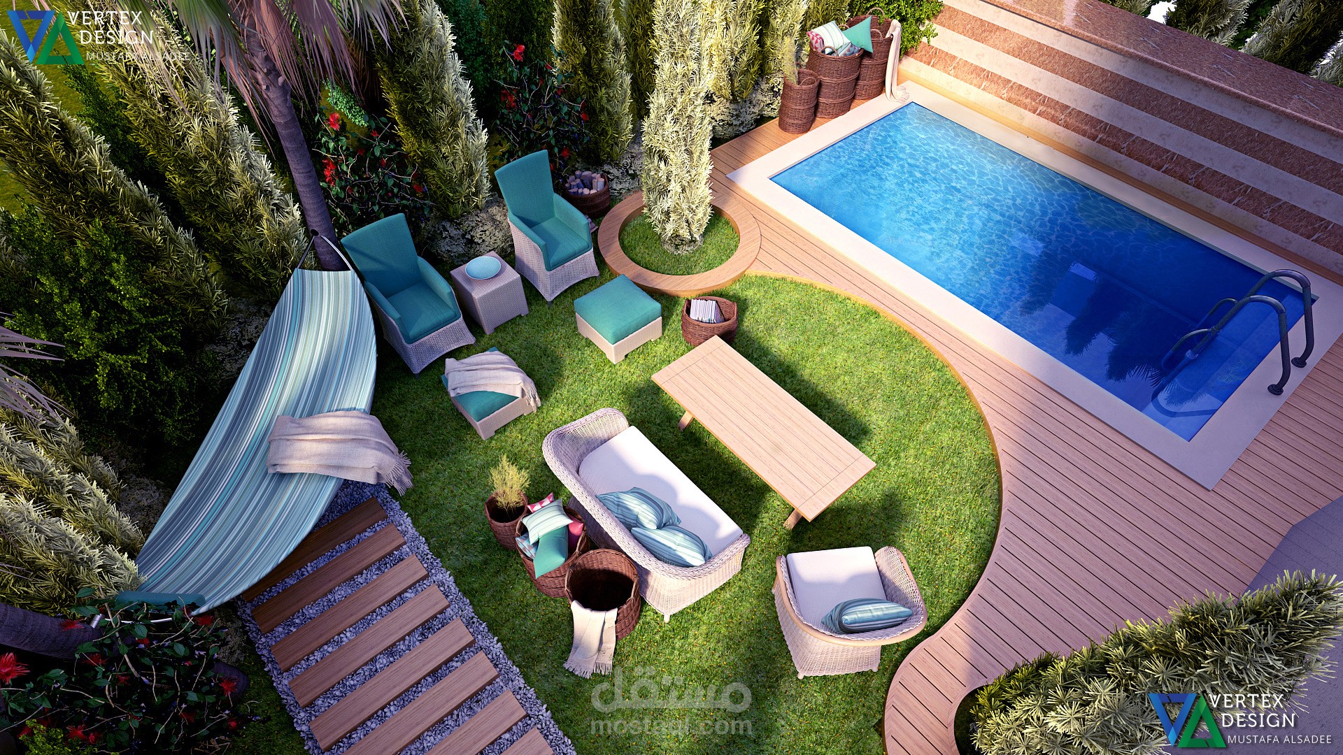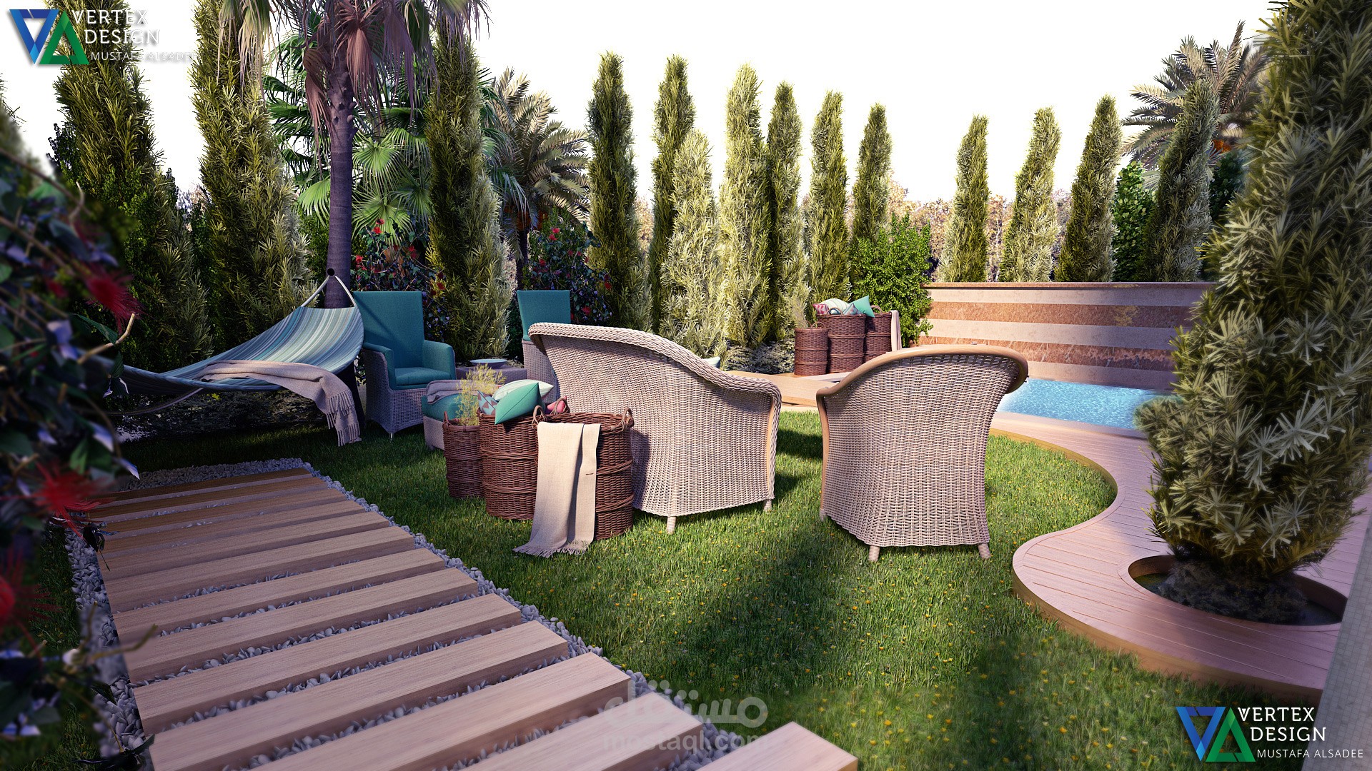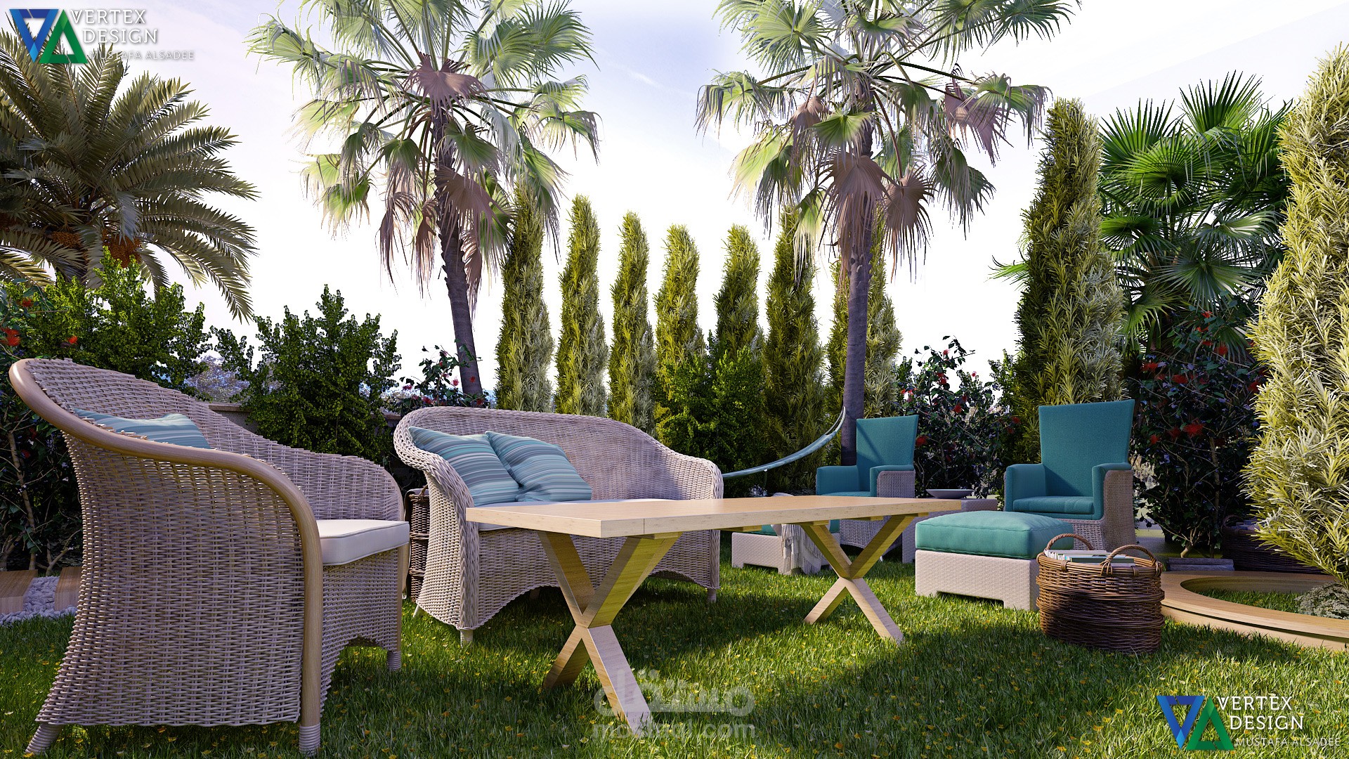 احد جوانب التراسات ضمن فيلا من اعمال مكتبنا بتصميم مريح وهادئ يساعد على الاسترخاء