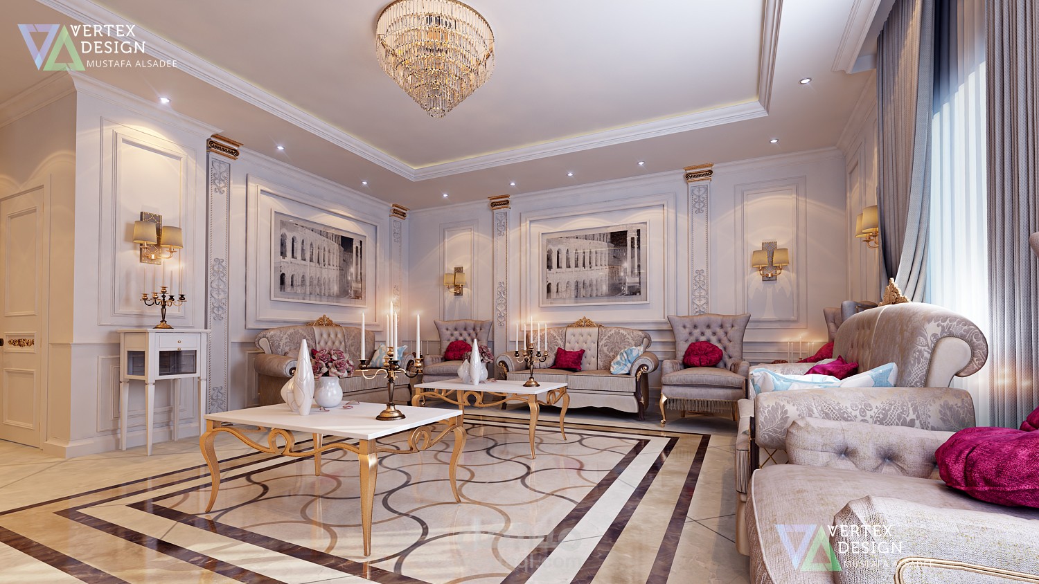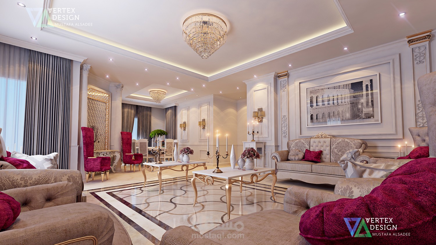 حد المجالس ضمن قصر في الخليج العربي بنمط كلاسيكي محدث بالوان مريحة وفخامة هادئة