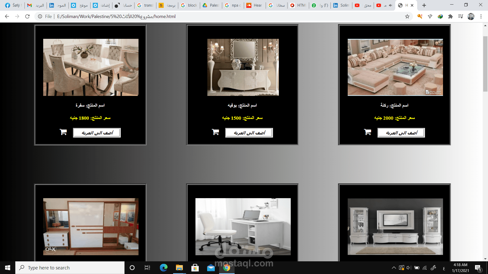 هذا نموذج لموقع الكترونى للأثاث المنزلى باللغة العربية من تصميمى باستخدام لغات برمجة حديثة واهمها HTML, CSS, CSS3, JavaScript. ويحتوى هذا الموقع على العديد من الخدمات مثل تسجيل البيانات وتسجيل الدخول والتصفح والبحث كما يمكن اضافة لغات اخرى ك PHP و MySQL لاتاحة لوحة تحكم خاصة بالمدير يستطيع من خلالها حذف وتعديل بيانات المستخدمين على الموقع وتفعيل صفحة تسجيل البيانات وصفحة تسجيل الدخول وامكانية عرض بيانات المستخدمين فى اى وقت والسماح للمسؤول بالتحكم الكامل في بيانات المستخدمين وطباعتها بتنسيق pdf إذا أراد ذلك. واتاحة العديد من الاستعلامات لقواعد البيانات مثل: انشاء جدول تحديد إدراج اضافة حذف استدعاء والعديد من الخدمات الاخرى التى استطيع تقديمها حسب الطلب..