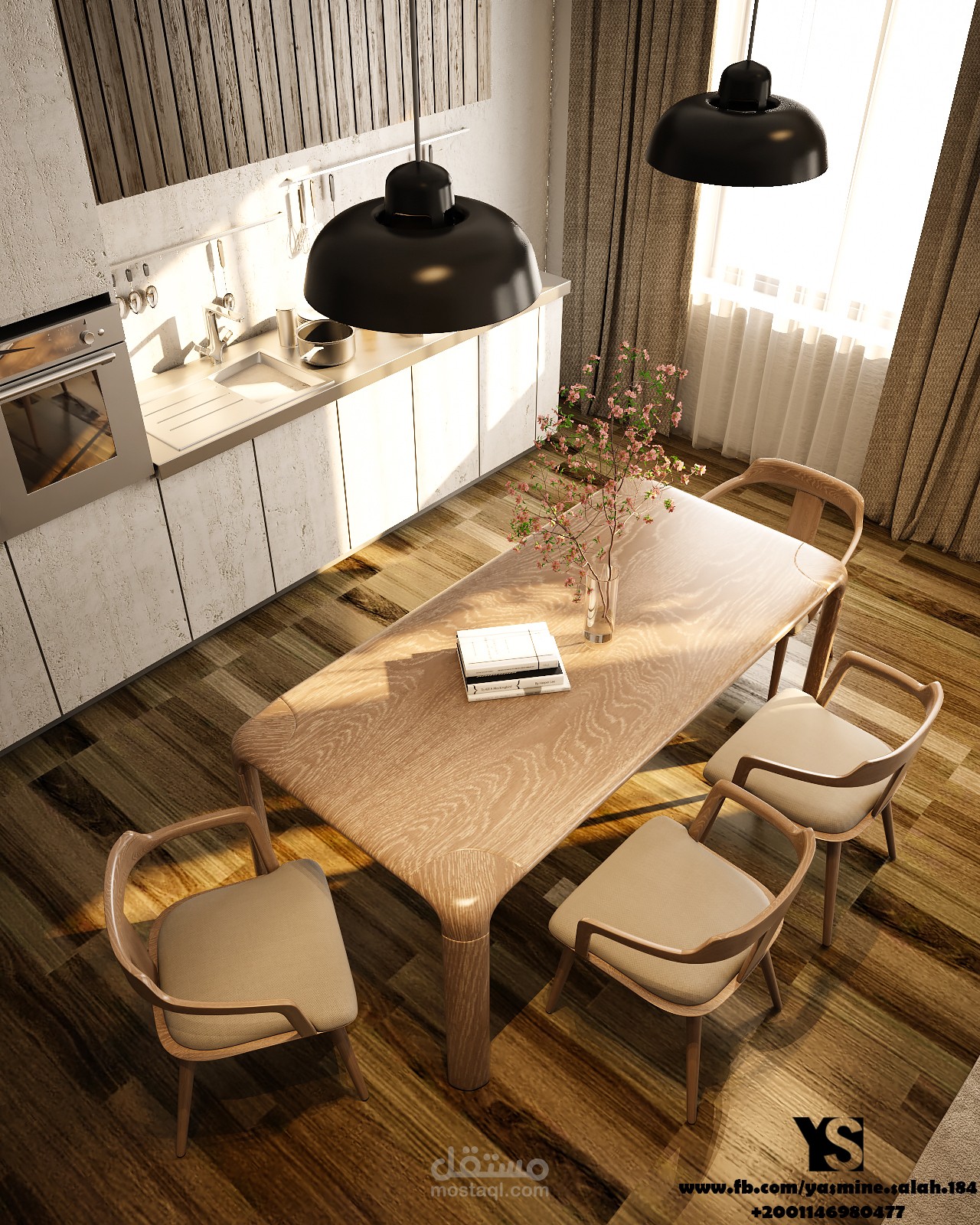 تصميم لغرفة معيشة ومطبخ صغير وطاولة لطعام على الطراز "مودرن"