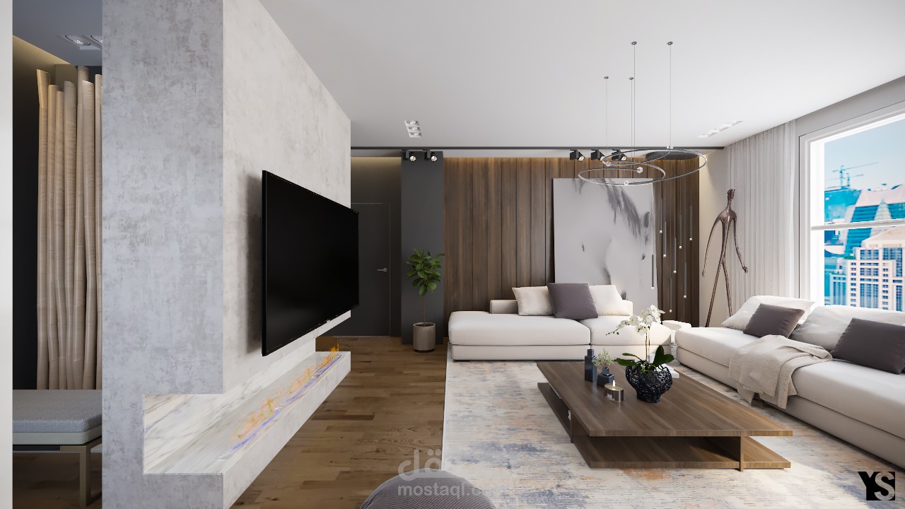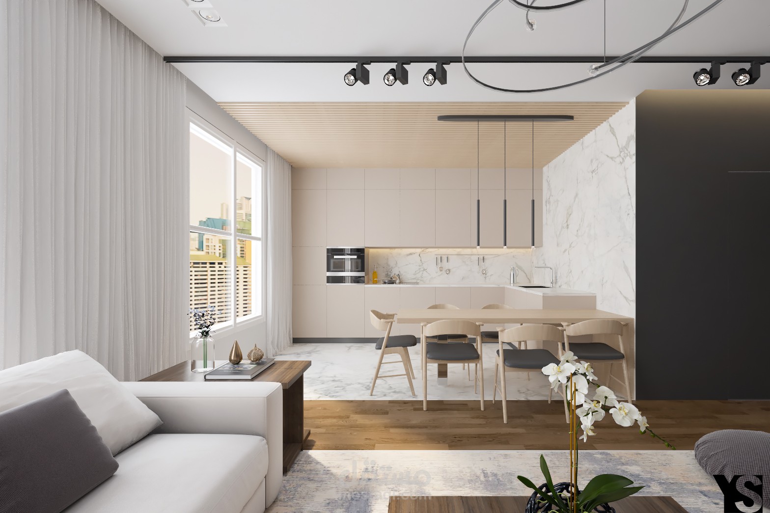 تصميم مودرن لغرفة معيشة ملحق به مطبخ صغير وسفرة