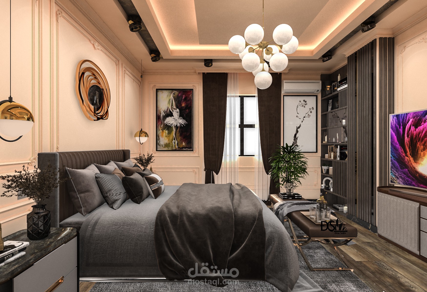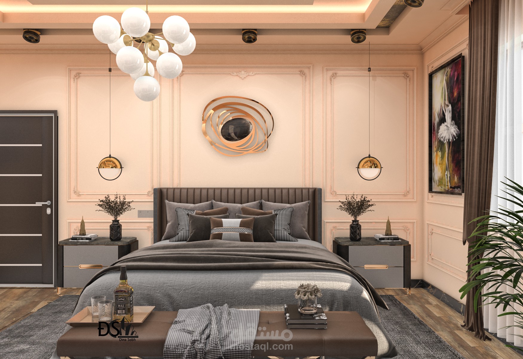 غرفة نوم ملحقة بغرفة ملابس و حمام على الطراز العصري الممزوج بالكلاسيكى و استخدام الالوان المريحة