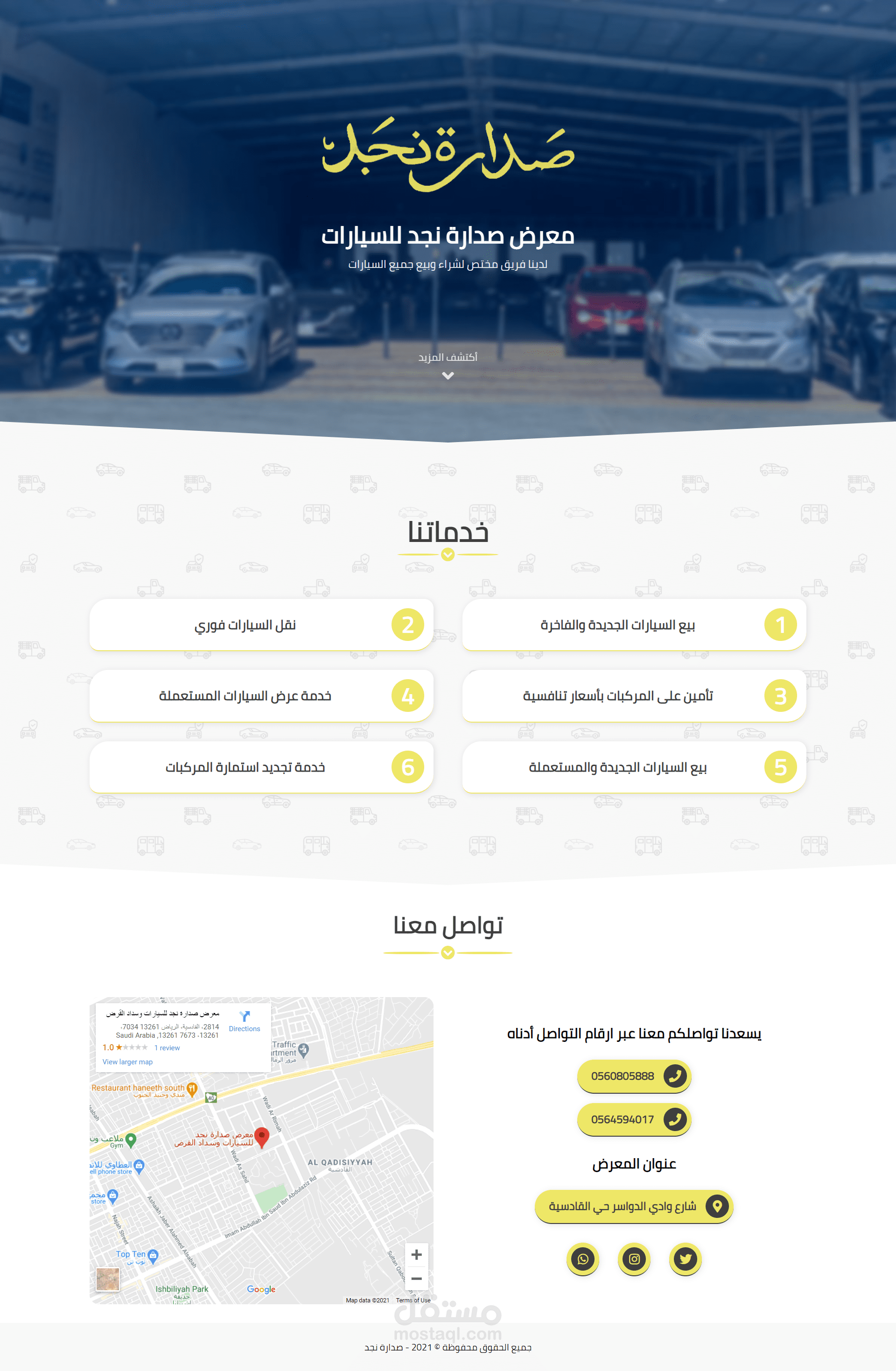 تصميم وتطوير موقع تعريفي بسيط عبارة عن صفحة هبوط (landing page) لمعرض سيارات يحتوي علي نبذة عن المعرض والخدمات والمميزات وارقام التواصل والعنوان ومواقع التواصل وخريطة لعنوان المعرض.