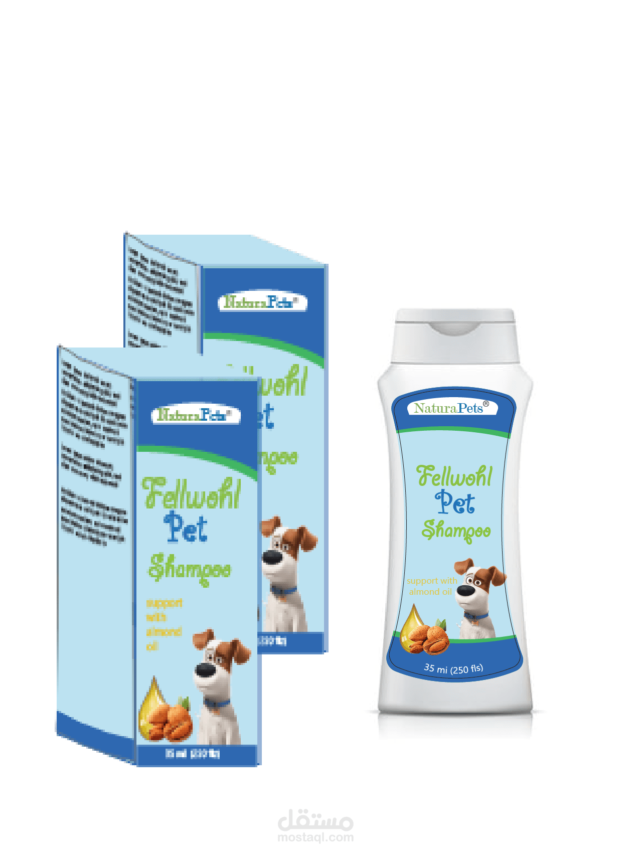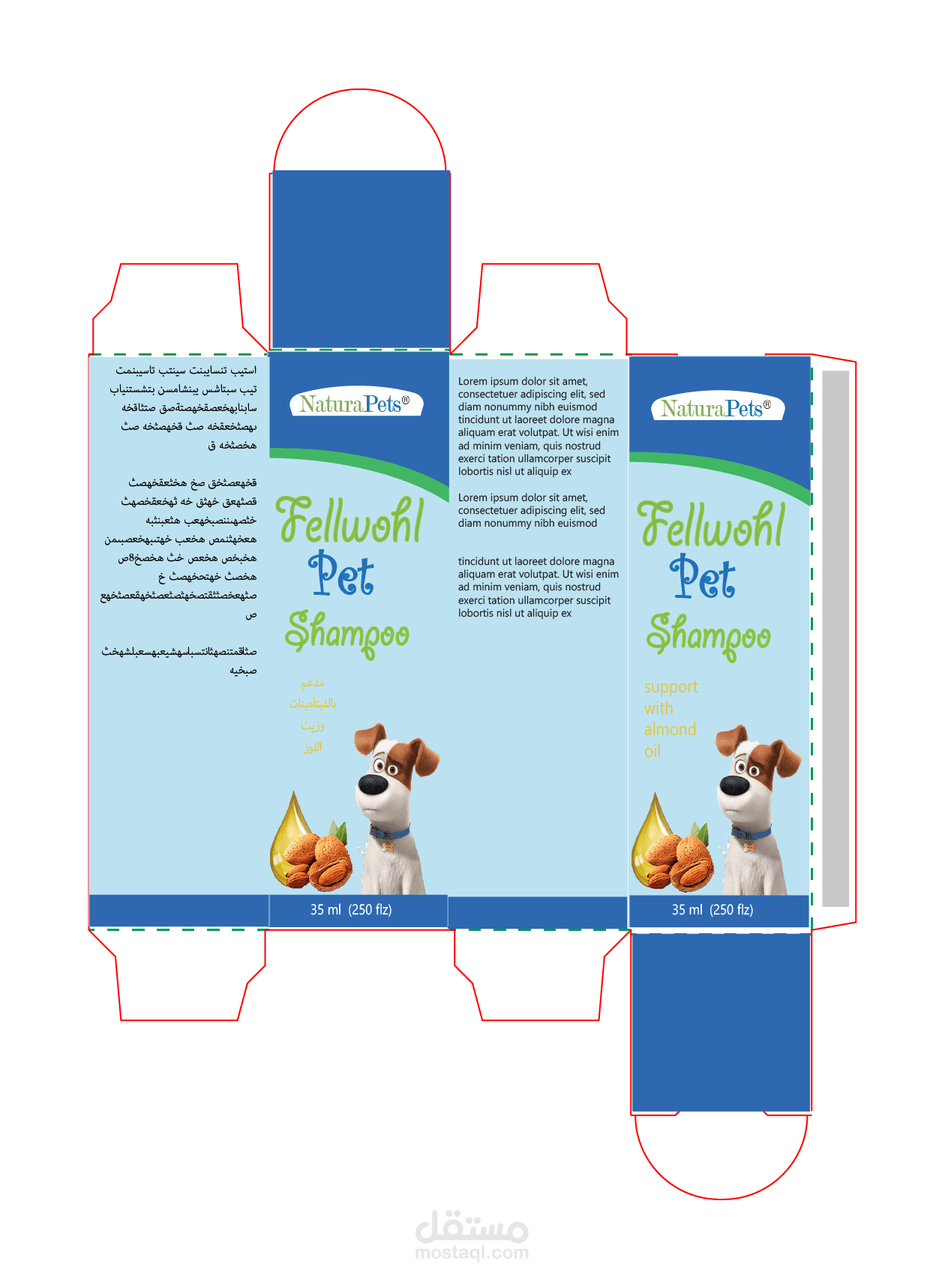 عمل تغليف كامل من تصميم استكرات علبة الشامبو وتصميم الكرتونة نفسها مع تصميم الداي كت للكرتونة أيضاً