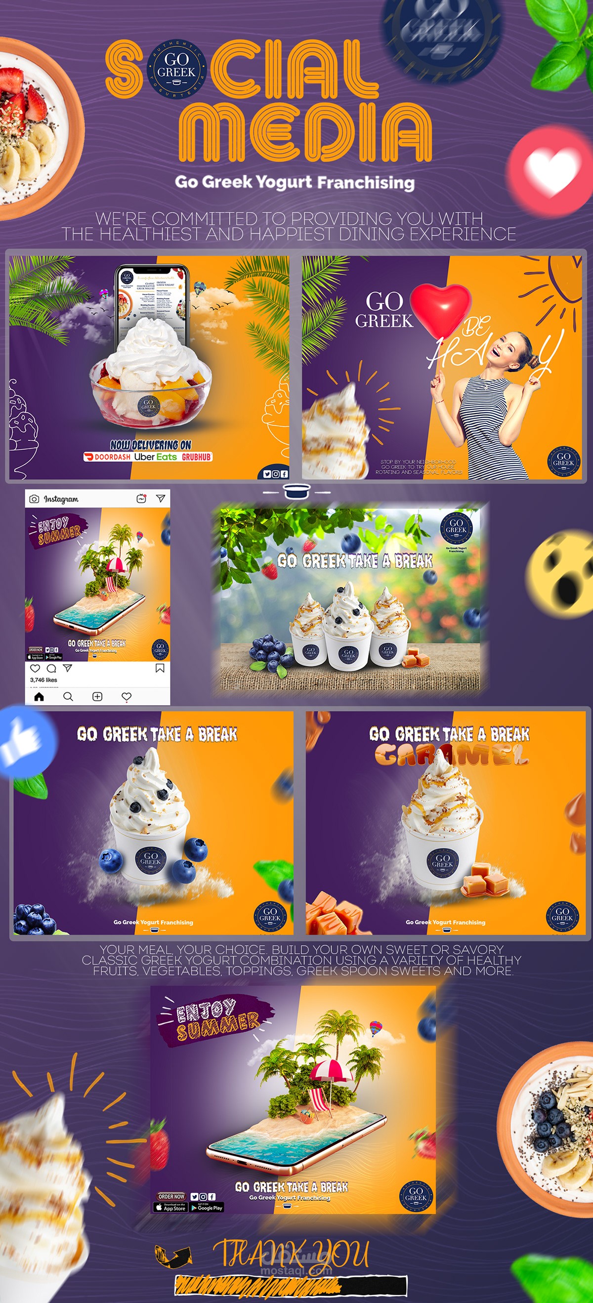 في هذا المشروع قمت بتنفيذ حملة تصميم لمنصة سوشيال ميديا Instagram & Facebook خاصة بمتجر Go Greek المتخصص في تقديم الزبادي اليوناني الصحي بنكهات مبتكرة.