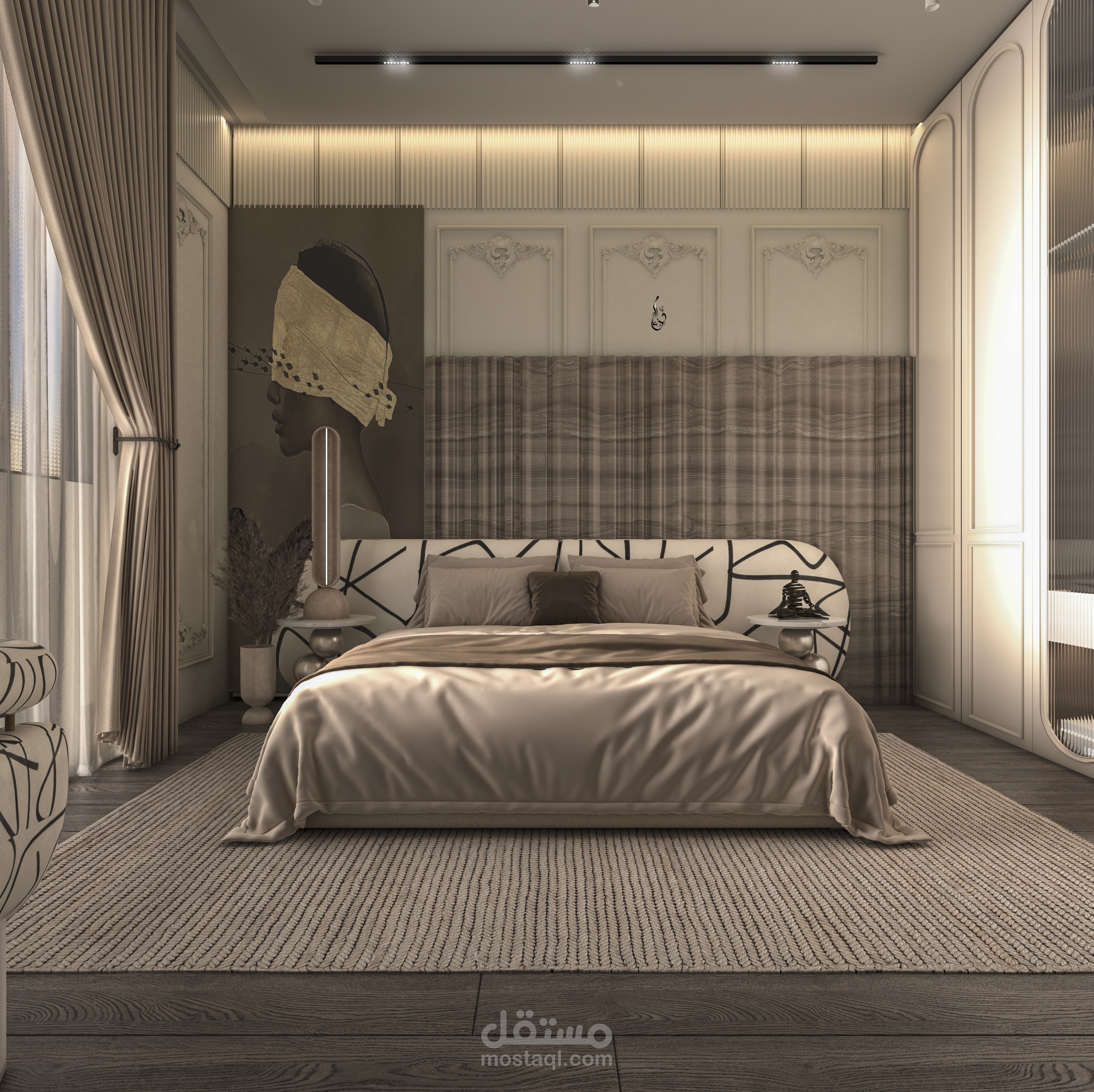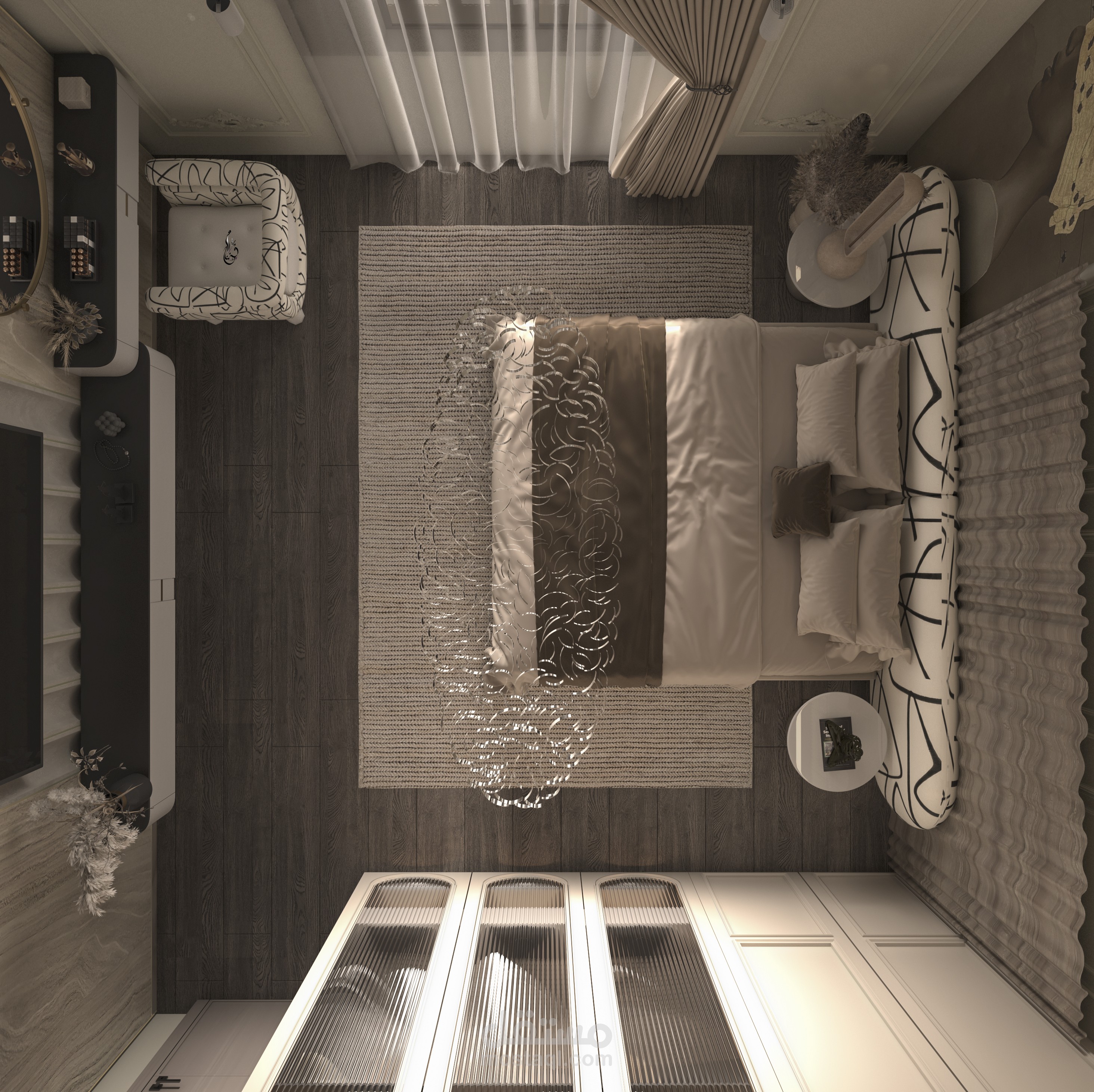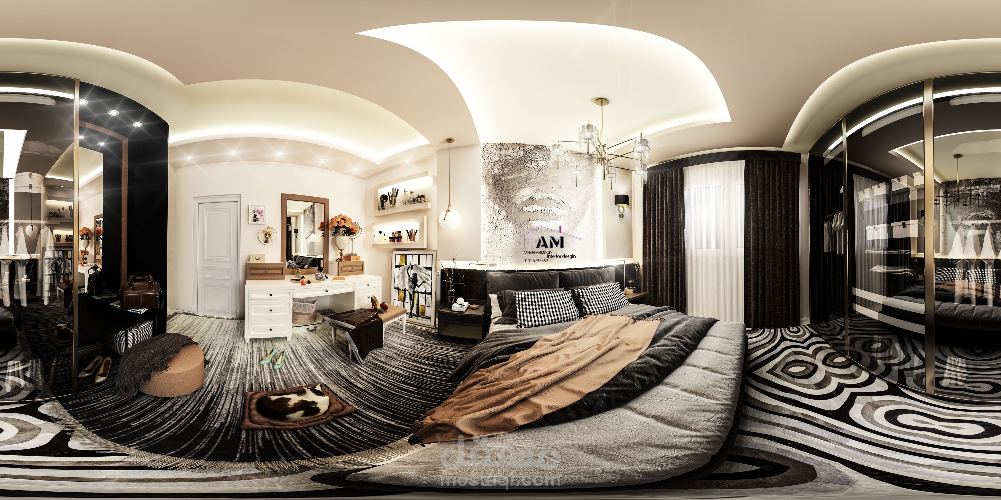 تصميم عبر برنامج الاتوكاد للغرفه ووضع اماكن الاثاث واختيار الوان الدهان المناسبه مع الجبس والارضيه الباركيه ومن ثم اختيار الفرش والاكسيسوارات الخاصه بالغرفه ويتم العمل عليها علي برنامج 3Dmax لأظهار الفكره والحصول ع صور واقعيه