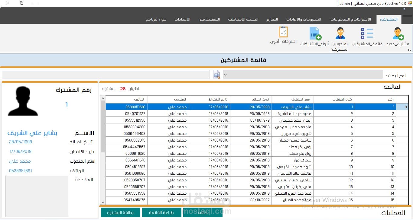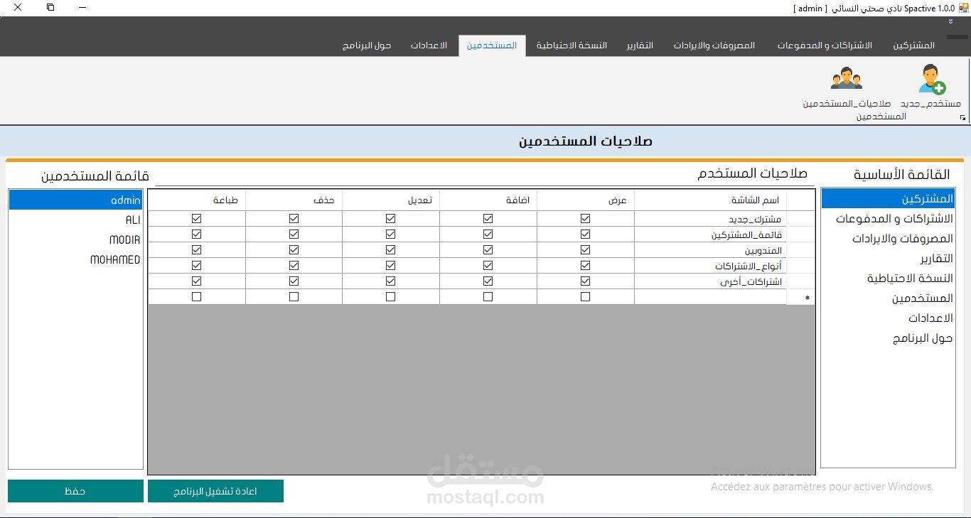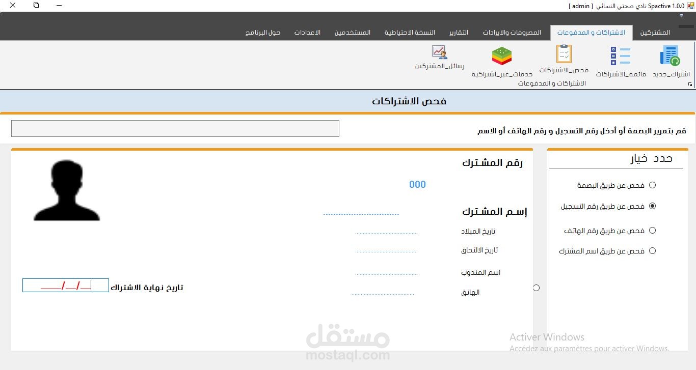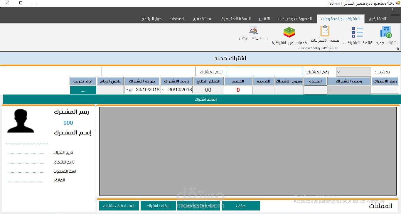 برنامج ادارة اشتراكات نادي رياضي مع تسليم السورس كود يكون بسيط في شاشاته ومميز بالايقونات والرسوم -صلاحيات مستخدمين -ادارة الاشتراك -التقاط صور للمشتركين -بصمة يد للمشترك (مربوط مع جهاز بصمة الاصبع) لقراءة البيانات وعرضها -فواتير اشتراك(الصندوق) -كشف بايرادات الصندوق -سند قبض وسند صرف -ارسال رسائل نصية من البرنامج(قرب الانتهاء-انتهاء الاشتراك-عروض اشتراك ...الخ) -تقارير مع طباعتها. -طباعة كرت بطاقة دخول -ايقاف اشتراك موقت(مثل:ايقاف الاشتراكات بسبب صيانة الصالة-اعياد-مناسبات وطنية) -شاشة اعدادات للبرنامج -يشتغل على الشبكة كذا جهاز -نظام حماية للنسخة.