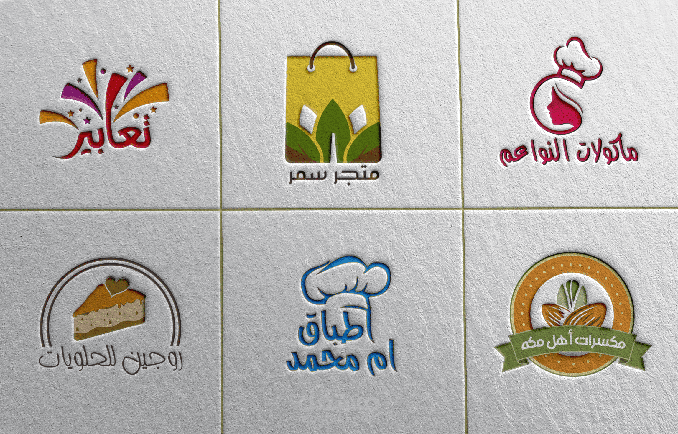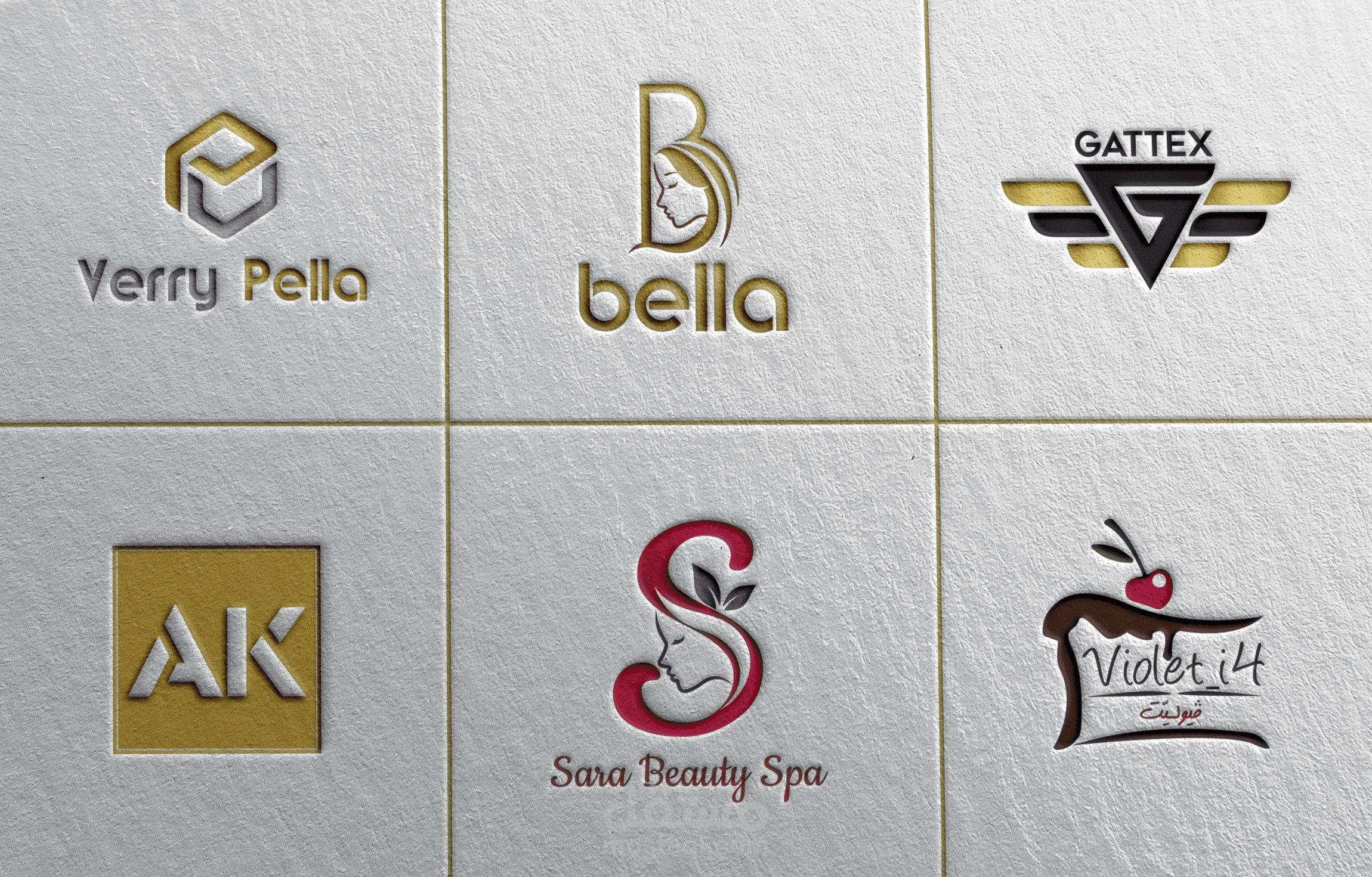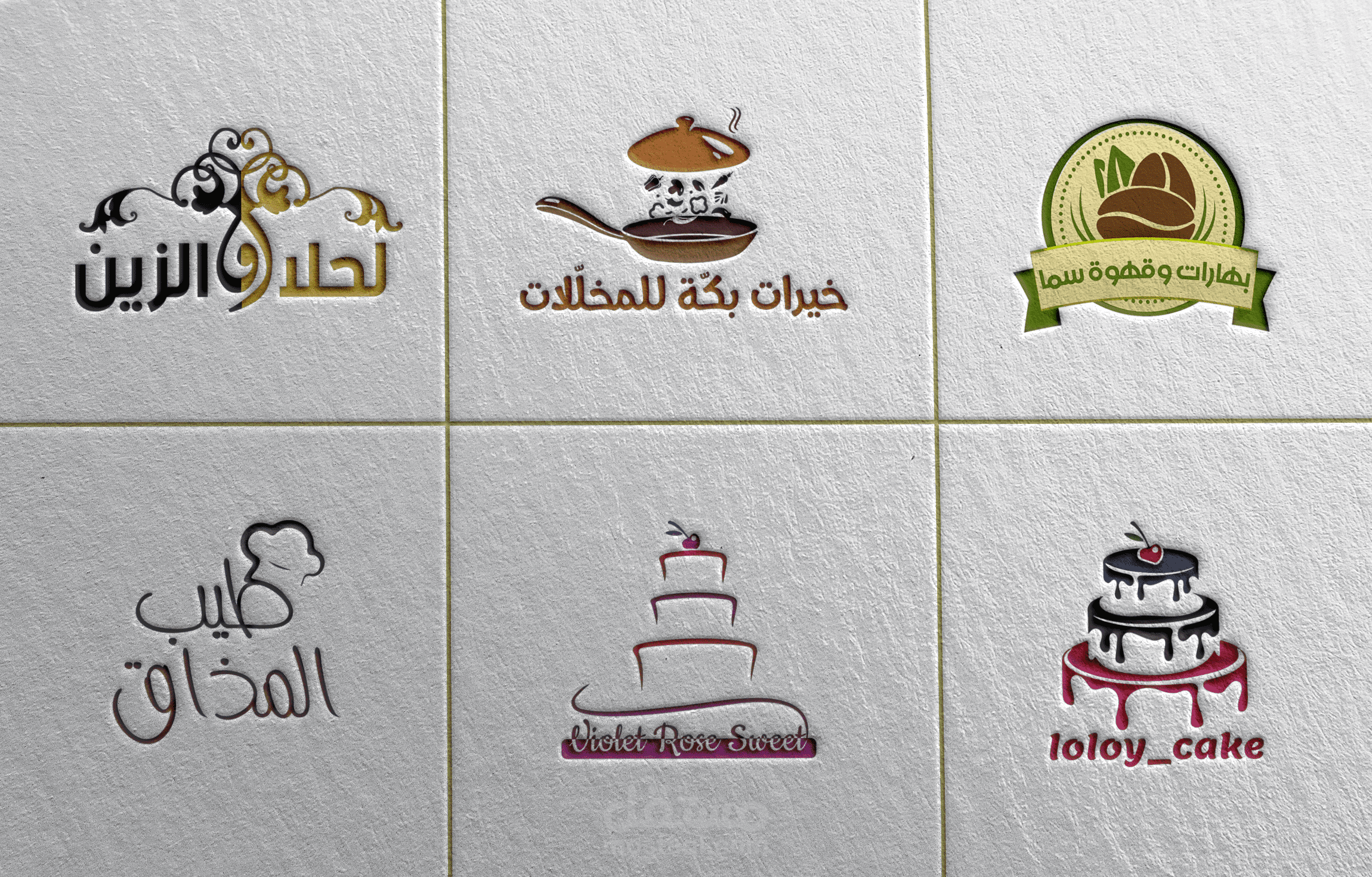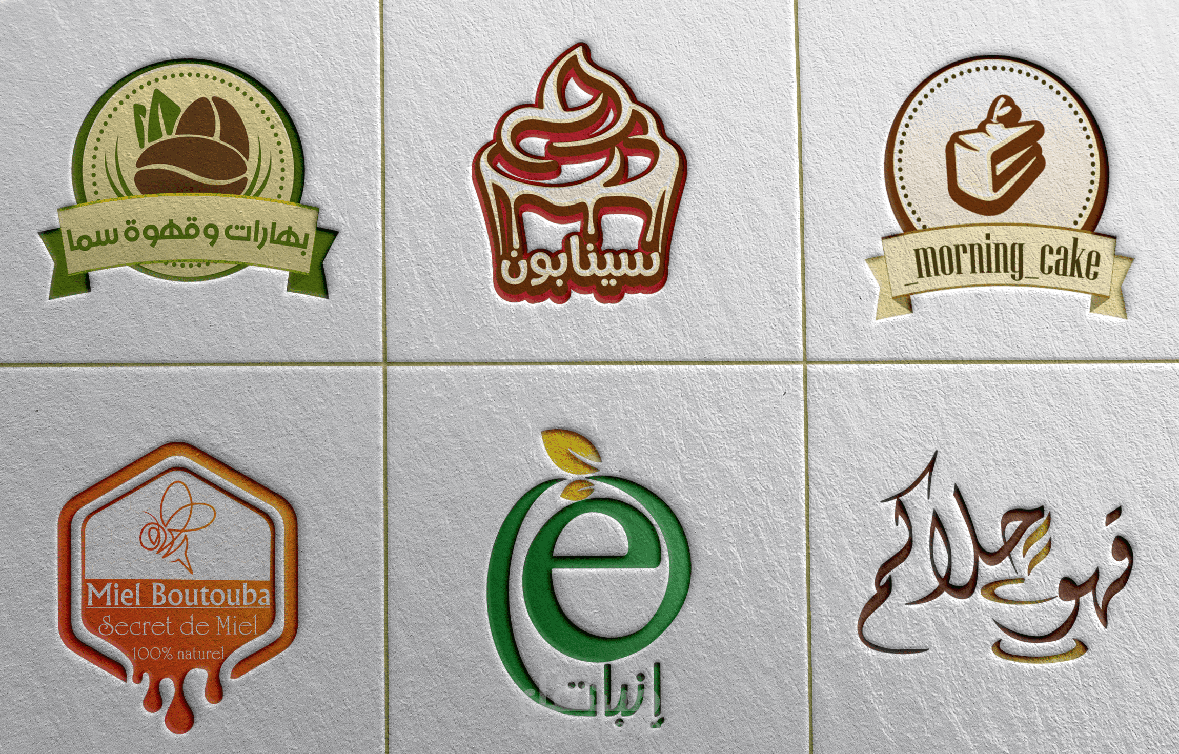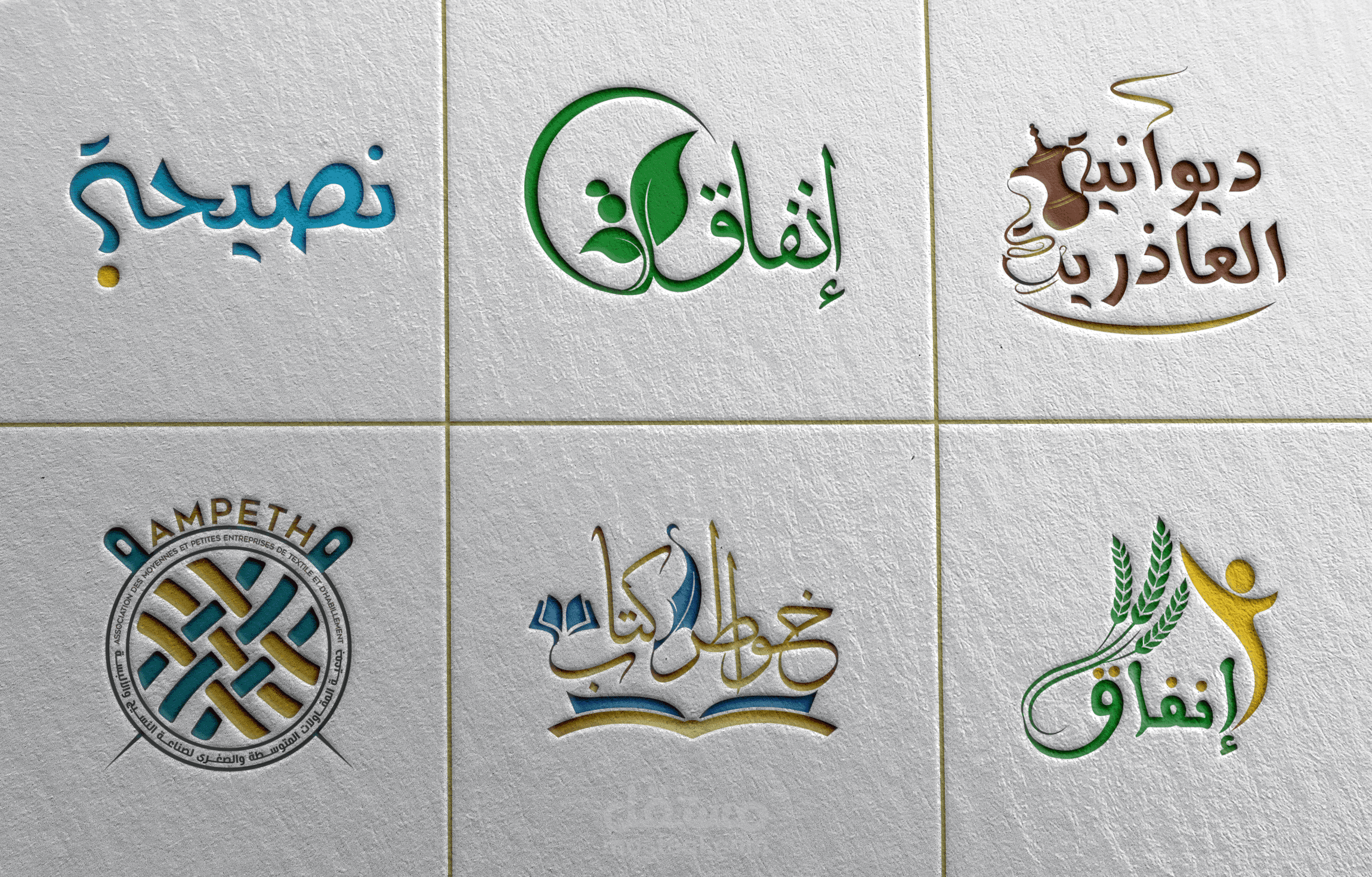 مجموعة من تصاميم الشعارات الإبداعية باللغتين العربية والإنجليزية.