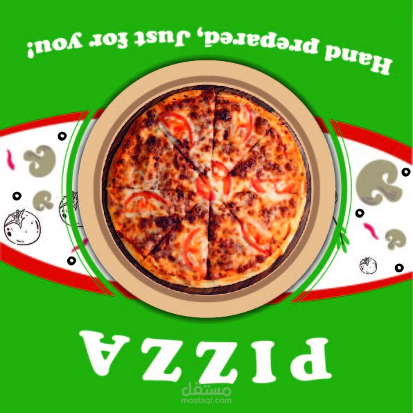 العمل عبارة عن تصميم علبة بيتزا بشكل جميل ثم وضعها على موكب يظهر جمال التصميم ودقته