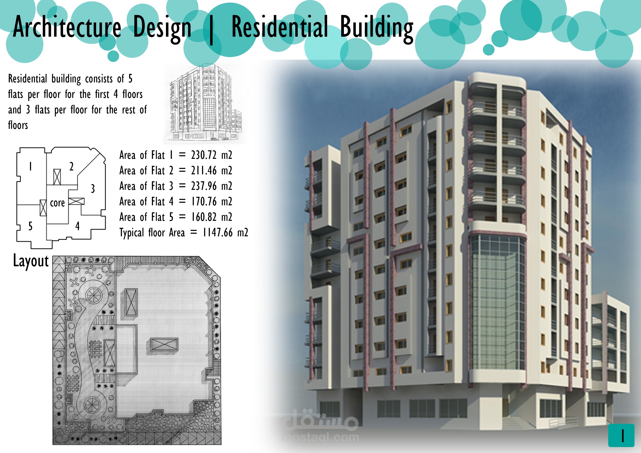 Residential Building consists of 5 flats per floor for the first 4 floors , and 3 flats per floor for the rest of floors.