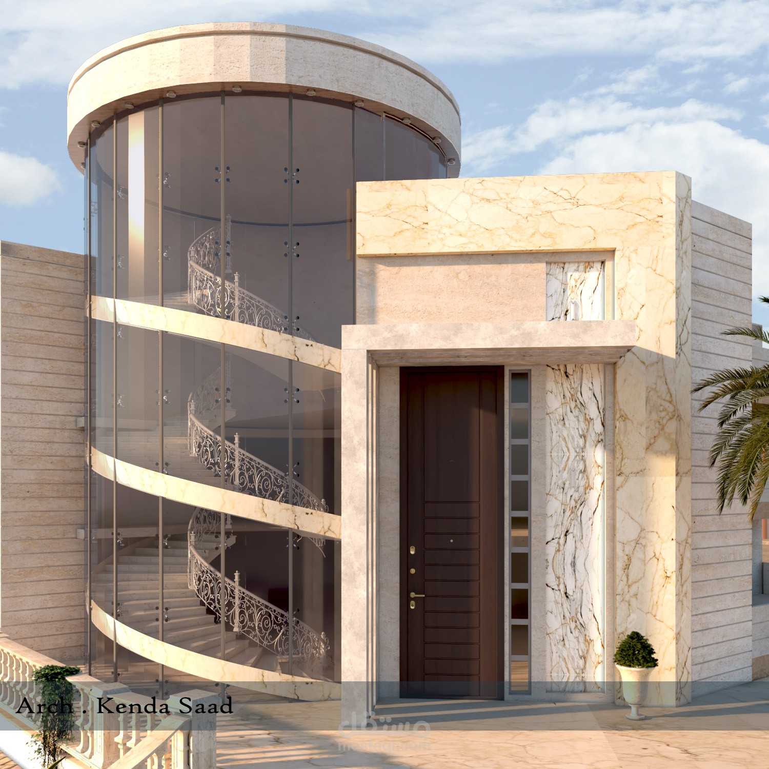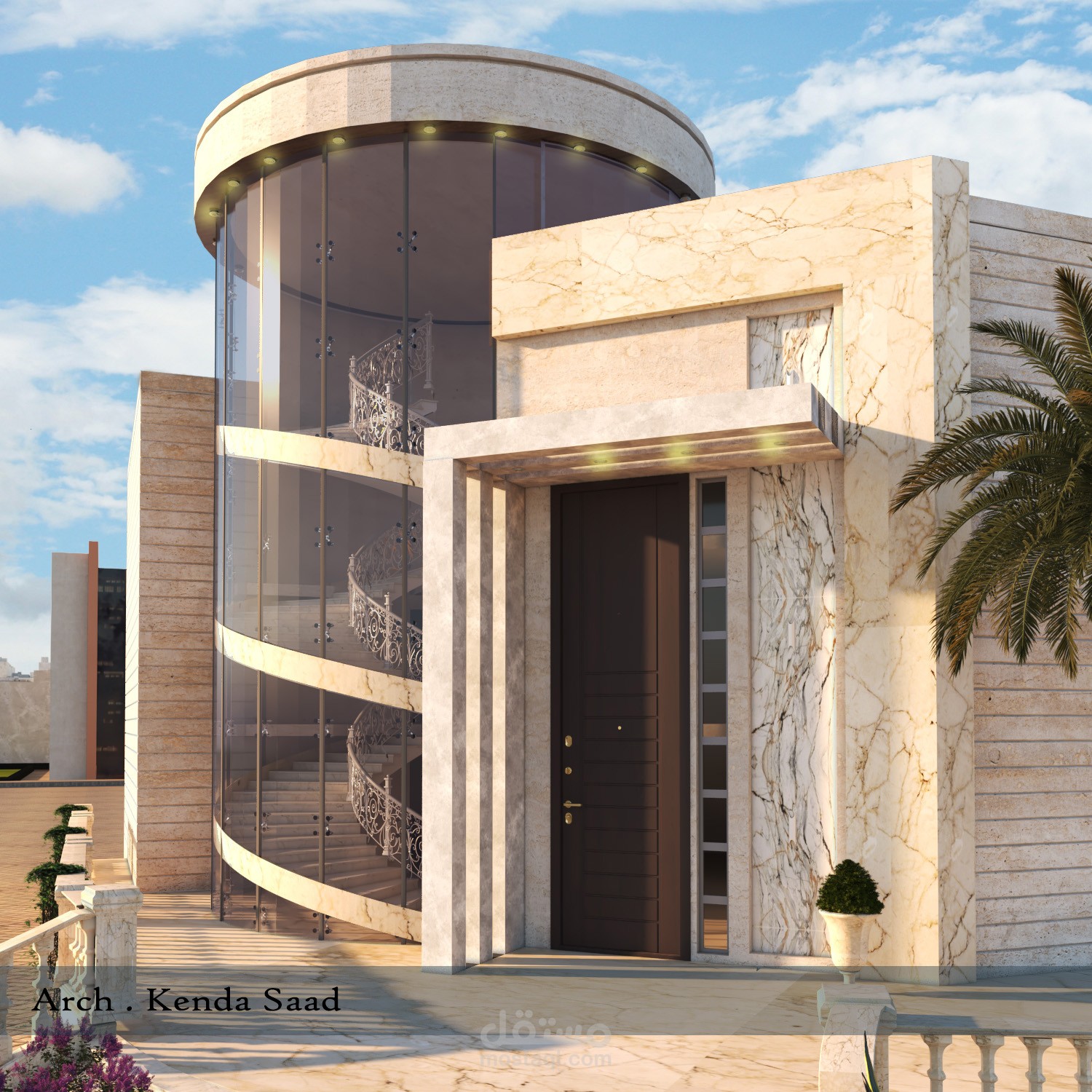 تصميم مدخل فيلا مع بيت درج دائري بنمط مودرن
