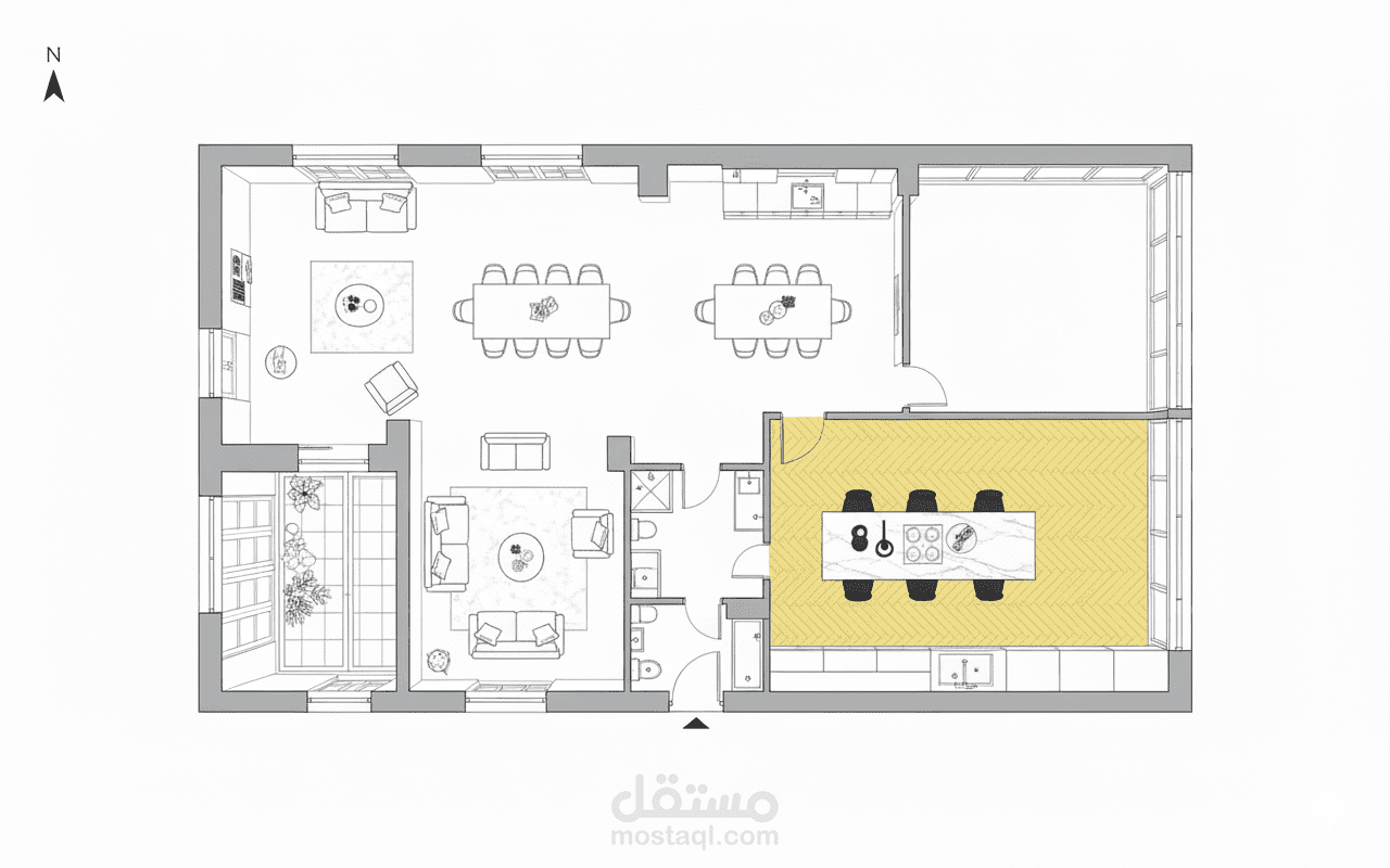 الجزيرة المركزية: تُعد الجزيرة هي النقطة المحورية في المطبخ، وتوفر مساحة عمل واسعة، ومساحة لتناول الطعام غير الرسمي بوجود 3 كراسي بار أنيقة.