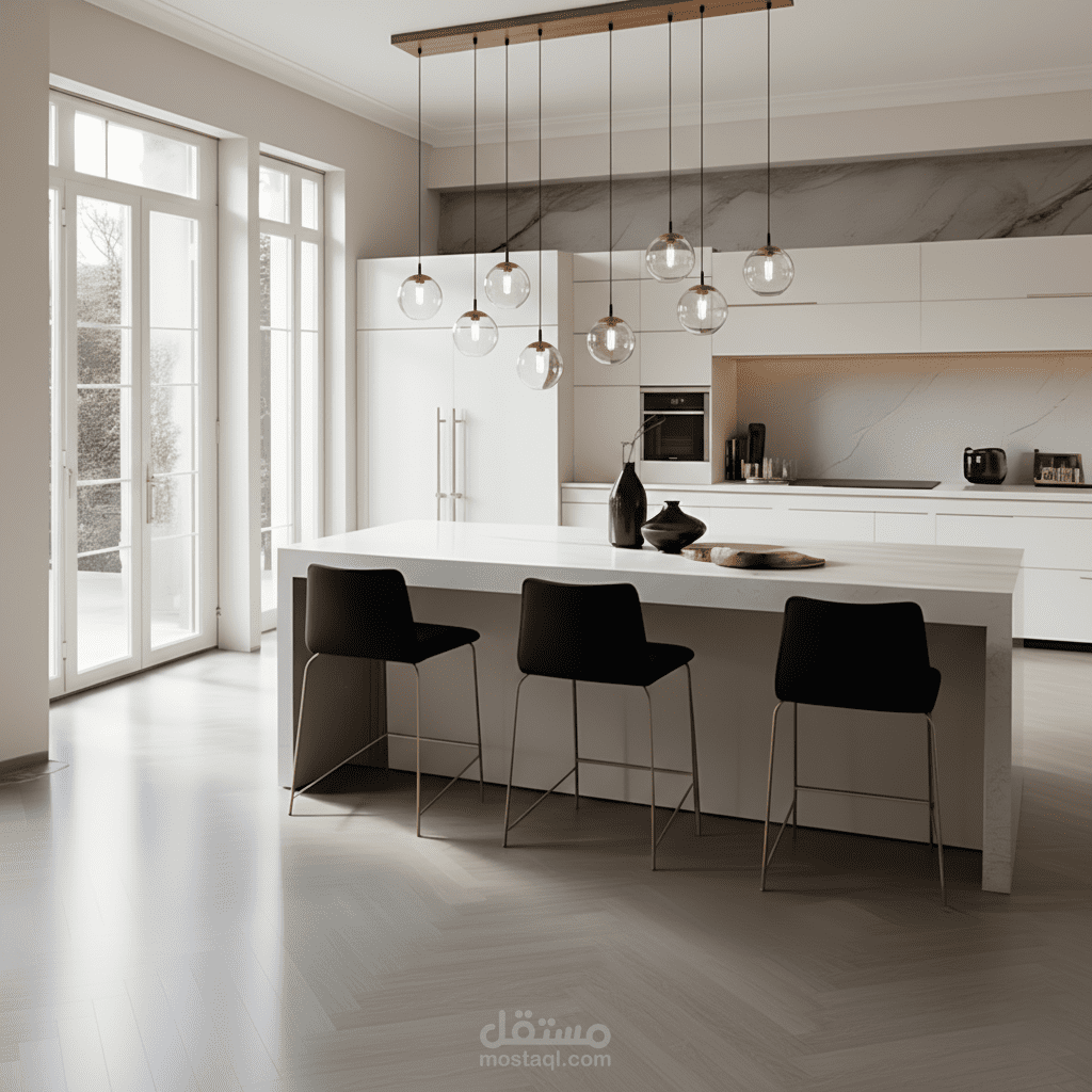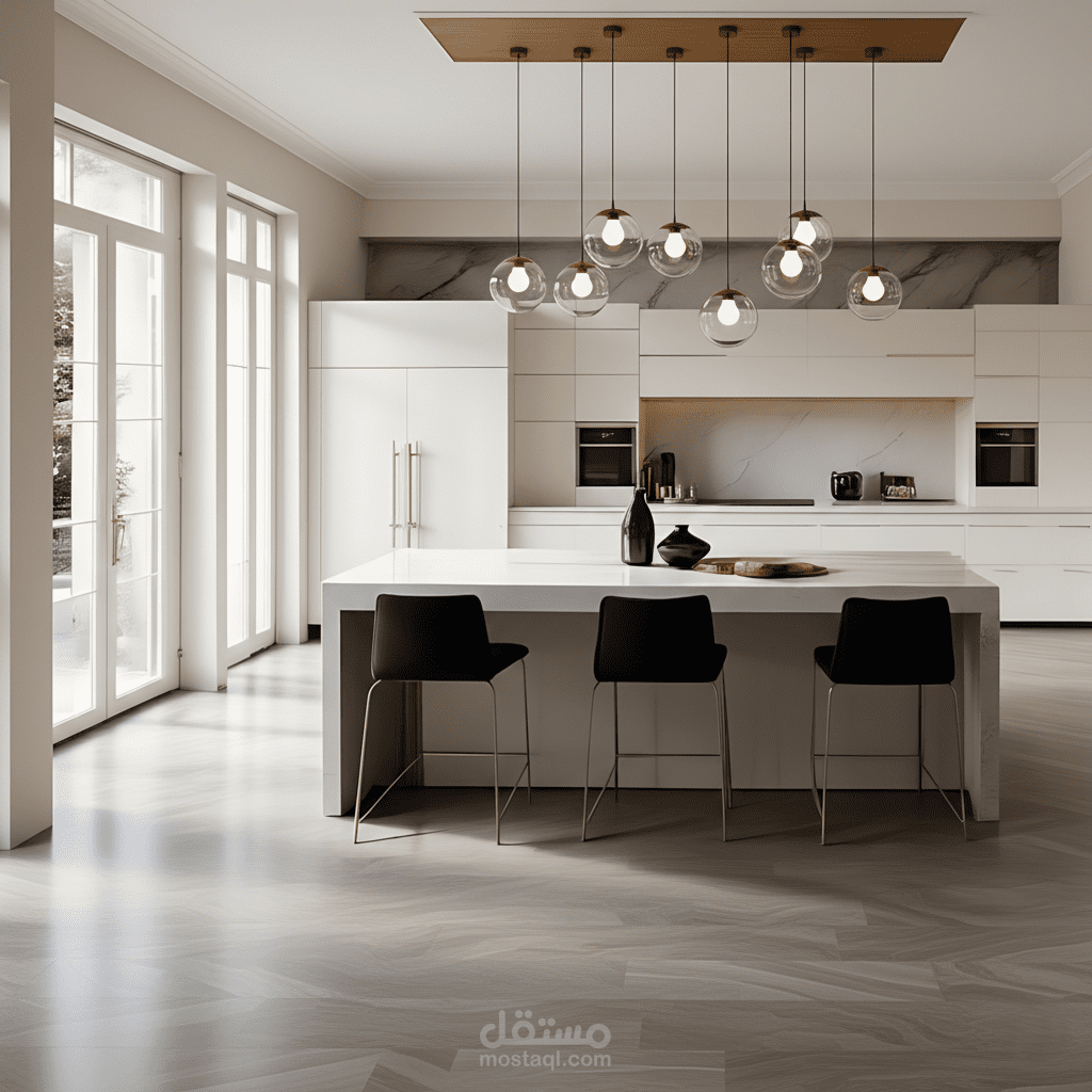 الإضاءة الطبيعية: يتميز المطبخ بنوافذ فرنسية كبيرة تسمح بدخول الكثير من الضوء الطبيعي، مما يُبرز بياض التصميم ويجعله أكثر حيوية.