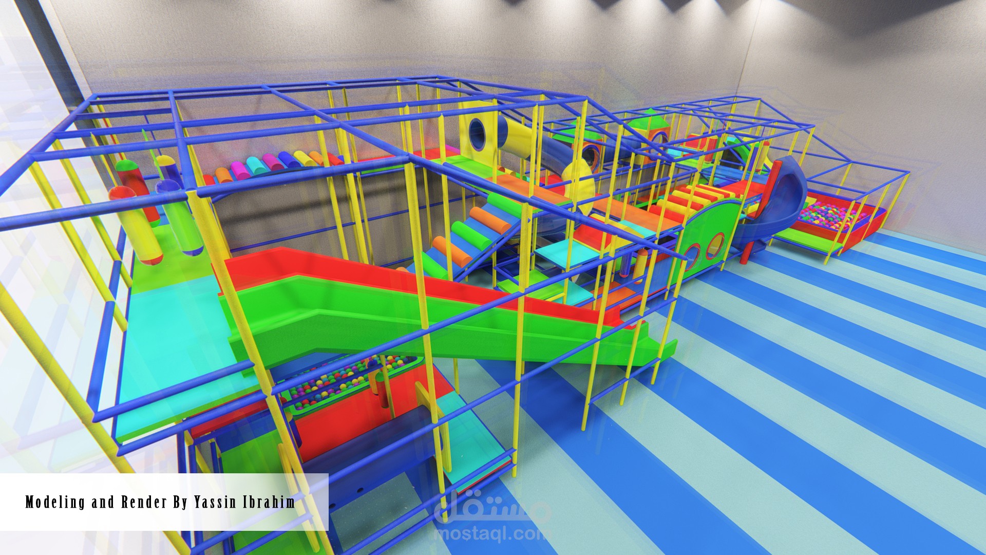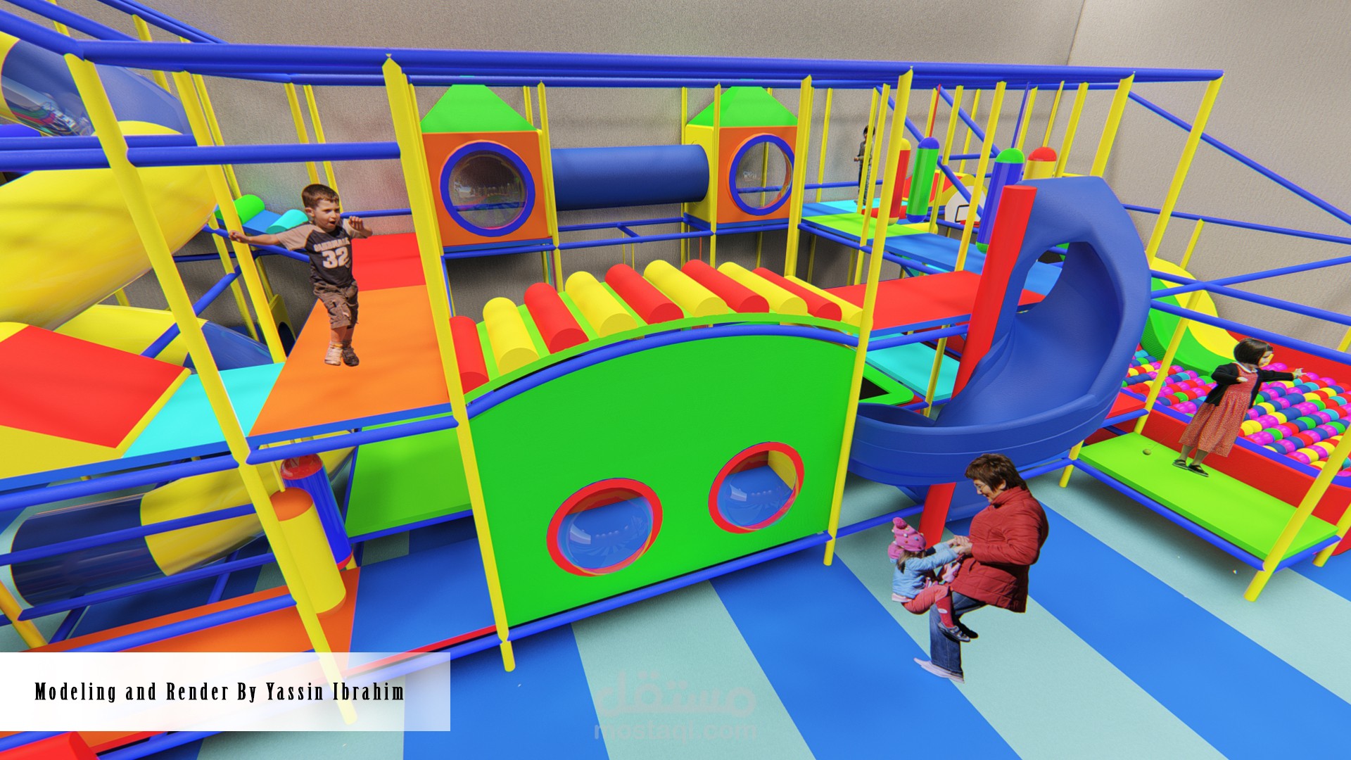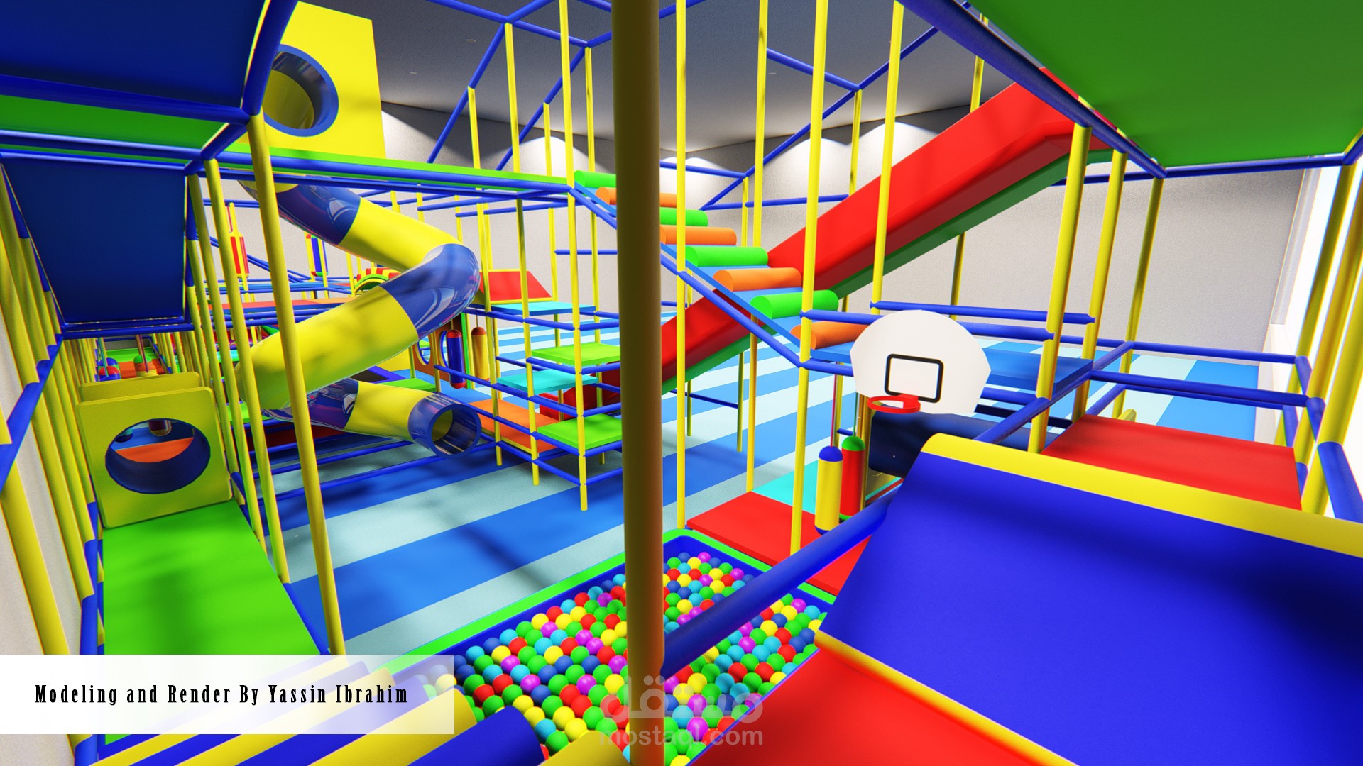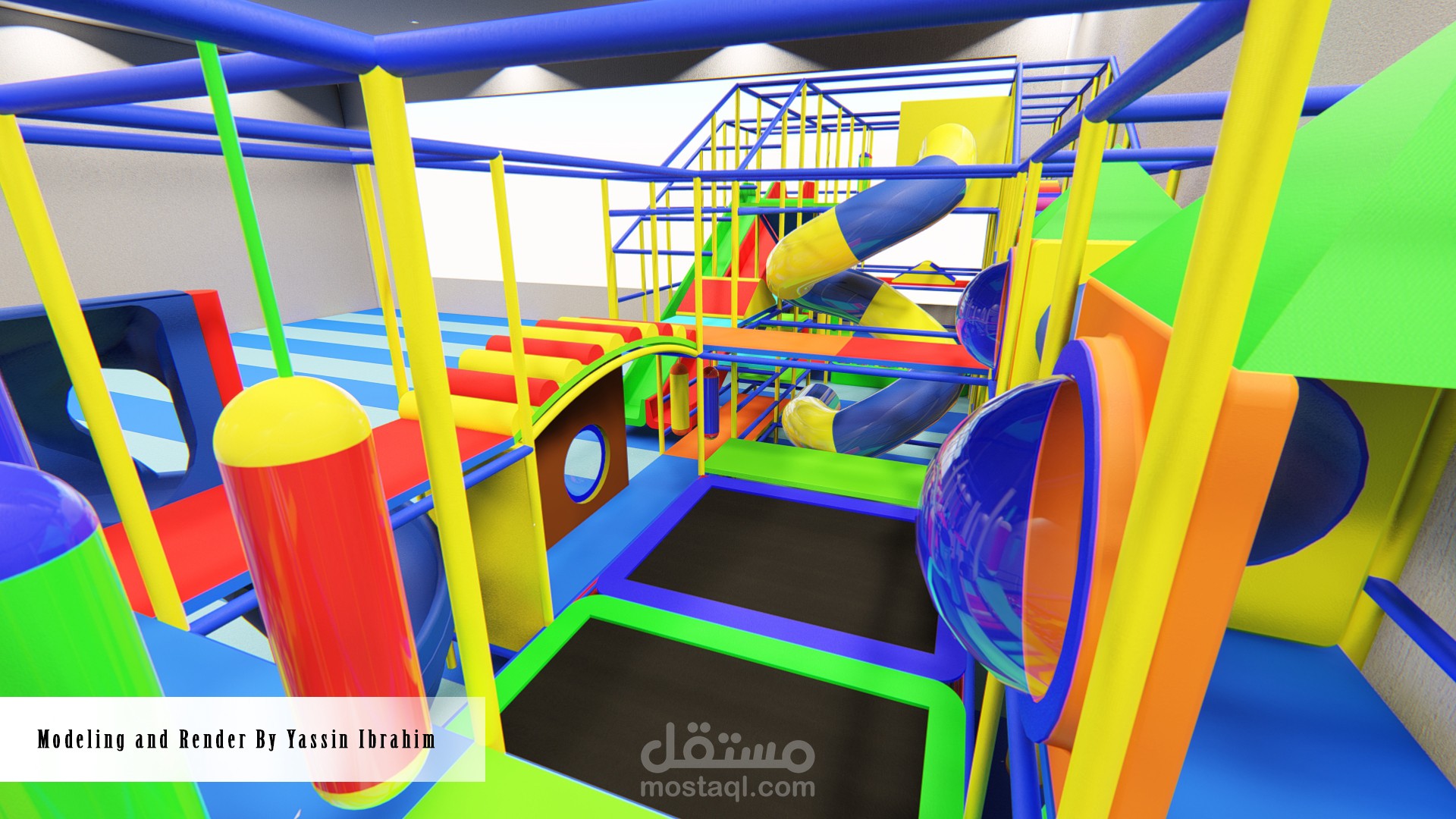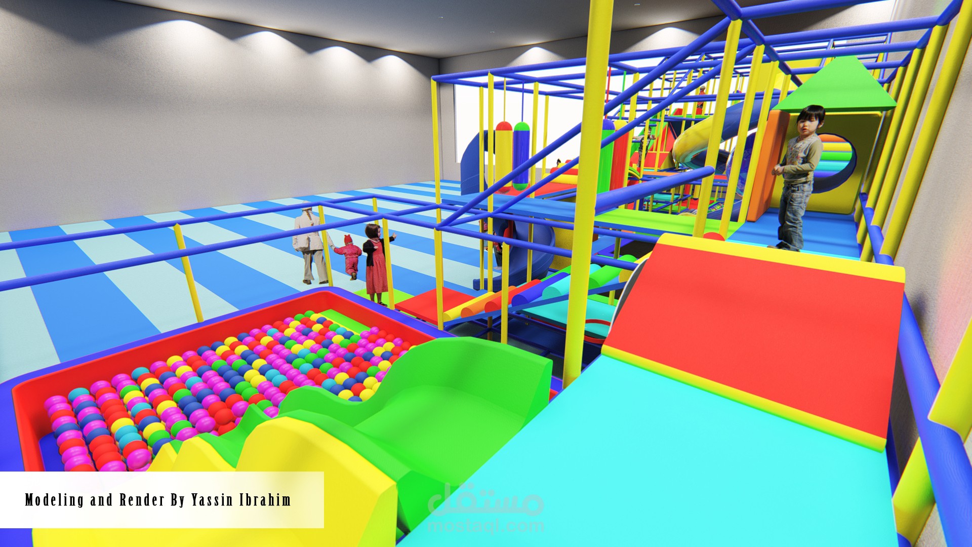 تصميم صالة ألعاب للأطفال (3_10 سنوات) وفق أسس تصميم معينة وأبعاد تناسب حركة الأطفال مع توفير عامل أمان عالي أثناء الحركة، التصميم يتألف من 4 فراغات تفاعلية توجد بها الألعاب الرئيسية الكبيرة ، وحولها تتوضع الممرات والرامبات وجدران التسلق التي تربط جميع الفراغات السابقة ببعضها البعض وفق حركة تفاعلية مستمرة، بحيث لا يشعر الطفل بالملل أبداً لكثرة الألعاب والممرات مع مراعاة النسب الصحيحة والأبعاد الدقيقة التي تناسب حركة الطفل وتوفير الأمان له في جميع أجزاء الصالة.