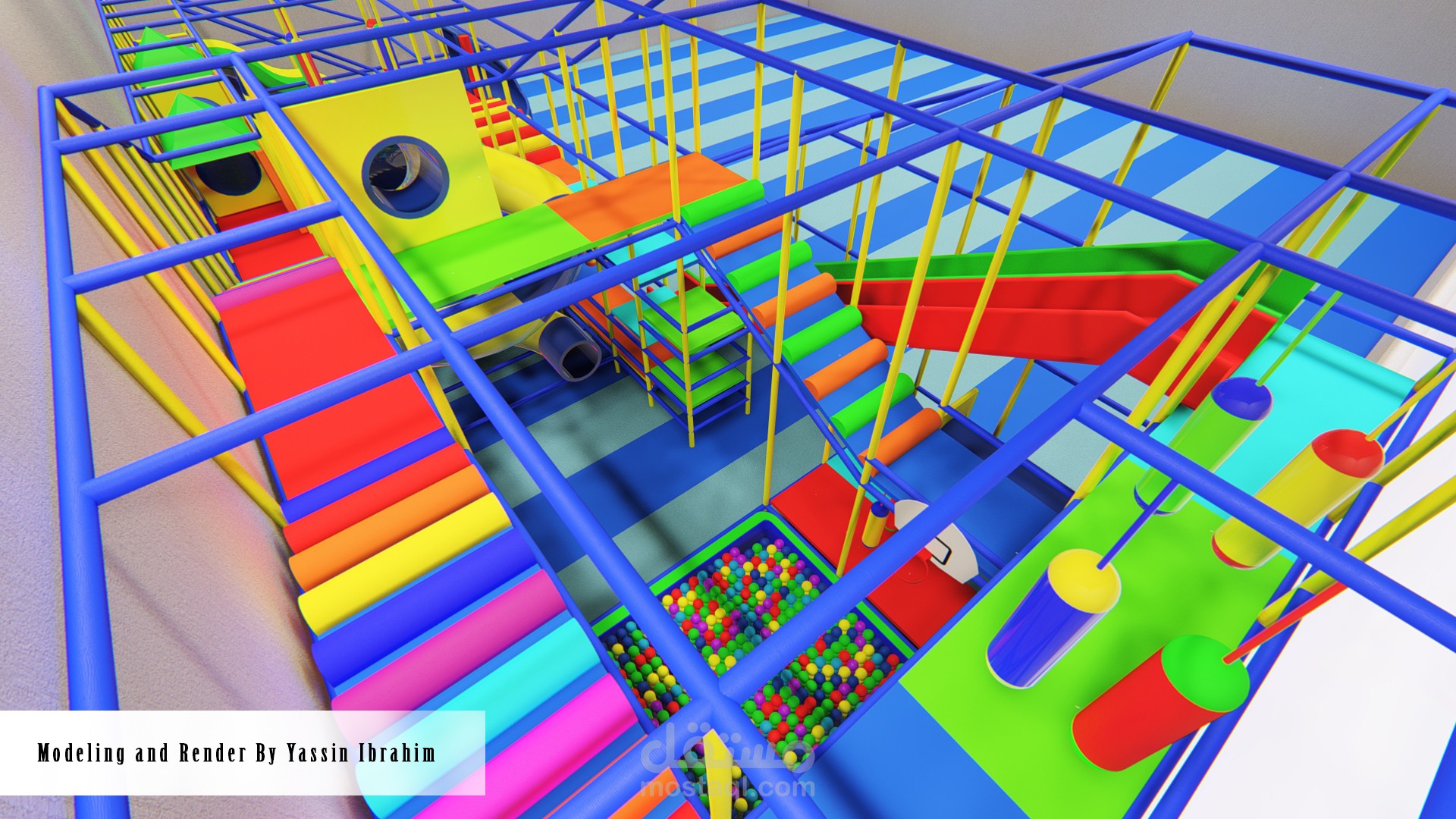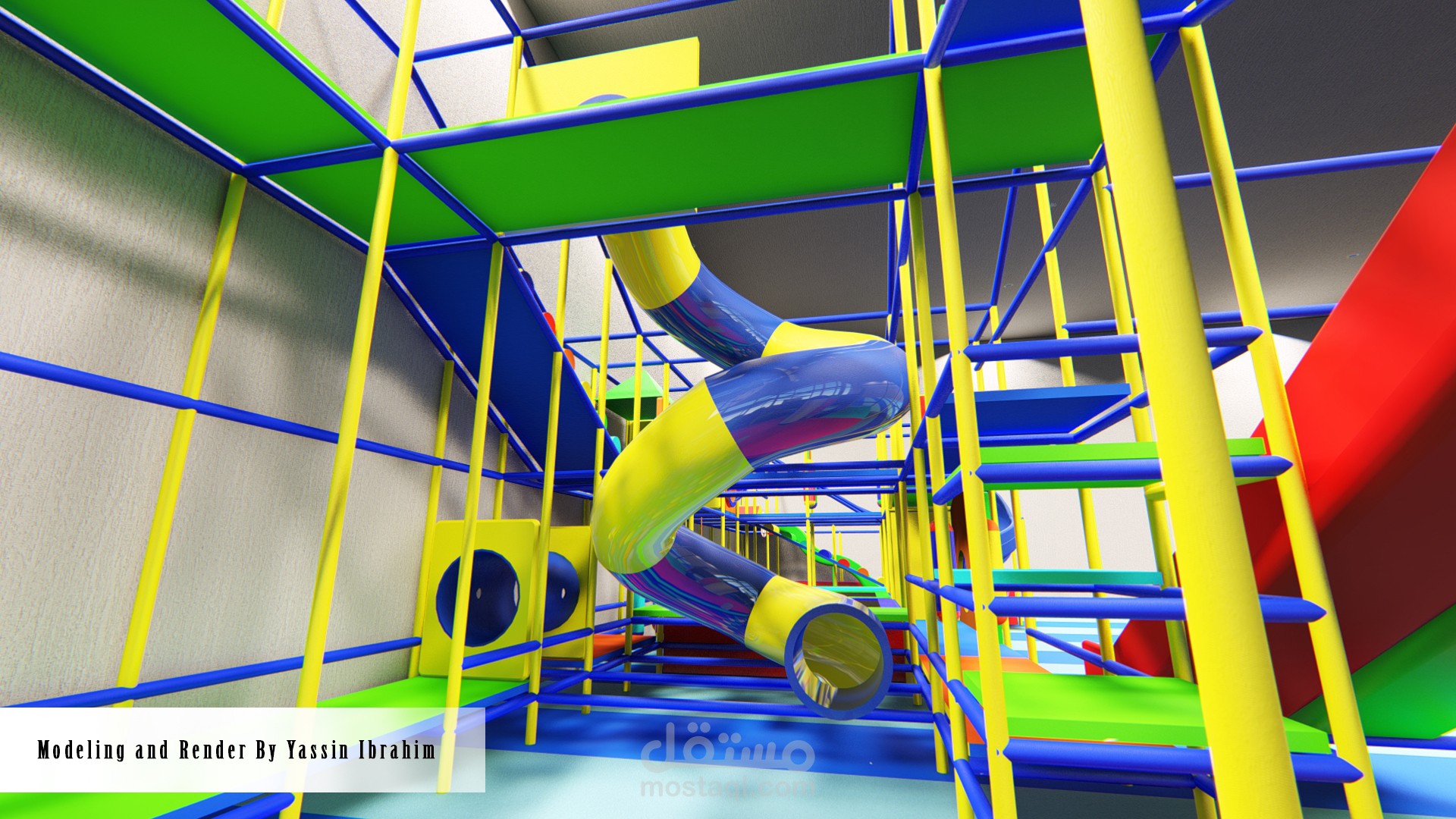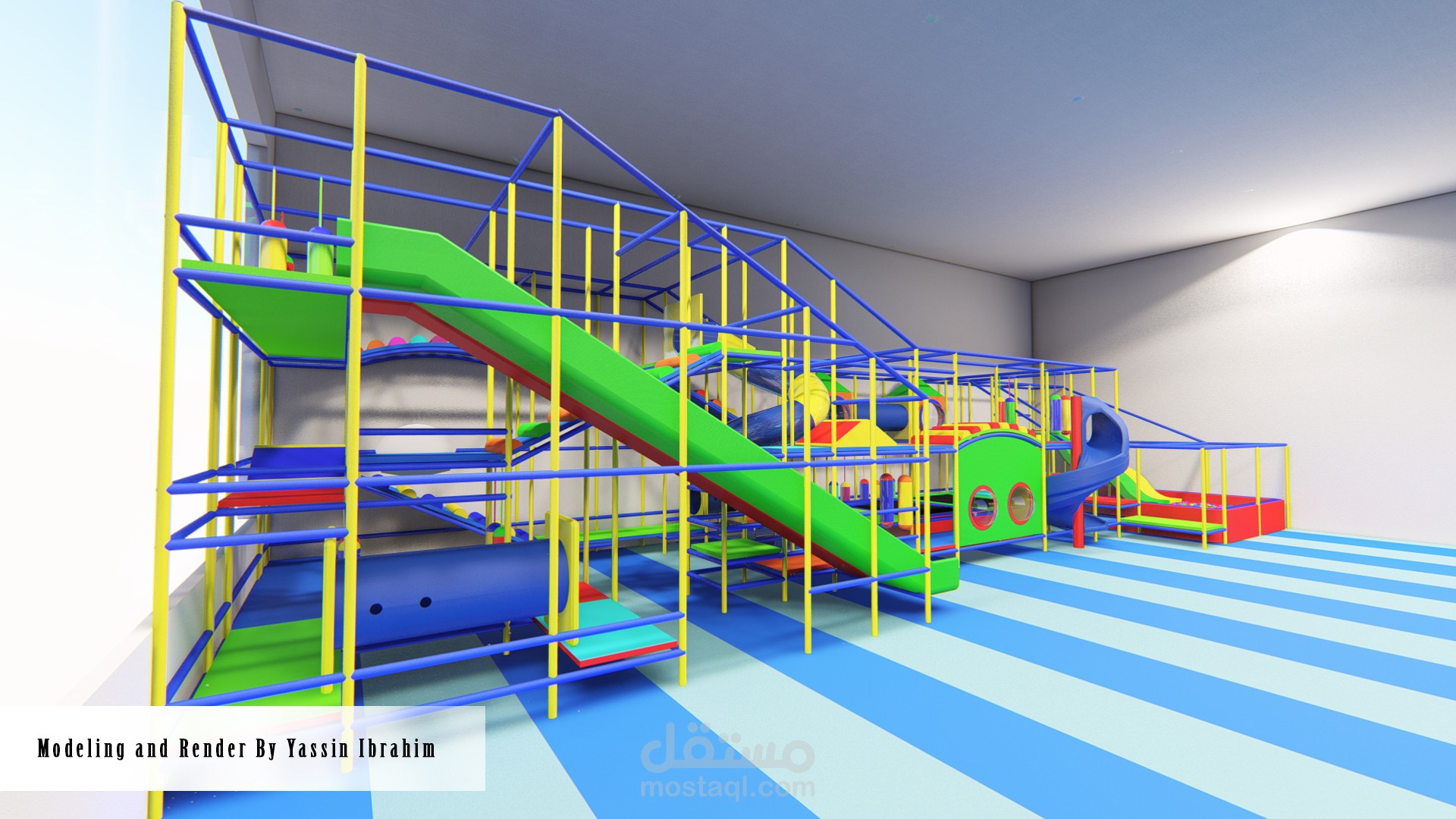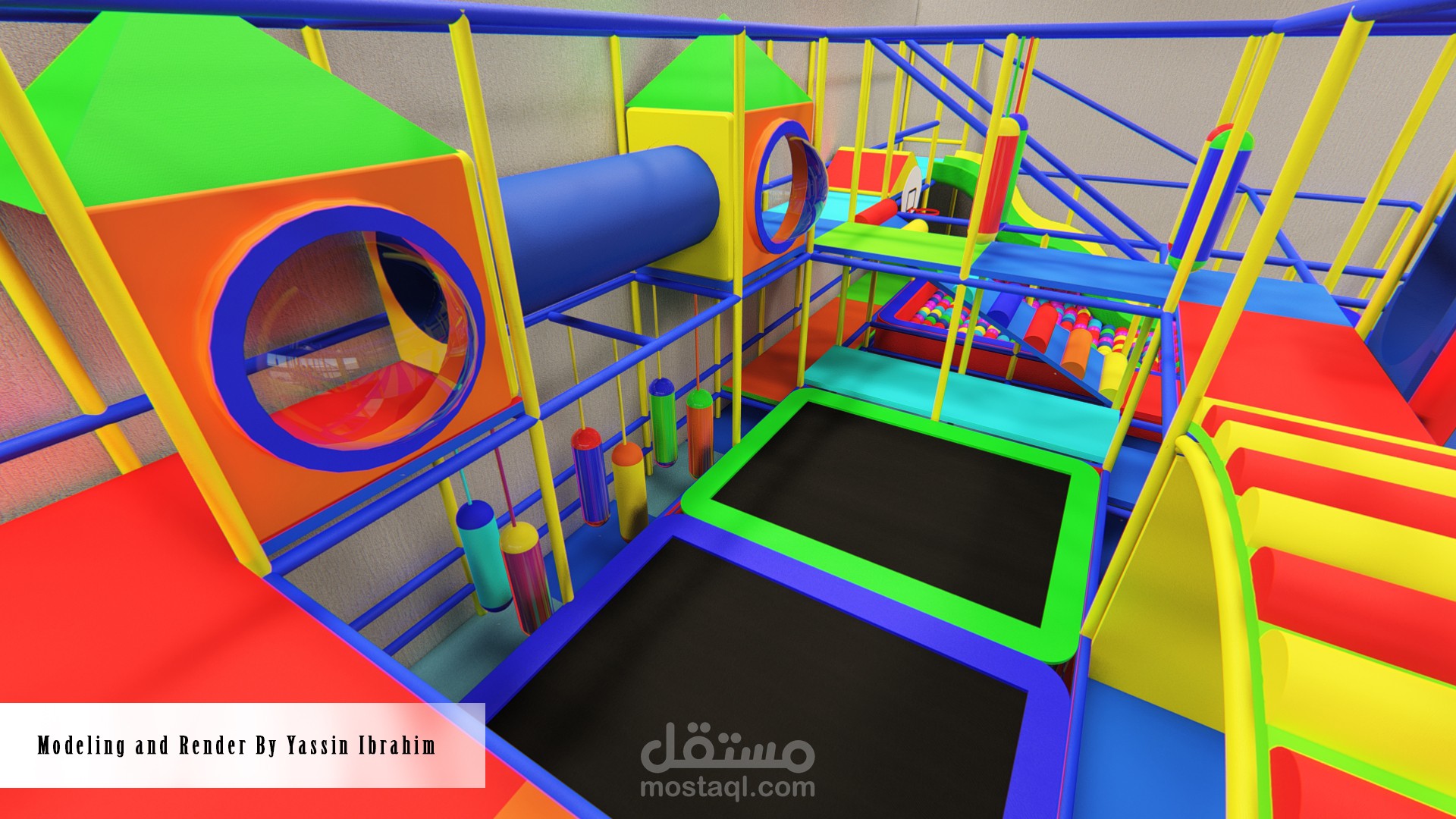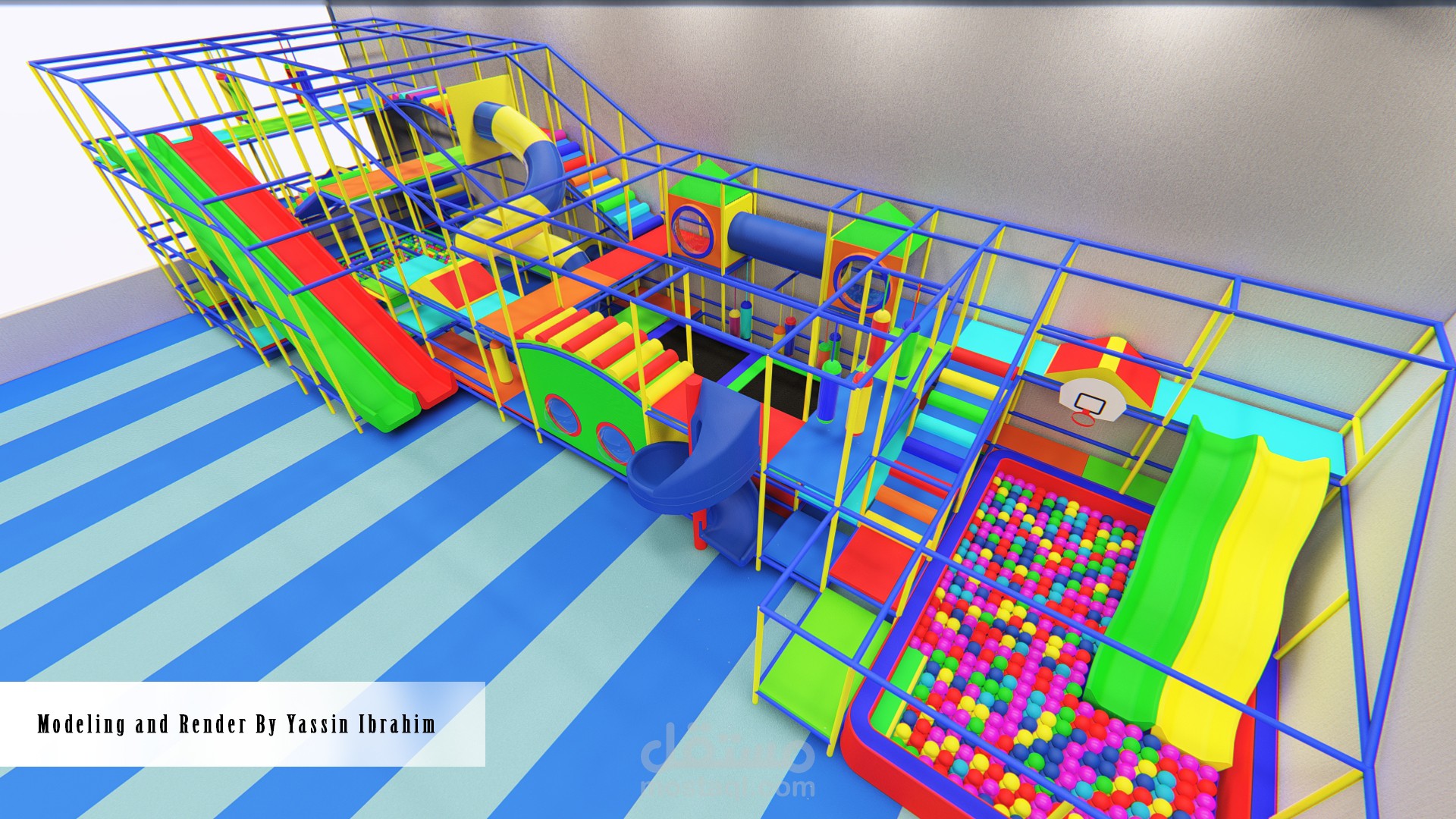 تصميم صالة ألعاب للأطفال (3_10 سنوات) وفق أسس تصميم معينة وأبعاد تناسب حركة الأطفال مع توفير عامل أمان عالي أثناء الحركة، التصميم يتألف من 4 فراغات تفاعلية توجد بها الألعاب الرئيسية الكبيرة ، وحولها تتوضع الممرات والرامبات وجدران التسلق التي تربط جميع الفراغات السابقة ببعضها البعض وفق حركة تفاعلية مستمرة، بحيث لا يشعر الطفل بالملل أبداً لكثرة الألعاب والممرات مع مراعاة النسب الصحيحة والأبعاد الدقيقة التي تناسب حركة الطفل وتوفير الأمان له في جميع أجزاء الصالة.