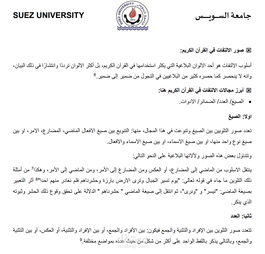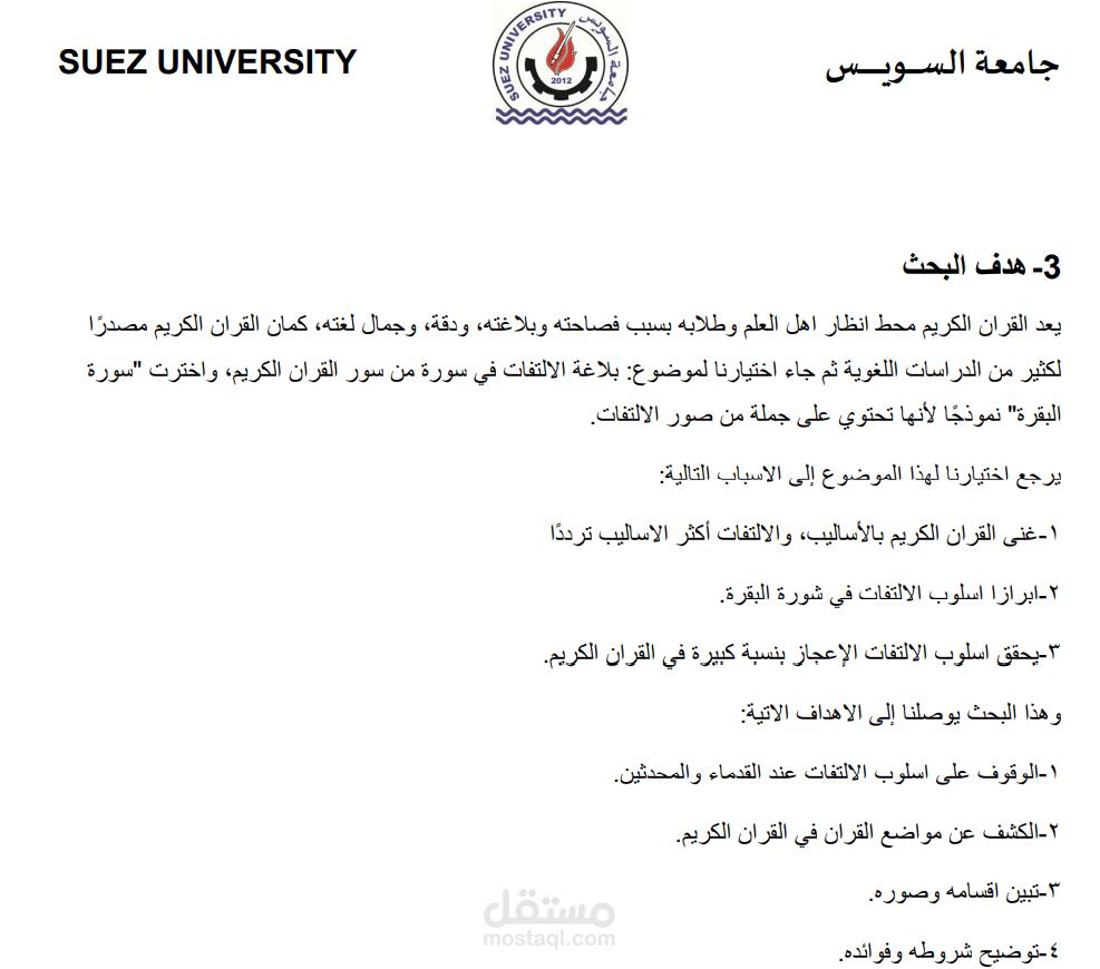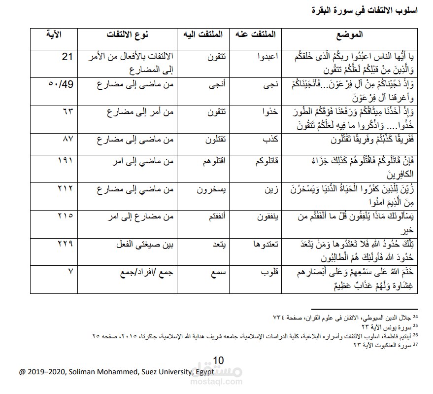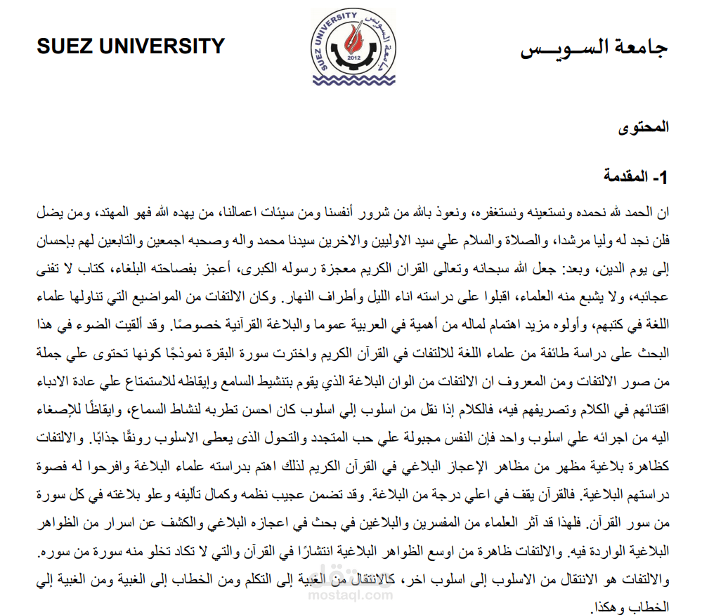 هذا نموذج لبحث اكاديمى مصغر فى مجال البلاغة باللغة العربية يتناول هذا البحث بلاغة الالتفات في سورة من سور القرآن الكريم ألا وهى سورة البقرة، يستهدف هذا البحث اسلوب الالتفات وشروطه وفوائده وتعريفه في اللغة والاصطلاح. ويشمل أيضا صور الالتفات و أنواعه الأربعة (الأفعال/ العدد/ الضمائر/ المعجم).