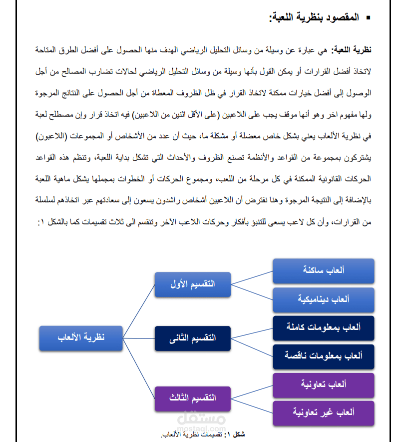 هذا نموذج لورقة علمية اكاديمية باللغة العربية عن نظرية اللعبة "Game Theory" وكيفية تطبيقها والاستفادة منها في البنوك حيث تتناول هذه الورقة تعريف نظرية اللعبة ومفهومها وكيف نشأت وتطورت على مدار 100 عام، بالاضافة الى التحدث عن اهمية هذه النظرية واستخداماتها فى العديد من المجالات مثل مجال علوم الحاسب وعلم الاجتماع، والسياسة، والاقتصاد، والعلوم العسكرية وغيرها الكثير، كما تتناول أيضًا الحديث عن مفهوم إدارة علاقات العملاء CRM ونشأته وأنواعه الاستراتيجية والتشغيلية والتحليلية، كما يحتوى على أمثلة توضيحية وأحدث طرق التنبؤ بإدارة علاقات العملاء ومقدمة ومراجع ايضا، والعديد من العناصر البحثية الأخرى التى استطيع تقديمها حسب الطلب...