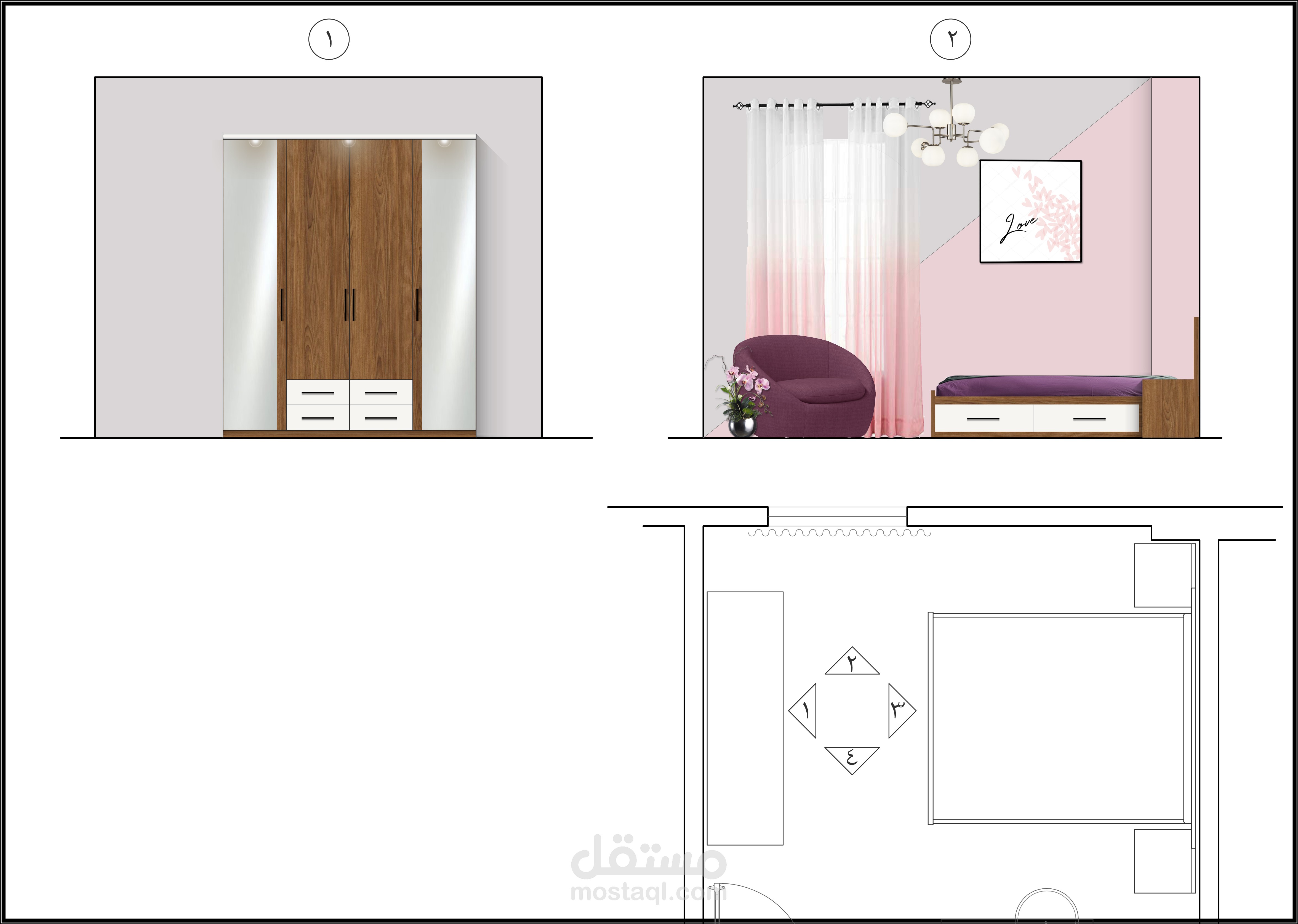 تصميم داخلى لغرفة بنت مع تصميم الاثاث الخاص بالغرفة