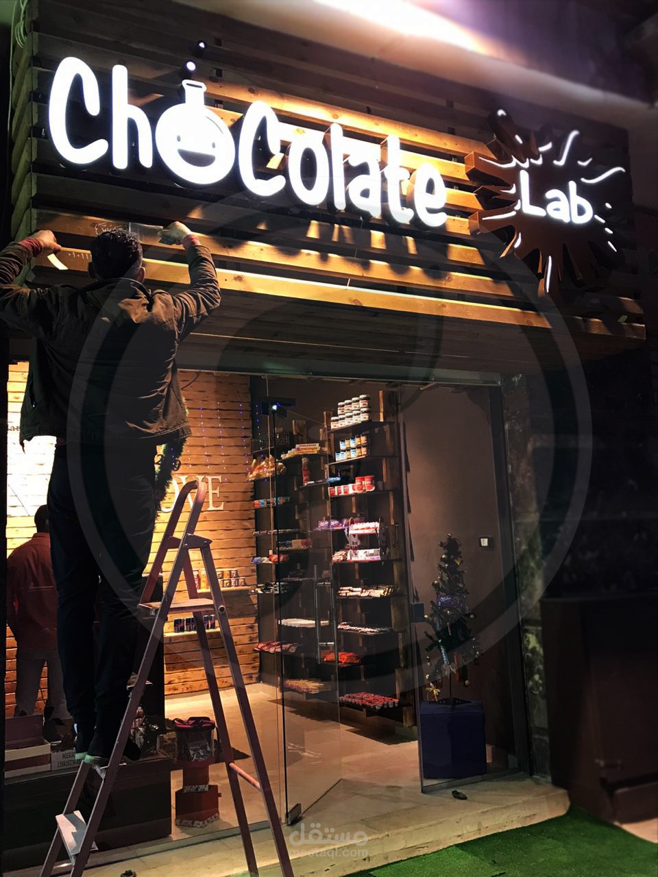 تصميم واجهة محل Chocolate Lap_وتنفيذه من خامتي الخشب المدهون أُستر ،وأحرف من الأكريليك