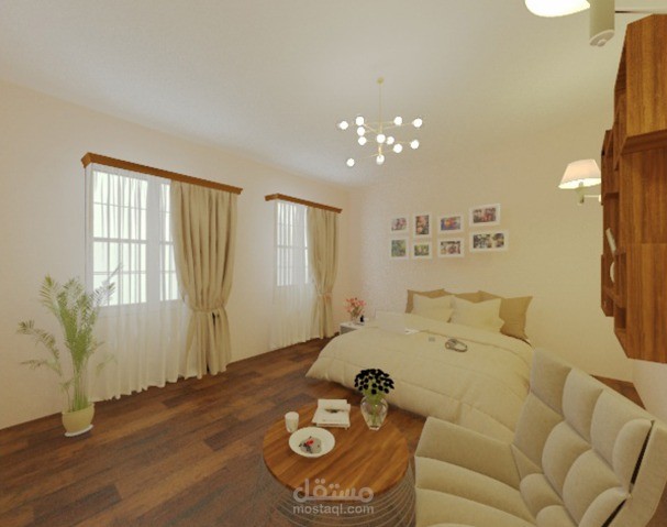 تصميم 3d لغرفة نوم مودرن بتوزيع الاضاءة بها و بمواد بناء متاحة بجميع الاسواق ارضيات hdf و دهان بلاستيك للحوائط