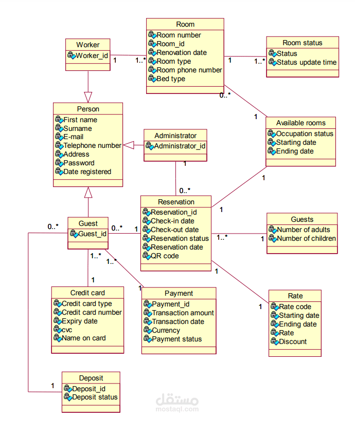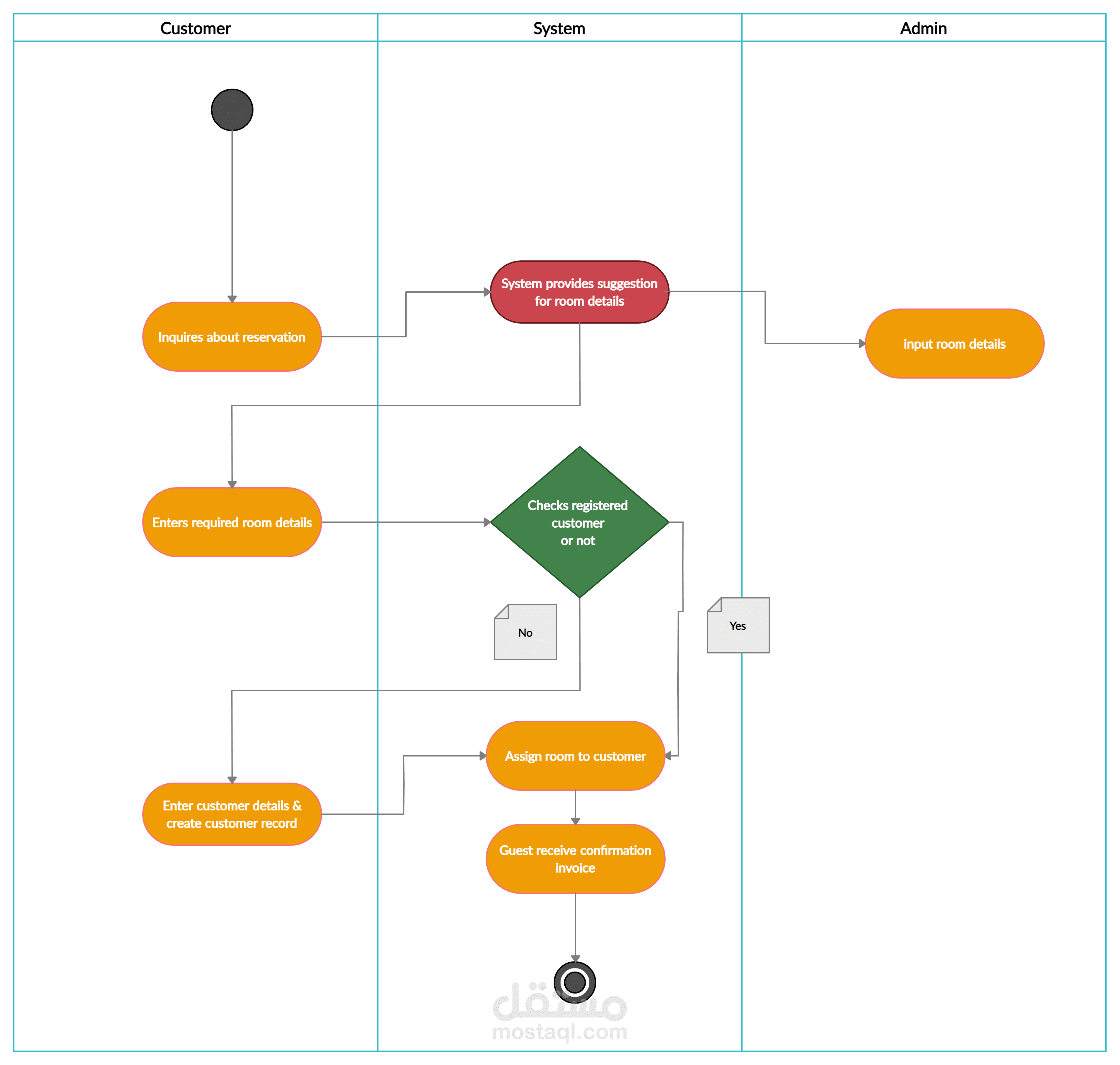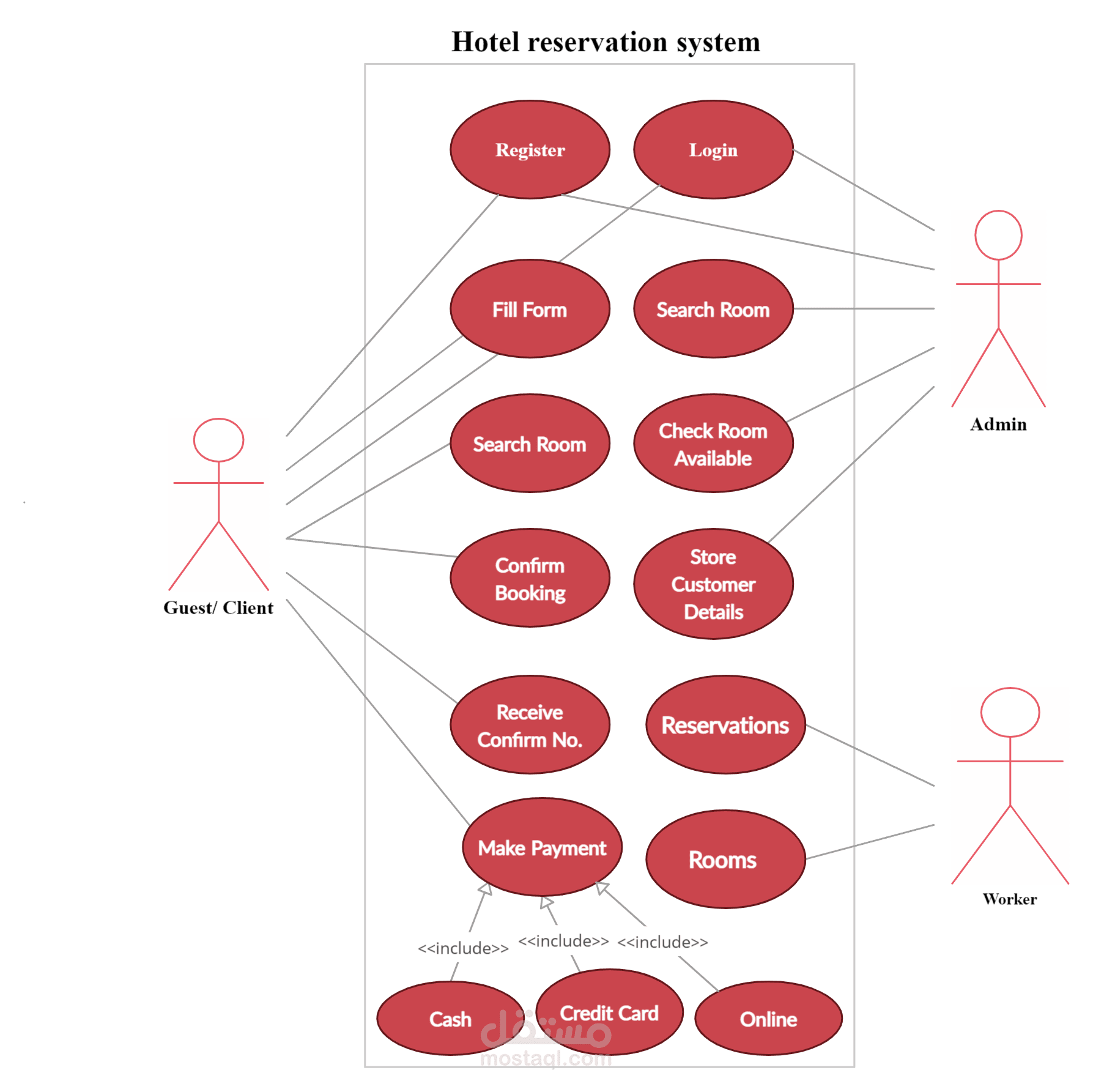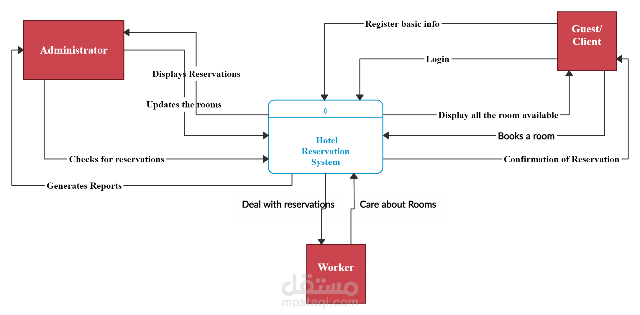 إنه نموذج تحليل (Analysis) لنظام حجز فنادق Hotel Reservation System الذي يسمح للزوار بحجز الغرف عن طريق الموقع الالكترونى الخاص بالشركة، لذلك ف قد قمت بتحليله باستخدام مخططات UML مثل ERD - DFD - Use Case Diagram - Class Diagram - Sequence Diagram (Register) - Sequence Diagram (Login) - Sequence Diagram (Reserve a room) - WBS - Activity Diagram