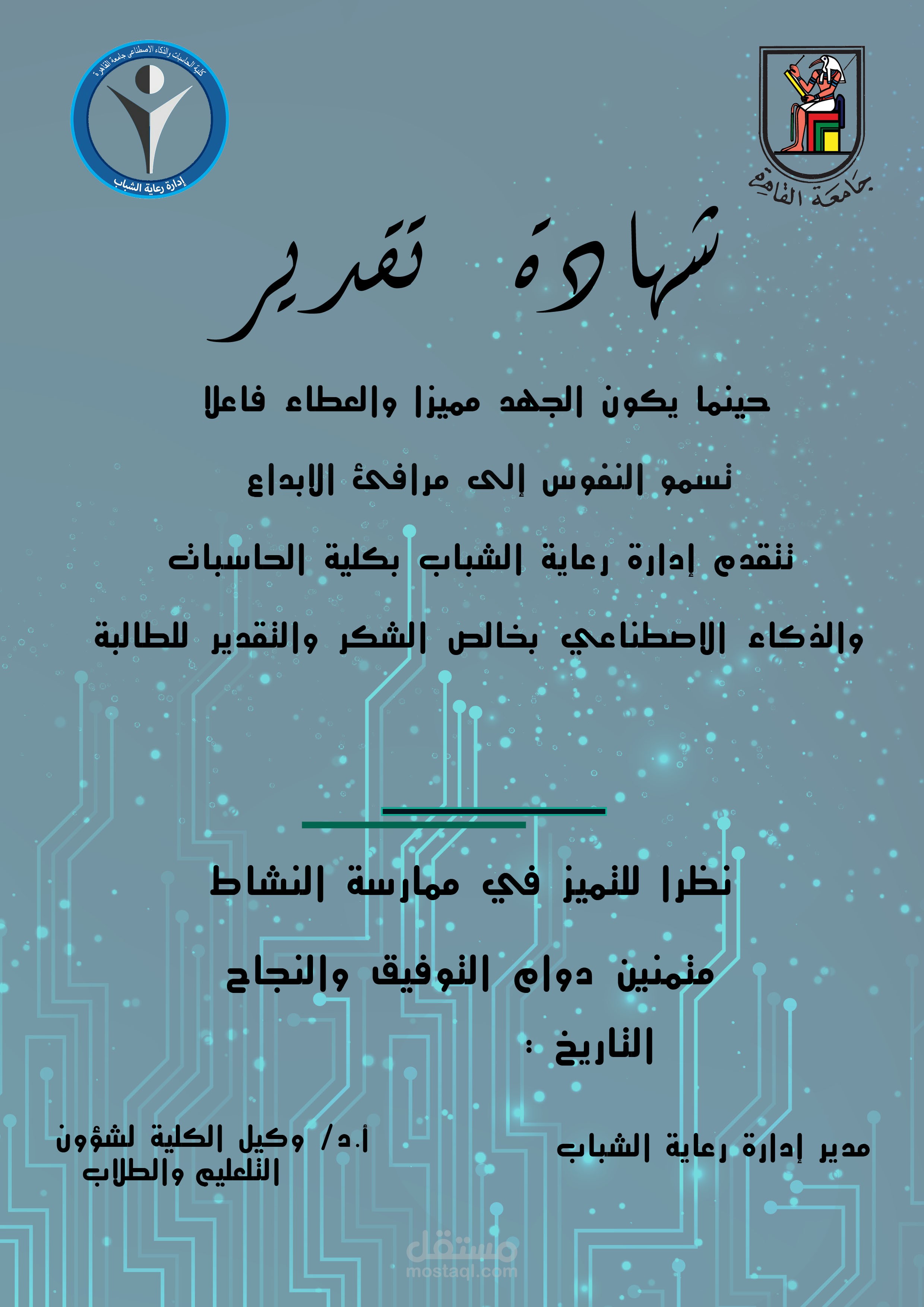شهادة تقدير لادارة رعاية الشباب بكلية الحاسبات والذكاء الاصطناعي بجامعة القاهرة
