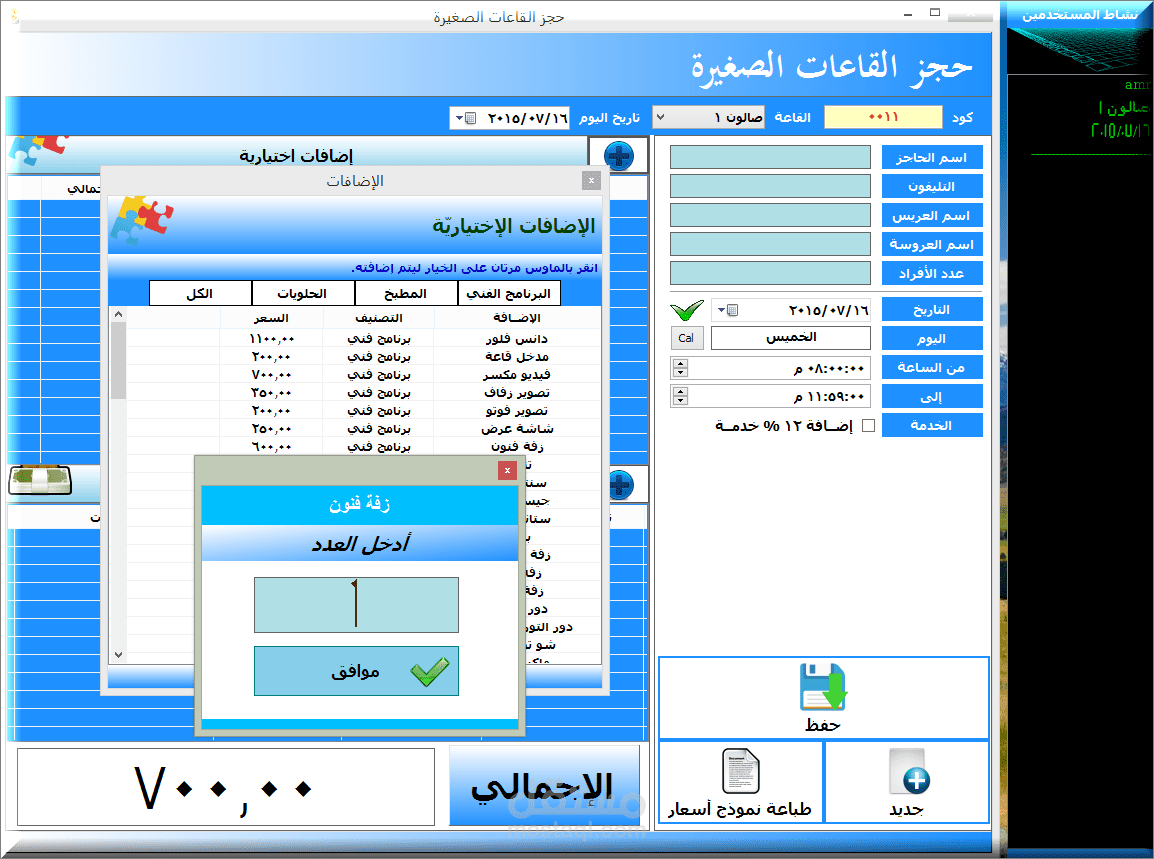 ■ إمكانية طباعة نموذج أسعار للقاعات الصغيرة.