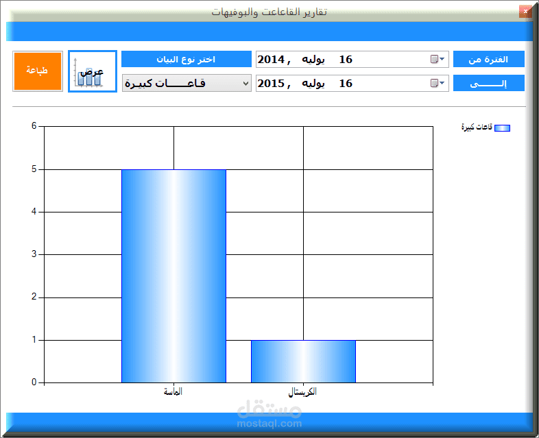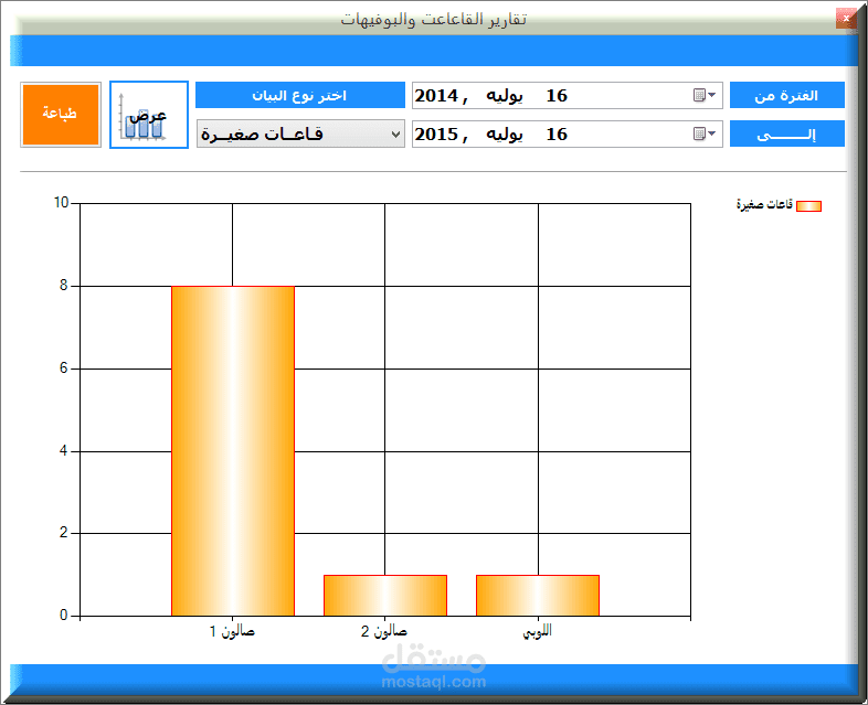 ■ إمكانية عرض تقرير بأكثر القاعات حجزا الكبيرة والصغيرة وأيضا البوفيهات.