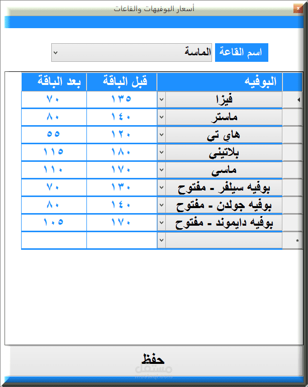 ■ إمكانية تعيين أسعار كل بوفيه مع كل قاعة قبل وبعد الباقة.