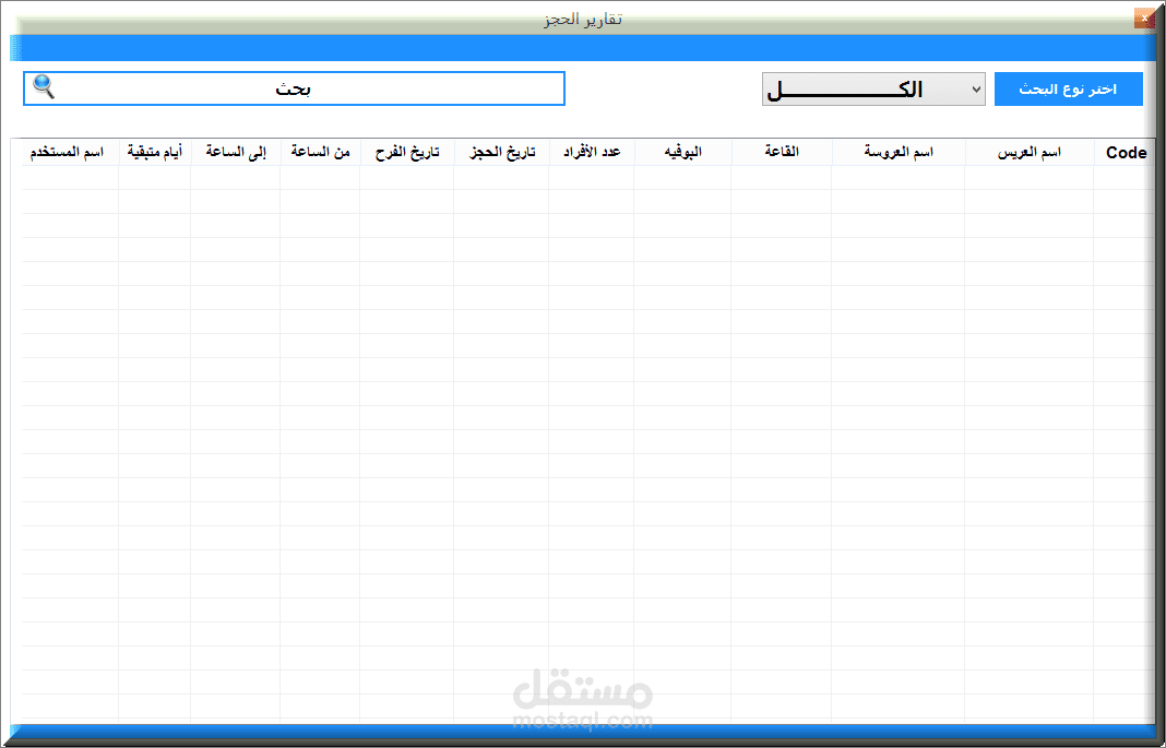 ■ إمكانية الحصول على تقرير بكل أوقات الحجز مع امكانية البحث بالكود وتاريخ الحجز وتاريخ الفرح وعرض عدد الأيام المتبقية لكل فرح.