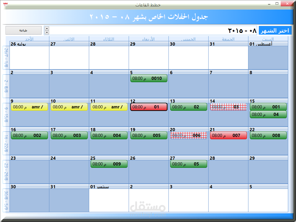 ■ عرض جدول منظم مجسم وملون يحتوى على مواعيد القاعات شهريّا.