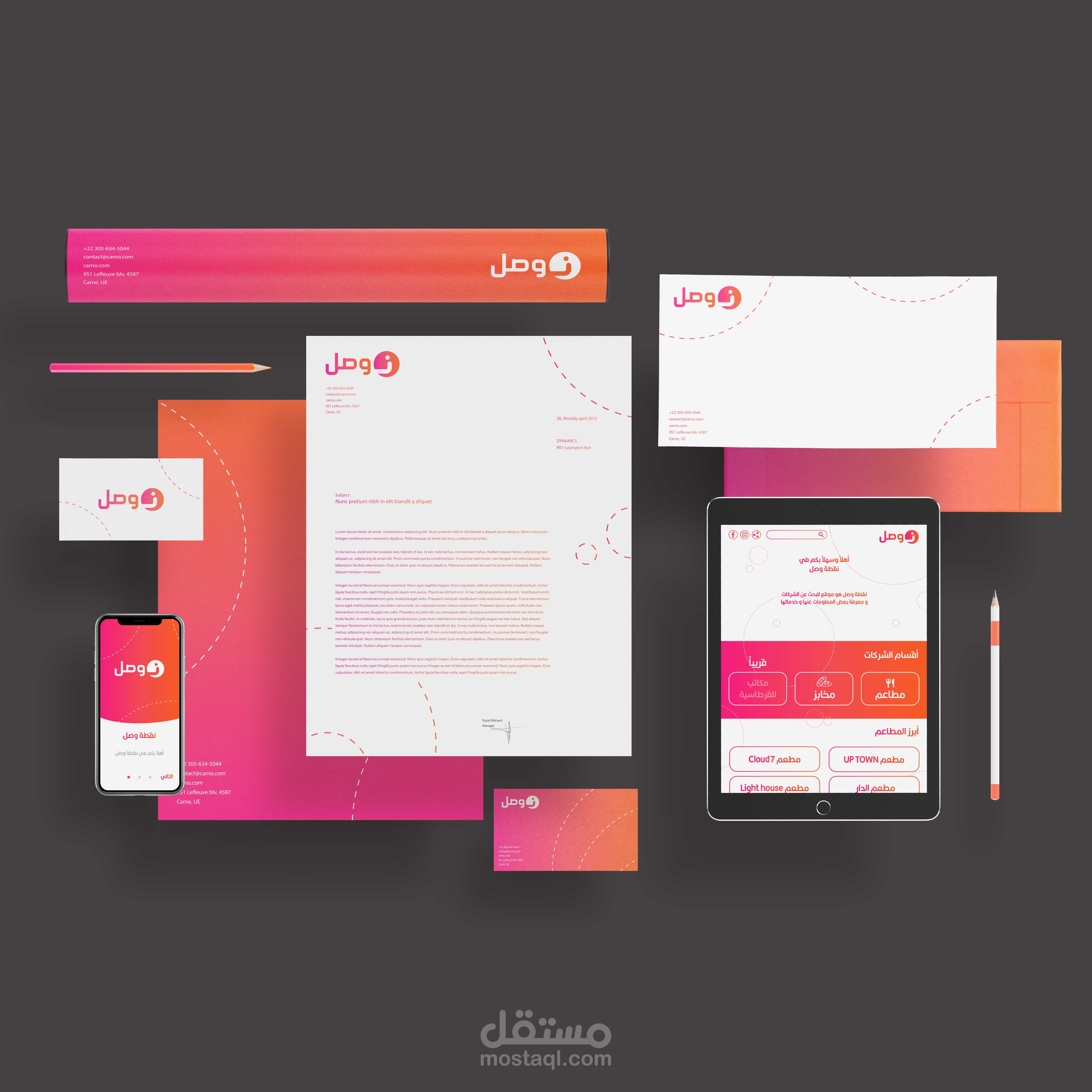Logo design and visual identity for Noctat Wasl .It is a website and application to search for commercial enterprises, restaurants, and stores, to know some information about them, and a simple explanation about their services and how to communicate with them.