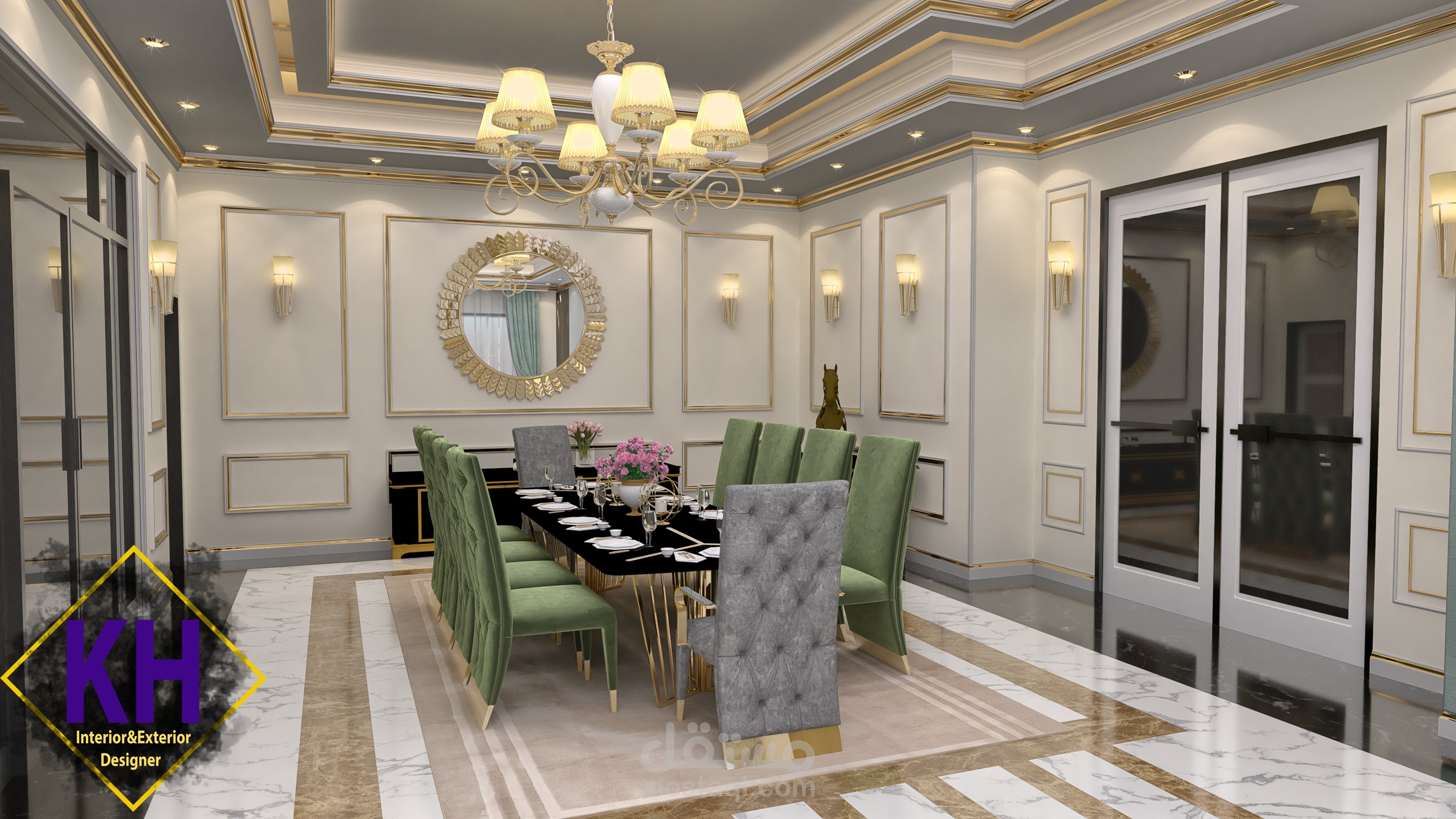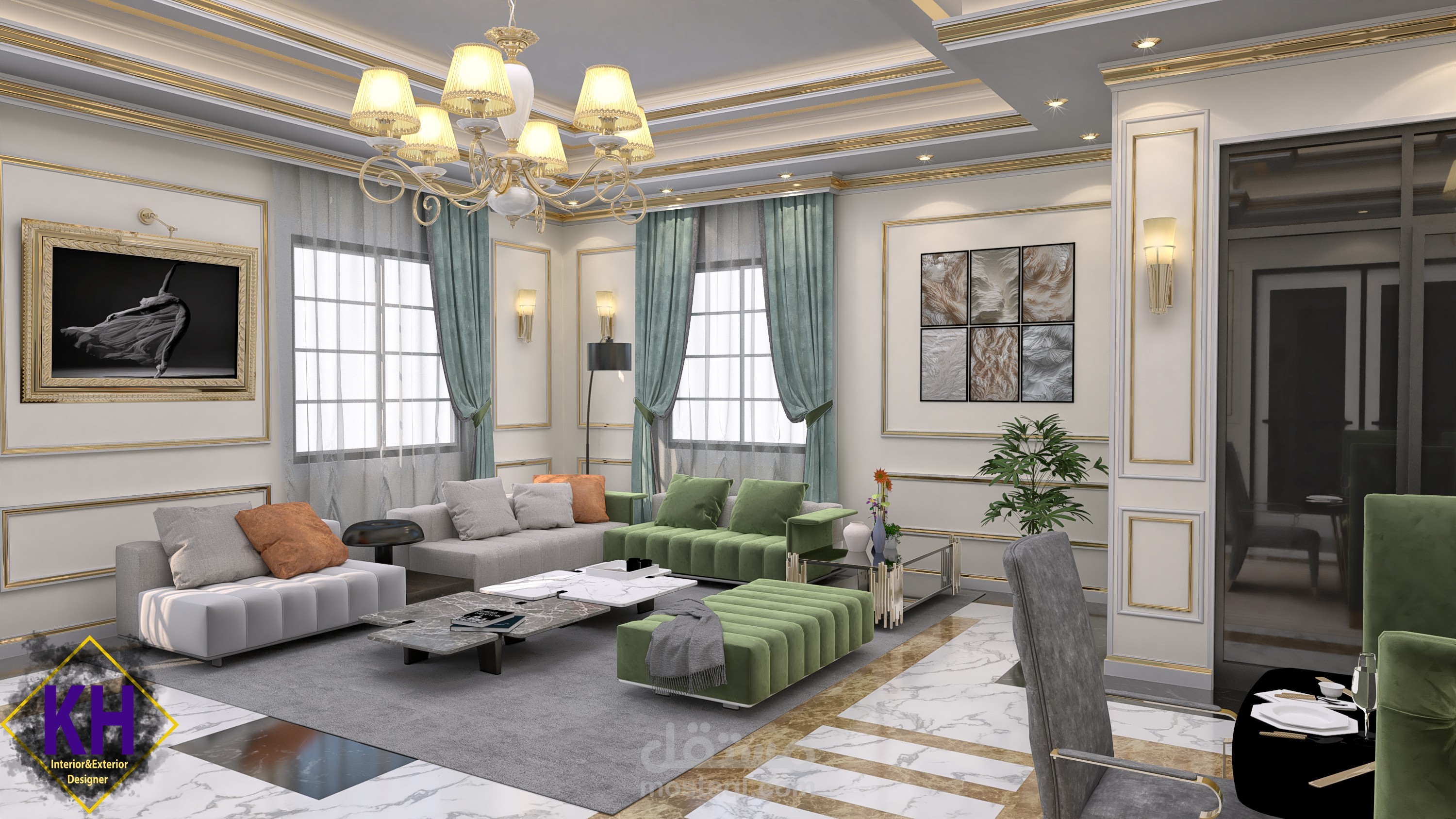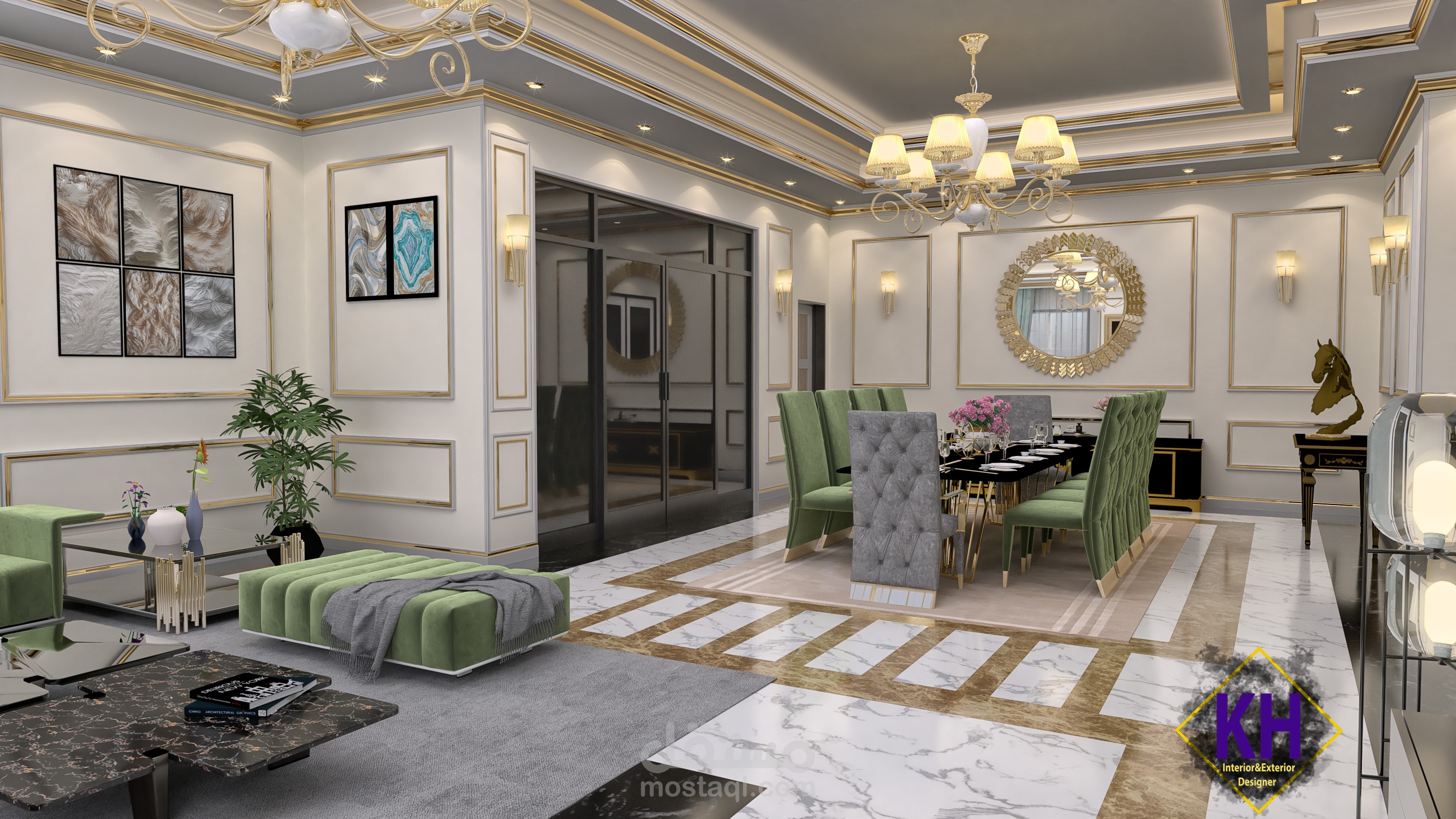 تصميم نيو كلاسيك لصالة تم عملها كمعيشة و غرفة طعام و استقبال للضيوف